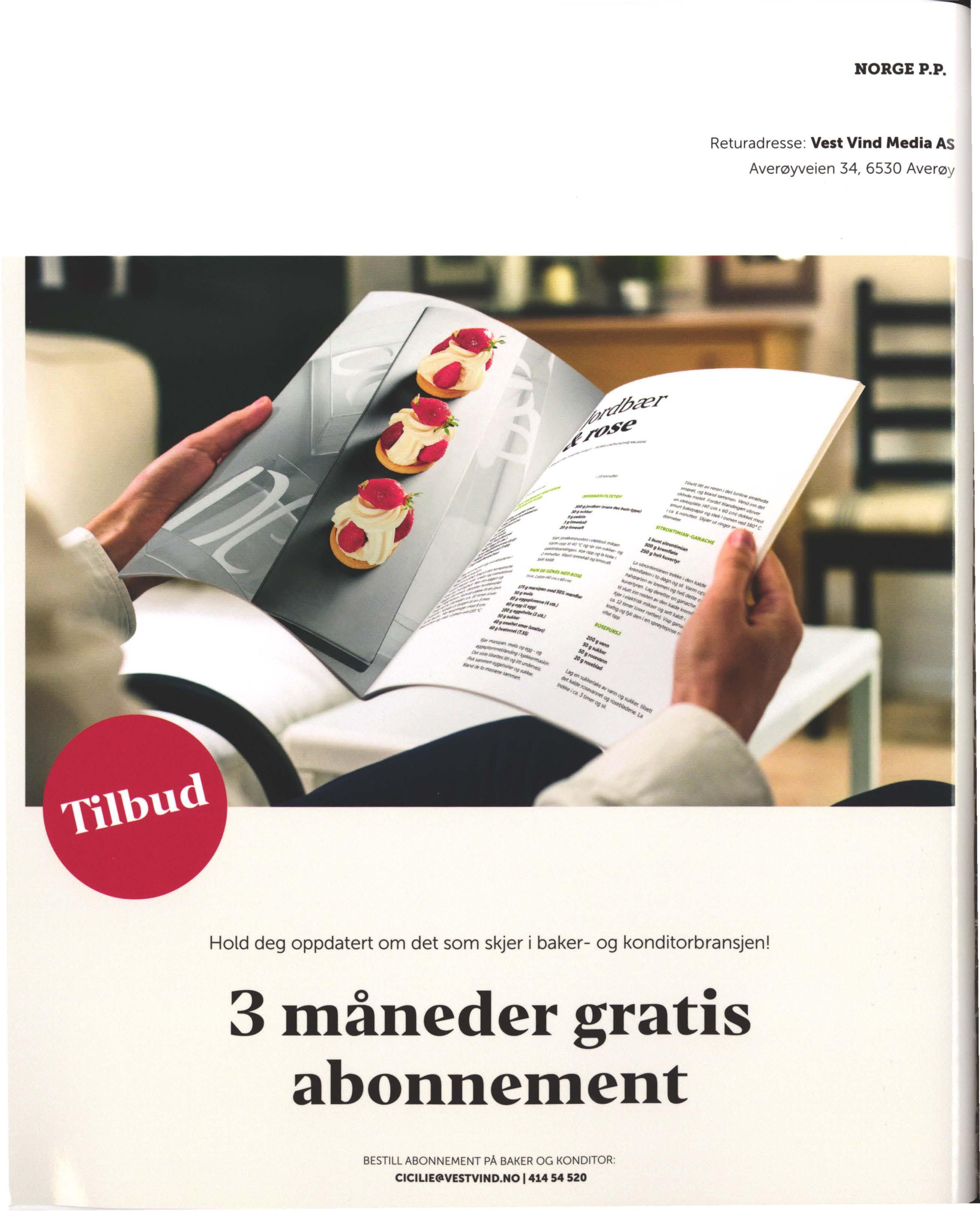 NORGE P.P. Re turadress e : Vest Vind Media AS Ave r ø y ve ien 3 4 , 6530 Av e rø y Hold deg oppdatert om det som skjer i baker- og konditorbransjen! 3 måneder gratis abonnement BESTILL ABONNEMENT PÅ BAKER OG KONDITOR : CICILIE@VESTVIND.NO I 414 54 520
