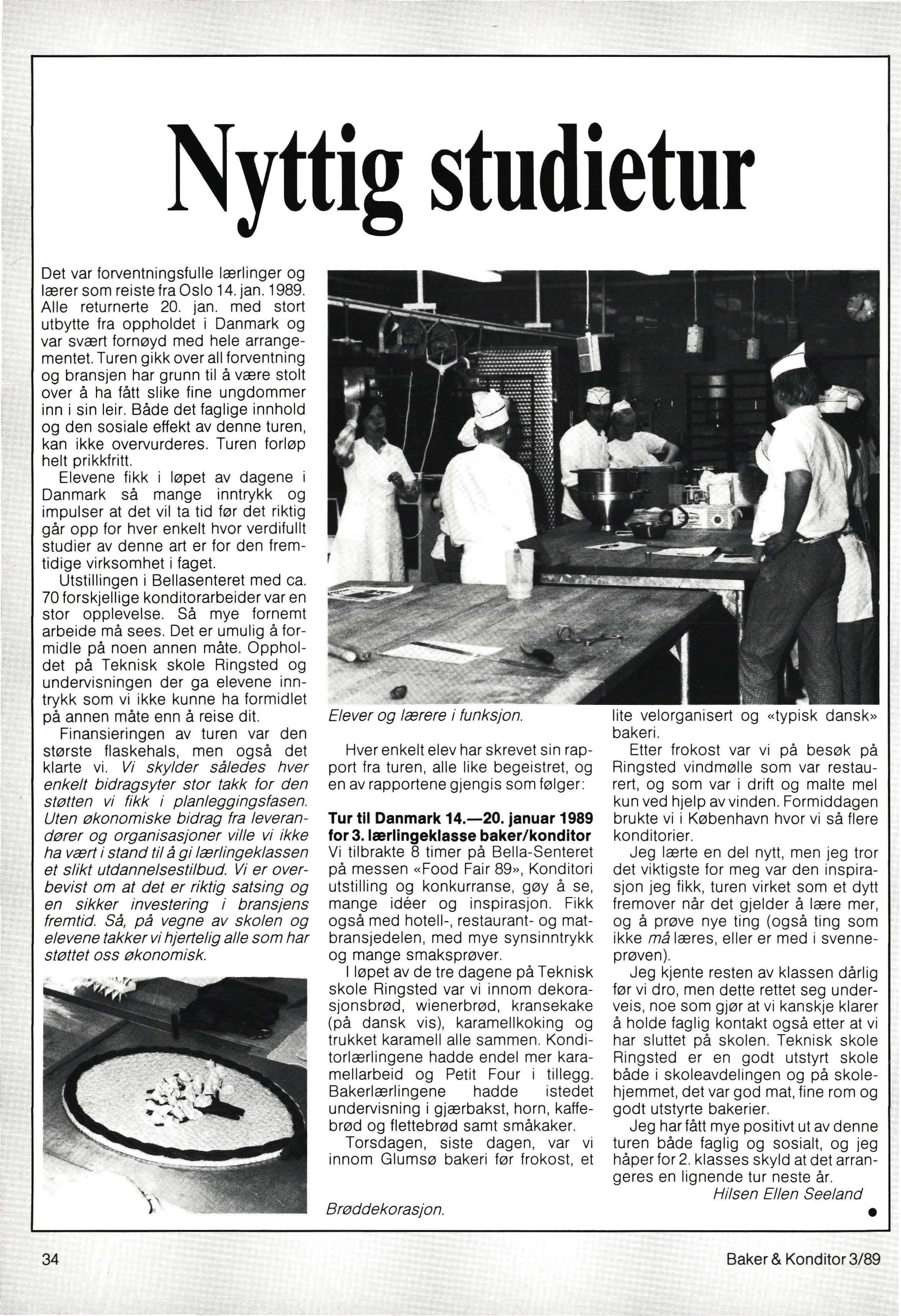 Tur til Danmark 14.-20. januar 1989 for 3. lærlingeklasse baker/konditor Vi tilbrakte 8 timer på Beila - Senteret på messen «Food Fair 89 », Konditori utstilling og konkurranse, gøy å se , mange ideer og i nspirasjon Fikk også med hotell- , restaurant- og matbransjedelen , med mye synsinntrykk og mange smaksprøver