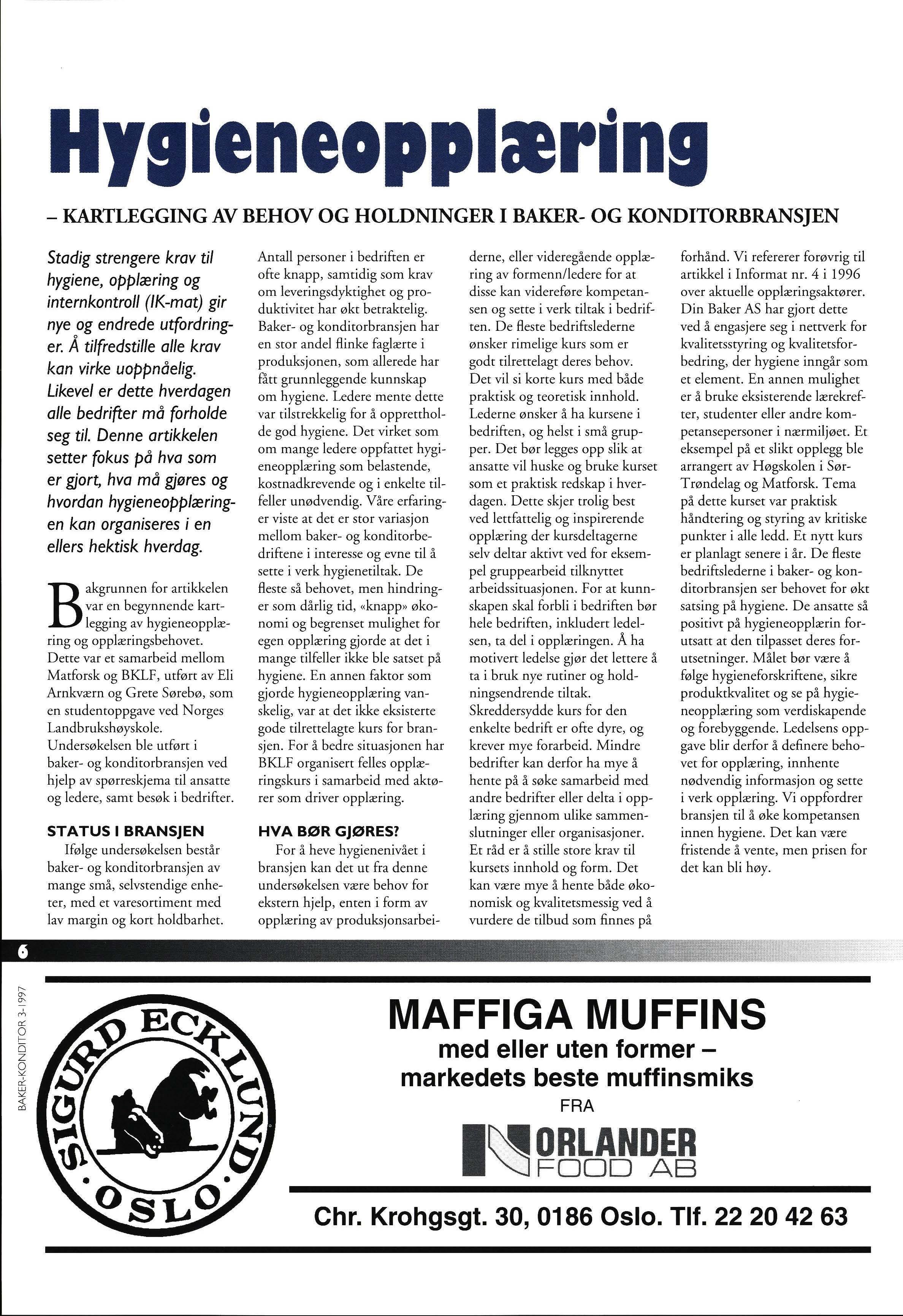 forhånd. Vi refererer forøvrig til artikkel i Informat nr 4 i 1996 over aktuelle opplæringsaktører. Din Baker AS har gjort dette ved å engasjere seg i nettverk for kvalitetsstyring og kvalitetsforbedring, der hygiene inngår som et element. En annen mulighet er å bruke eksisterende lærekrefter, studenter eller andre kompetansepersoner i nærmiljøet. Et eksempel på et slikt opplegg ble arrangert av Høgskolen i SørTrøndelag og Matforsk. Tema på dette kurset var praktisk håndtering og styring av kritiske punkter i alle ledd. Et nytt kurs er planlagt senere i år. De fleste bedriftslederne i baker- og konditorbransjen ser behovet for økt satsing på hygiene. De ansatte så positivt på hygieneopplærin forutsatt at den tilpasset deres forutsetninger. Målet bør være å følge hygieneforskriftene, sikre produktkvalitet og se på hygieneopplæring som verdiskapende og forebyggende. Ledelsens oppgave blir derfor å definere behovet for opplæring, innhente nødvendig informasjon og sette i verk opplæring. Vi oppfordrer bransjen til å øke kompetansen innen hygiene. Det kan være fristende å vente, men prisen for der kan bli høy.