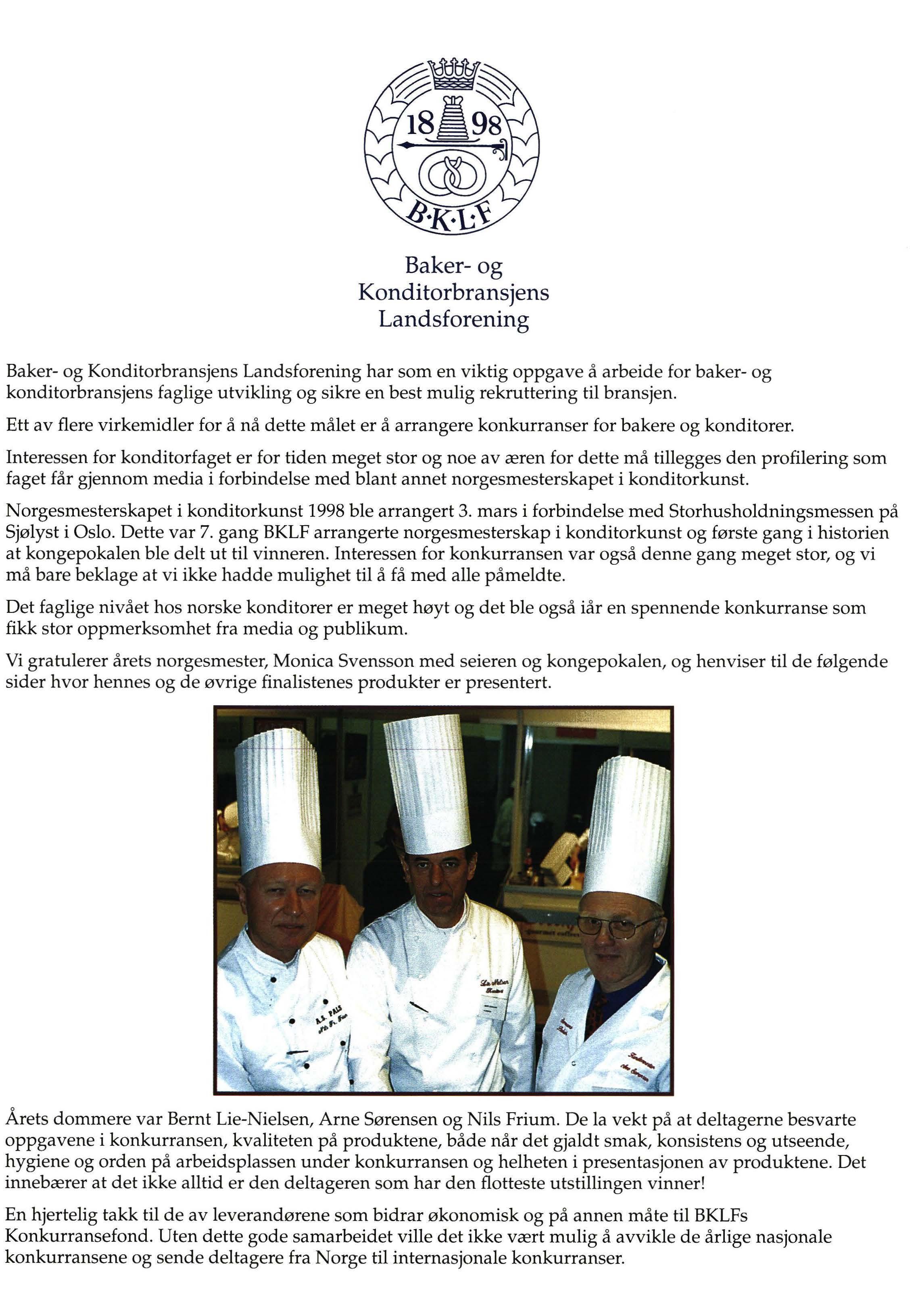 Først og fremst fordi dere har nådd fram til (,nalen i dette norgesmesterskapet Og fordi alle seks har gjort en innsats som vekker stor oppmerksomhet, og kvalitetsmessig er på et meget høyt nivå. Det uttalte hoveddommer Bernt LieNielsen da premiene for årets NM i Konditorkunst ble delt ut på Sjølyst den 3. mars.