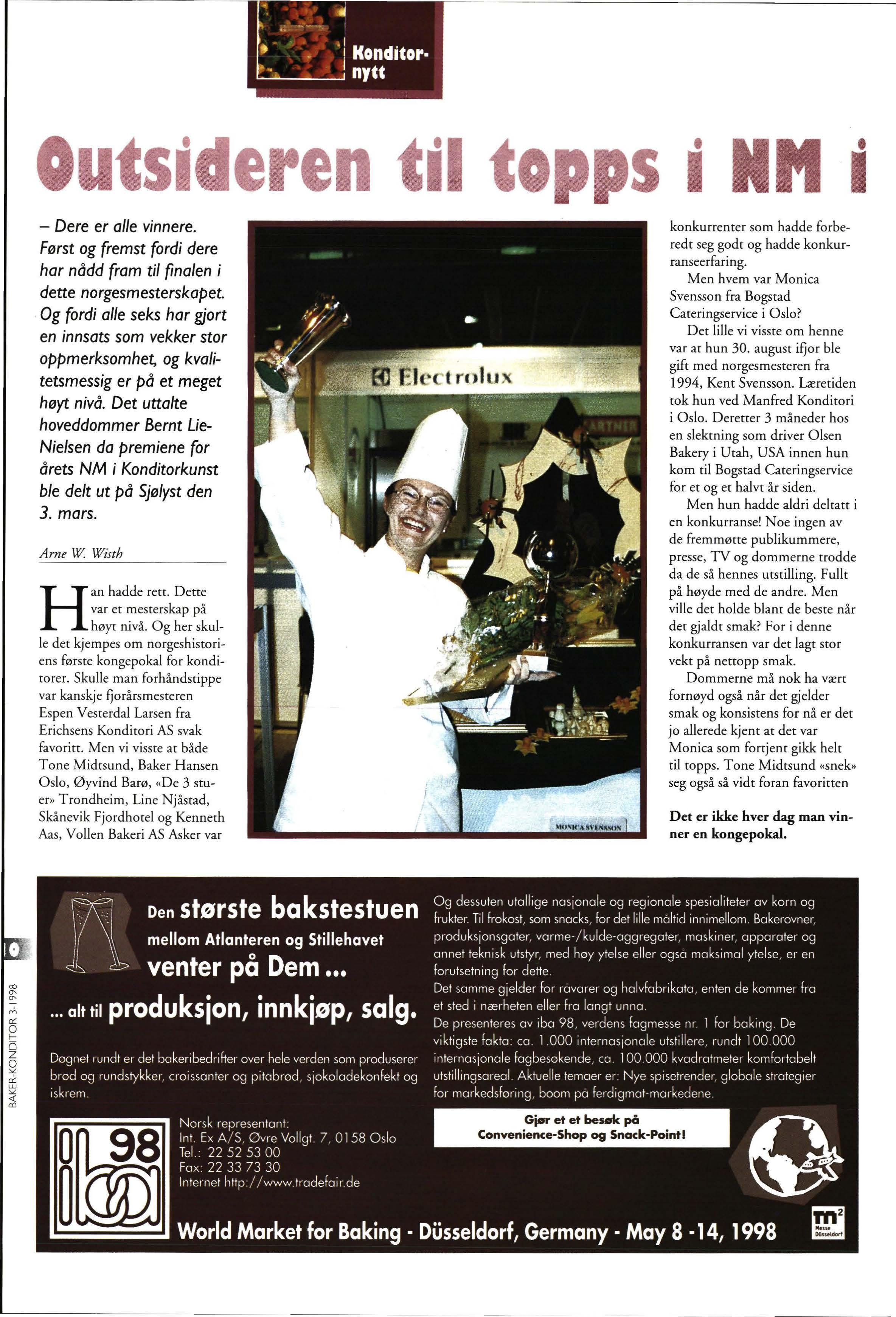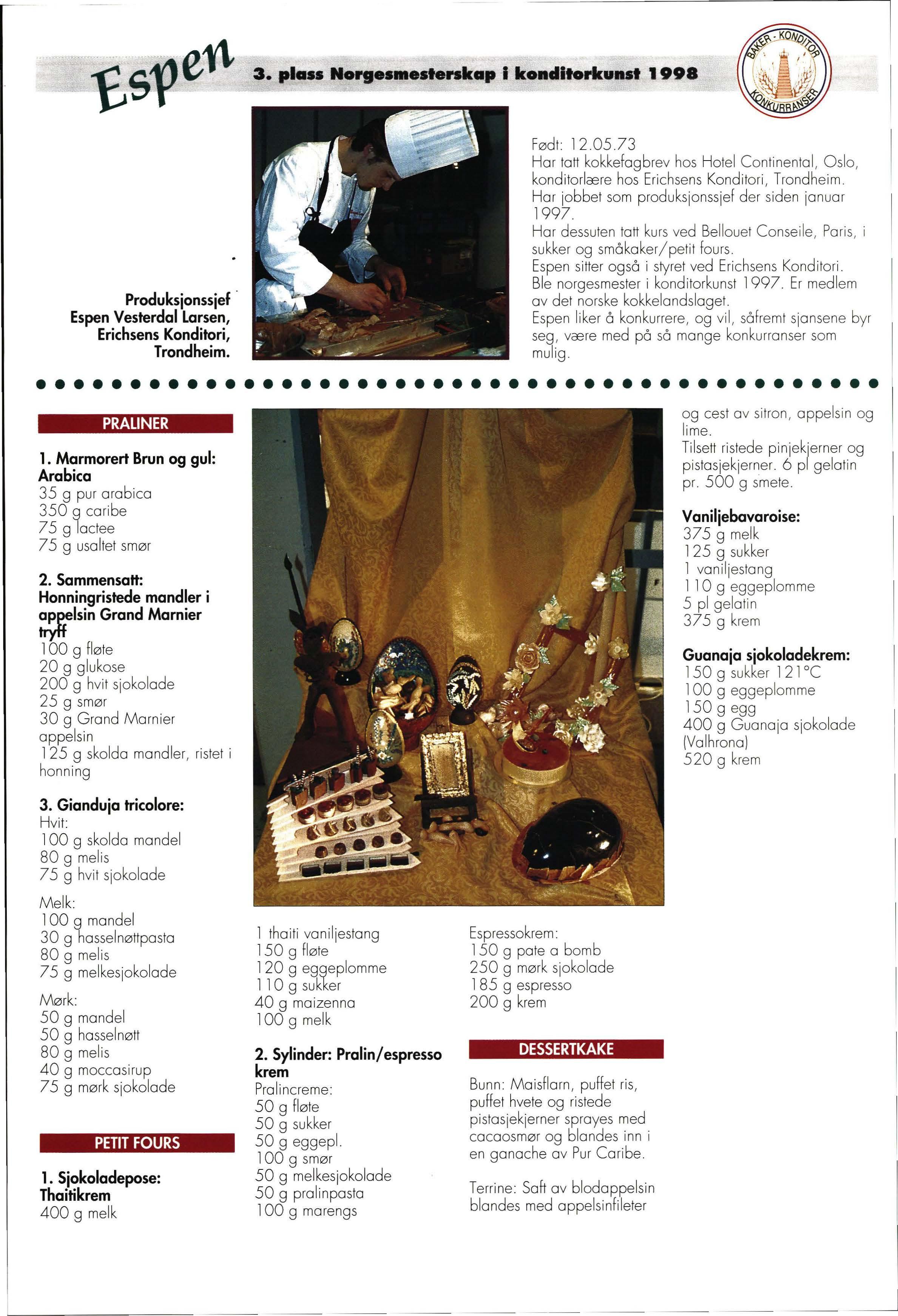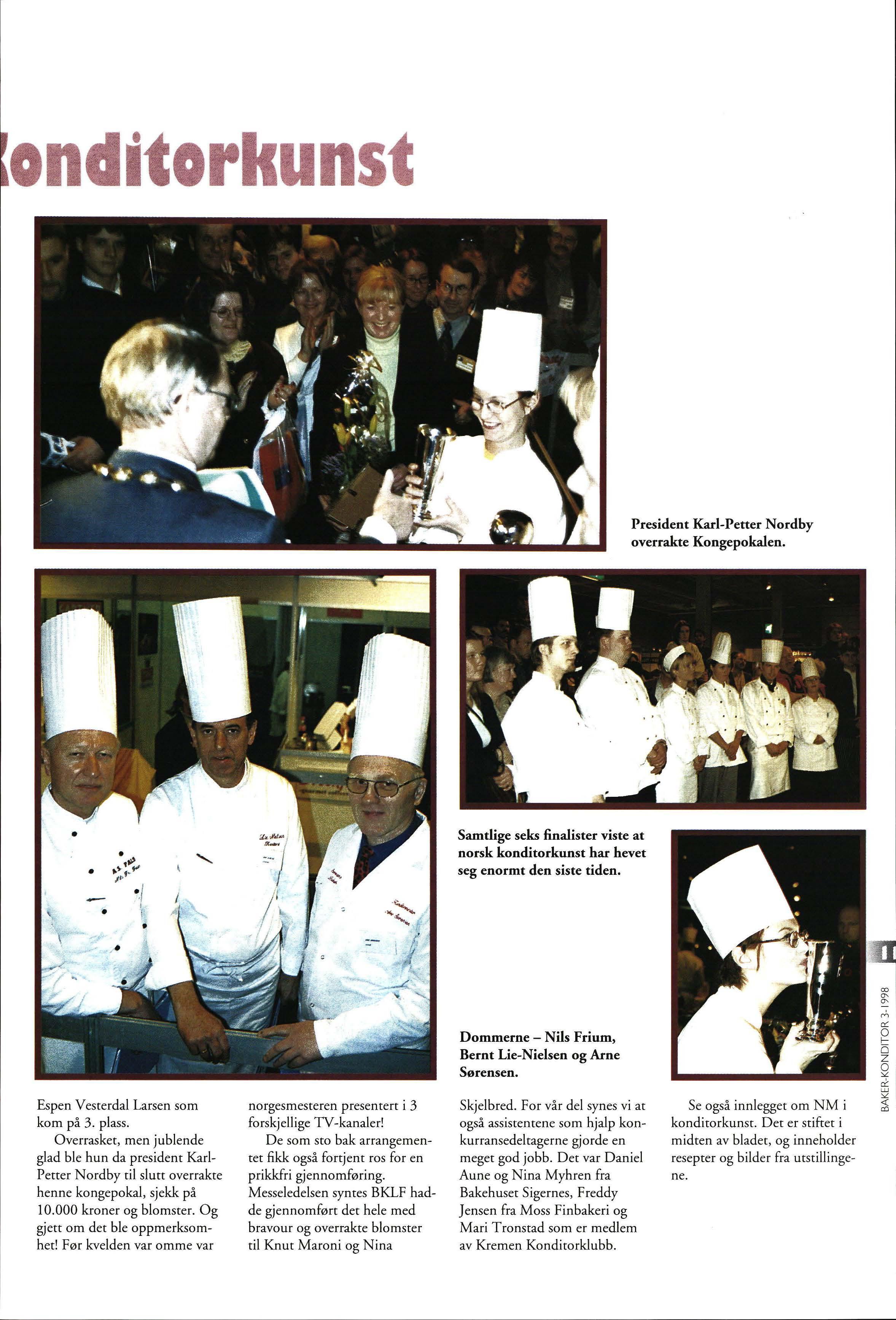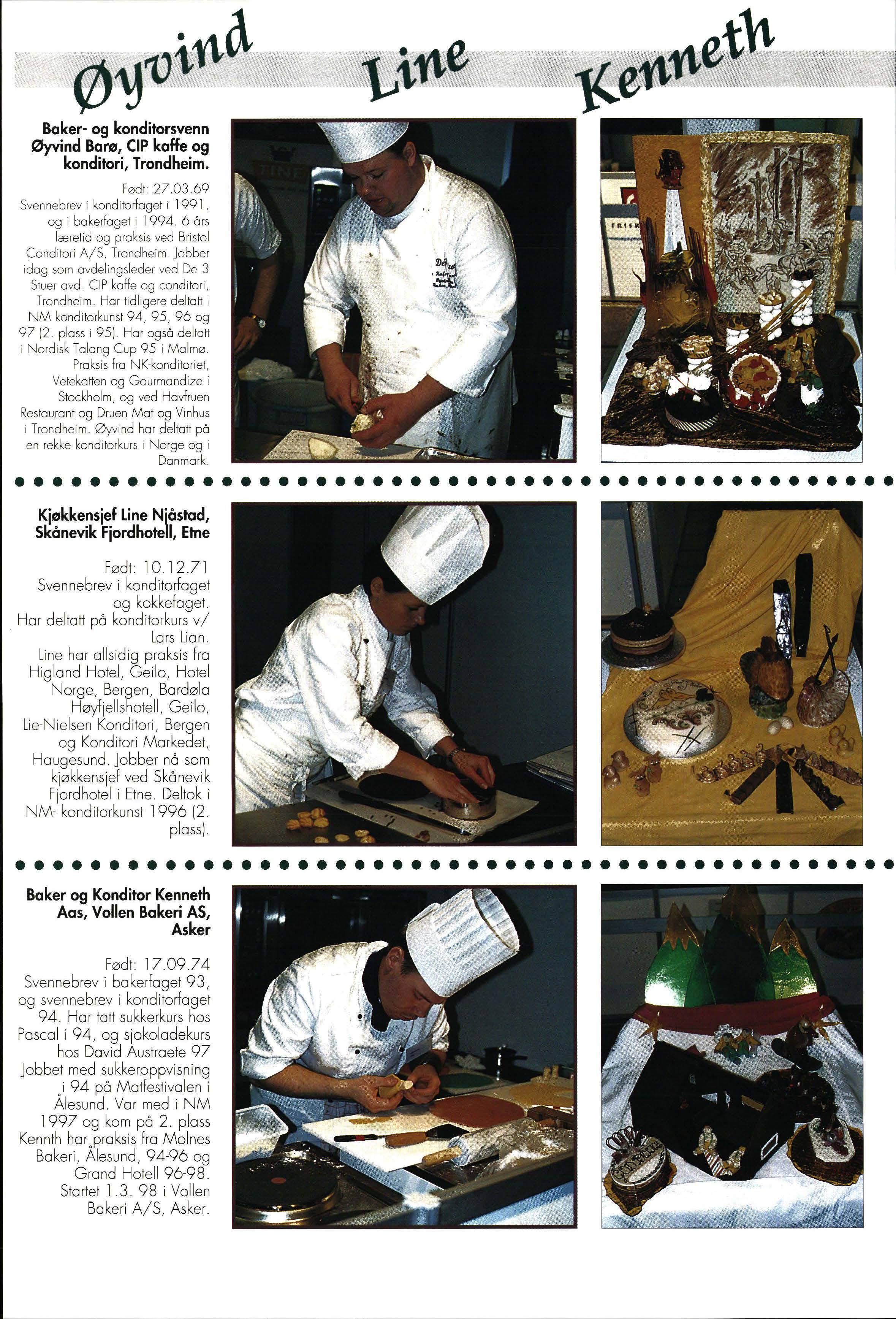 Espen Vesterdal Larsen fra Erichsens Konditori AS svak fa voritt. Men vi visst e at både Tane Midtsund , Baker Hansen Oslo, Øyvind Barø , «De 3 stue r» Trondheim, Line Njåstad, Skånevik Fjordhotel og Kenneth Aas , Vollen Bakeri AS Asker var