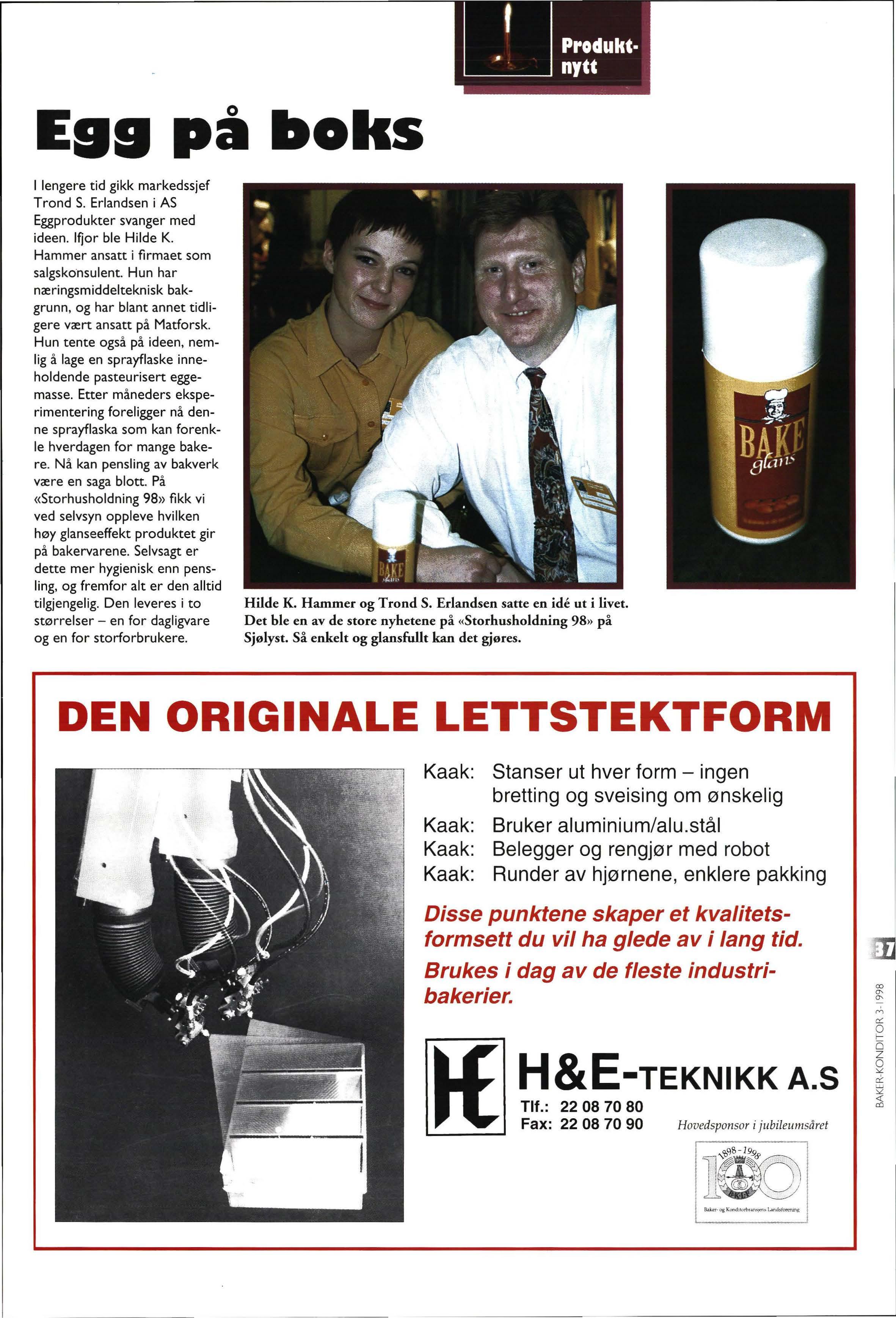 Trond S Erlandsen i AS Eggprodukter svanger med ideen. Ifjor ble Hilde K Hammer ansatt i firmaet som salgskonsulent Hun har næringsmiddelteknisk bakgrunn, og har blant annet tidligere vært ansatt på Matforsk Hun tente ogs å på ideen, nemlig å lage en sprayflaske inneholdende pasteurisert eggemasse. Etter måneders eksperimentering foreligger nå denne sprayflaska som kan forenkle hverdagen for mange bakere . Nå kan pensling av bakverk være en saga blott På «Storhusholdning 98 » fikk vi ved selvsyn oppleve hvilken høy glanseeffekt produktet gir på bakervarene Selvsagt er dette mer hygienisk enn pensling, og fremfor alt er den alltid tilgjengelig. Den leveres i to stø r relser - en for dagligvare og en for storforbrukere.