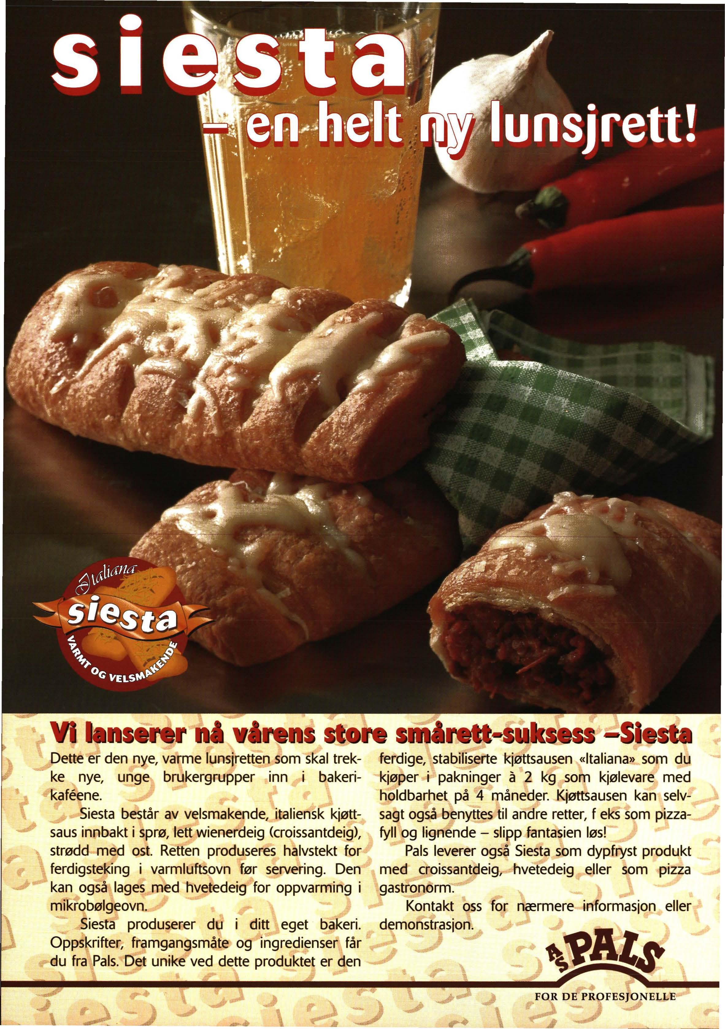 Siesta består av velsmakende, italiensk kjøttsaus innbakt i sprø, lett wienerdeig <croissantdeig), strødd med ost. Retten produseres halvstekt for ferdigsteking i varmluftsovn før servering. Den kan også lages med hvetedeig for oppvarming i mil<robølgeovn.