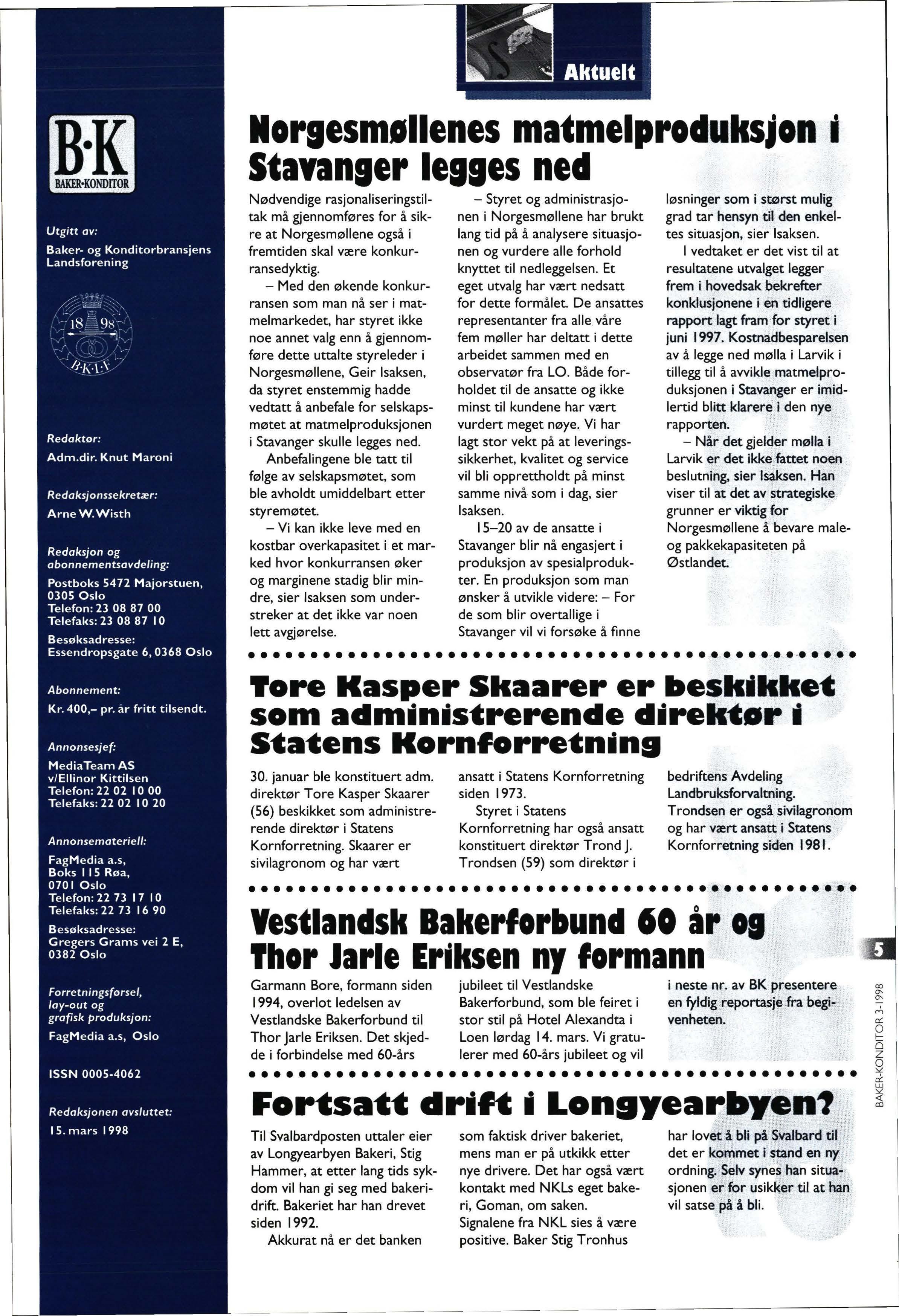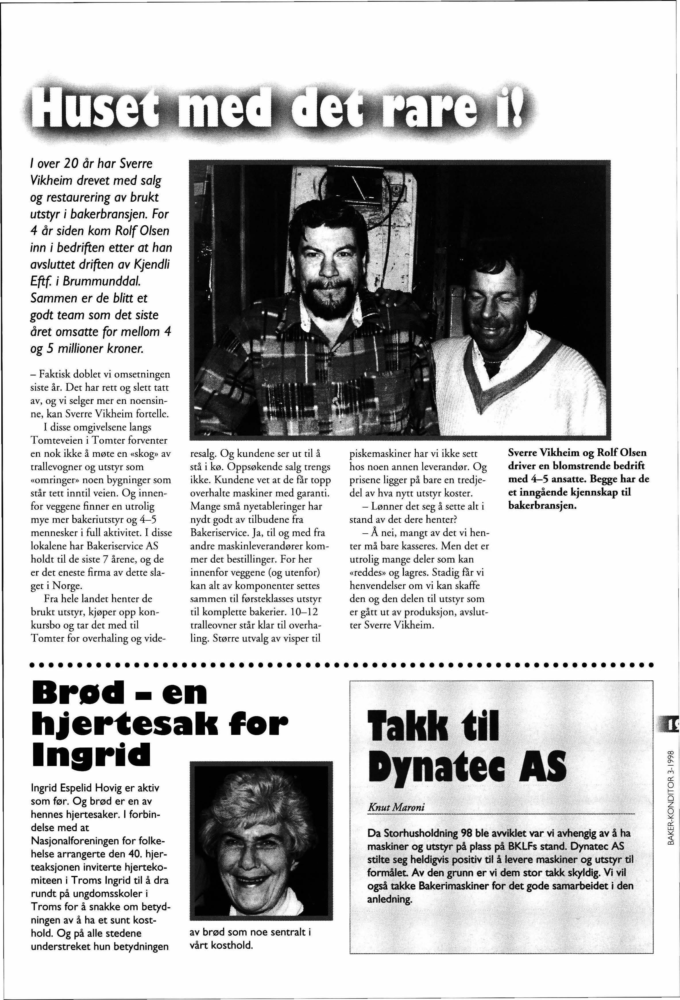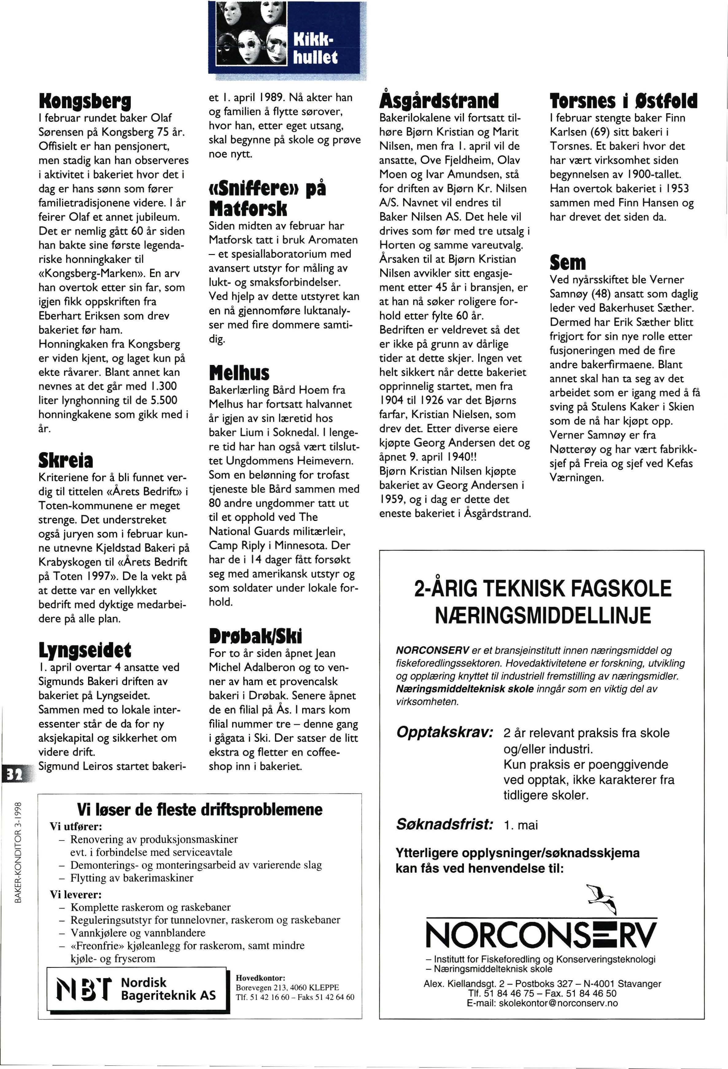 Bakerilokalene vil fortsatt tilhøre Bjørn Kristian og Mar it N ilsen, men fra I april vil de ansatte , Ove Fjeldheim , Olav Moen og Ivar Amundsen , stå for driften av Bjørn Kr. Nilsen A/S Navnet vil endres til Baker Nilsen AS. Det hele vil drives som fø r med tre utsalg i Horten og samme vareutvalg Årsaken til at Bjørn Kr istian Nilsen avvikler sitt engasjement etter 45 å r i bransjen , er at han nå søker roligere forhold etter fylte 60 år Bedriften er veldrevet så det er ikke på grunn av d å rlige t ider at dette skjer Ingen vet helt sikkert nå r dette bakeriet opprinnel ig startet, men fra 1904 til 1926 va r det Bjørns farfar , Kristian Nielsen , som drev det Etter diverse eiere kjøpte Georg Andersen det og å pnet 9. apr il 1940!! Bjørn Kristian Nilsen kjøpte bakeriet av Georg Andersen i 1959 , og i dag er dette det eneste bakeriet i Åsg å rdstrand