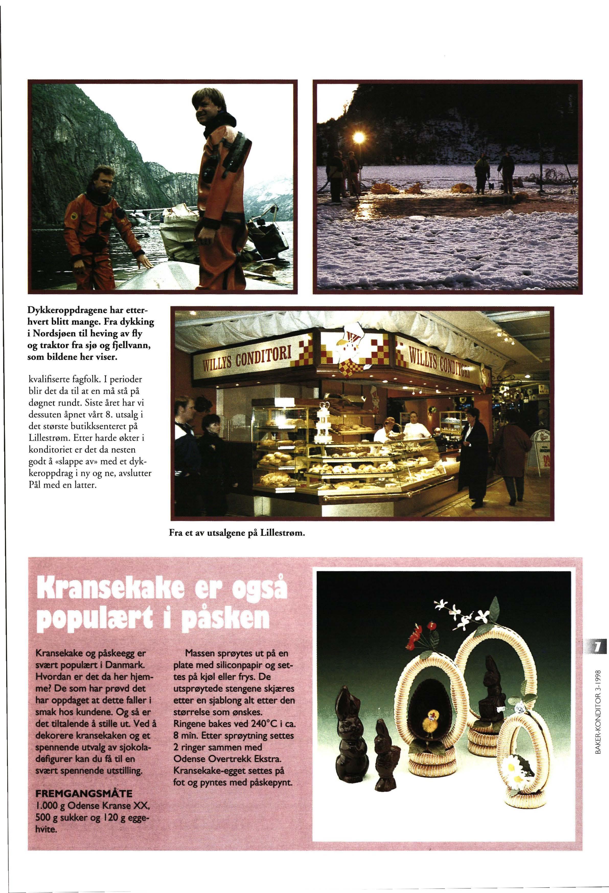 - Jeg var noe betenkt da jeg overtok Willys Condirori AS for ca. er år siden Dykkerfirmaet var godt innarbeidet, men jeg savnet det kreative med konditoryrket - så jeg bestemte meg for fullt og helt å gå inn for det igjen. Og i dag synes jeg denne kombinasjonen går greie. Det mest slitsomme og arbeidskrevende av disse ro yrkesgruppene har jeg funnet ut er konditoryrker. En av årsakene til det er at det nesten er umulig å få tak på