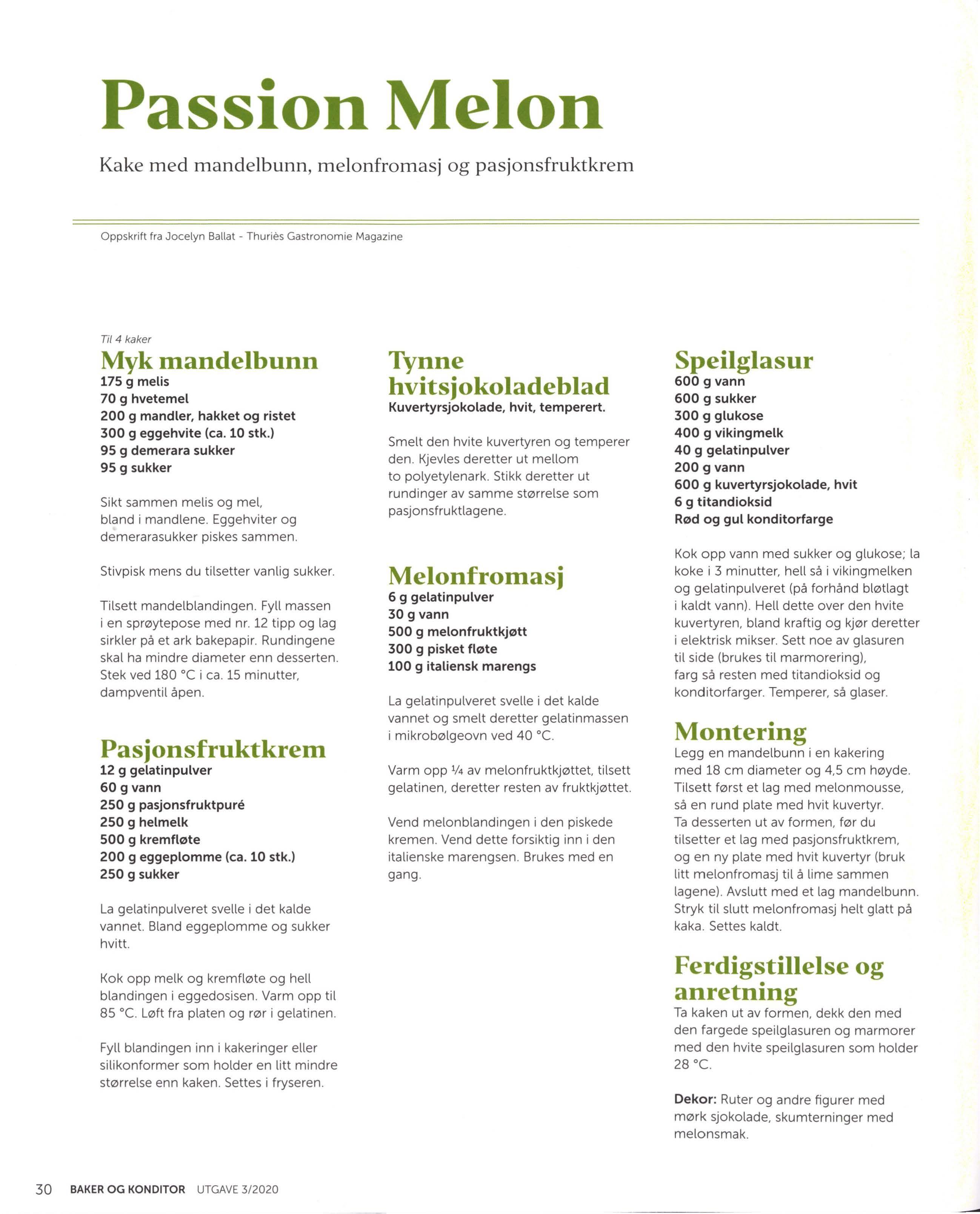 Legg en mandelbunn i en kakering med 18 cm diameter og 4,5 cm høyde Tilsett først et lag med melonmousse, så en rund plate med hvit kuvertyr