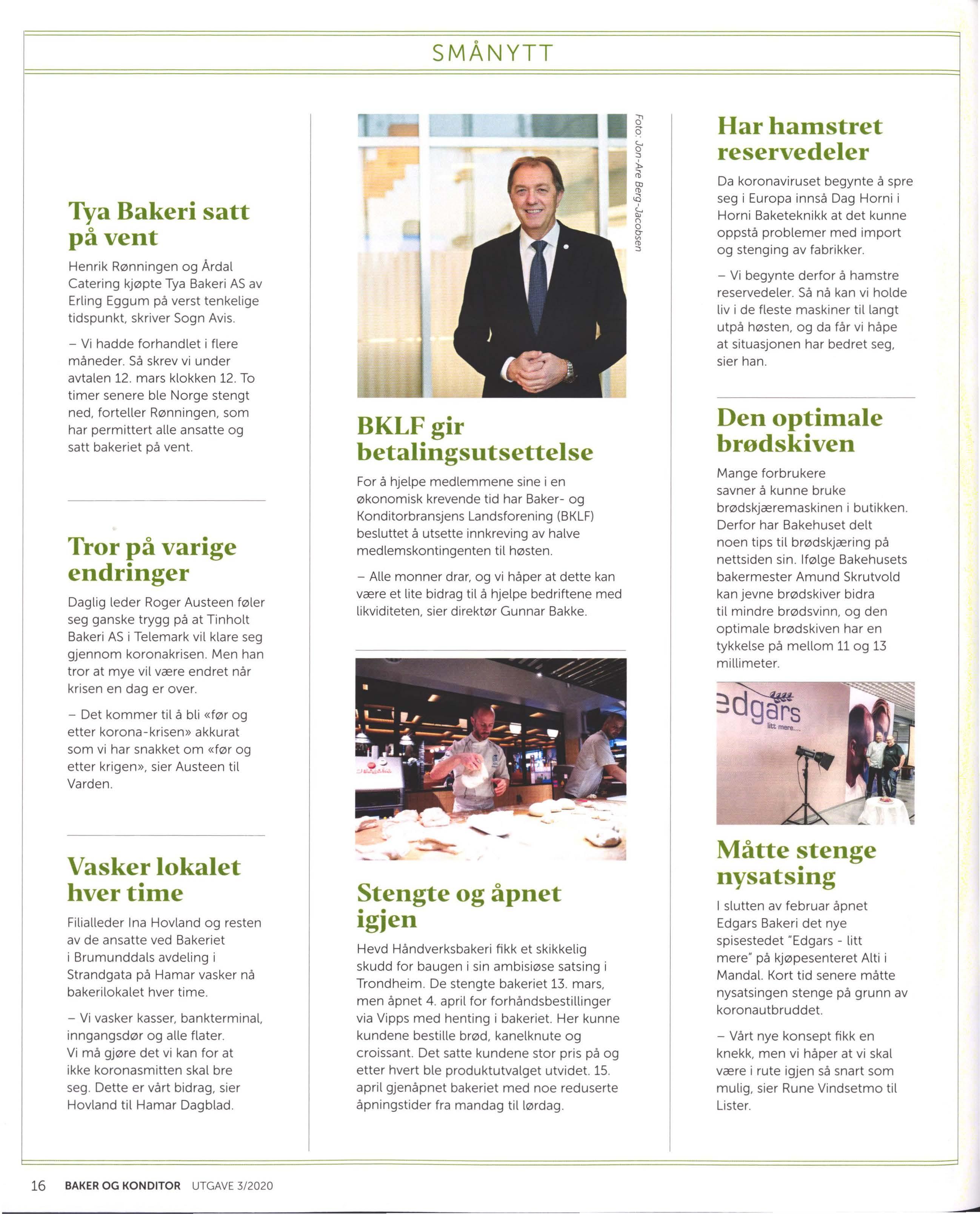 Det kan se ut til at Norge unngår en smittekatastrofe som vi ser i mange andre land. Det er gledelig. Konsekvensene av nedstenging og kunder som holder seg hjemme, må vi sannsynligvis slite med en god stund Så er det å håpe at flest mulig kommer ut av dette, forhåpentligvis godt hjulpet av offentlige støtteordninger og kunder som setter pris på den lokale bakeren og konditoren .