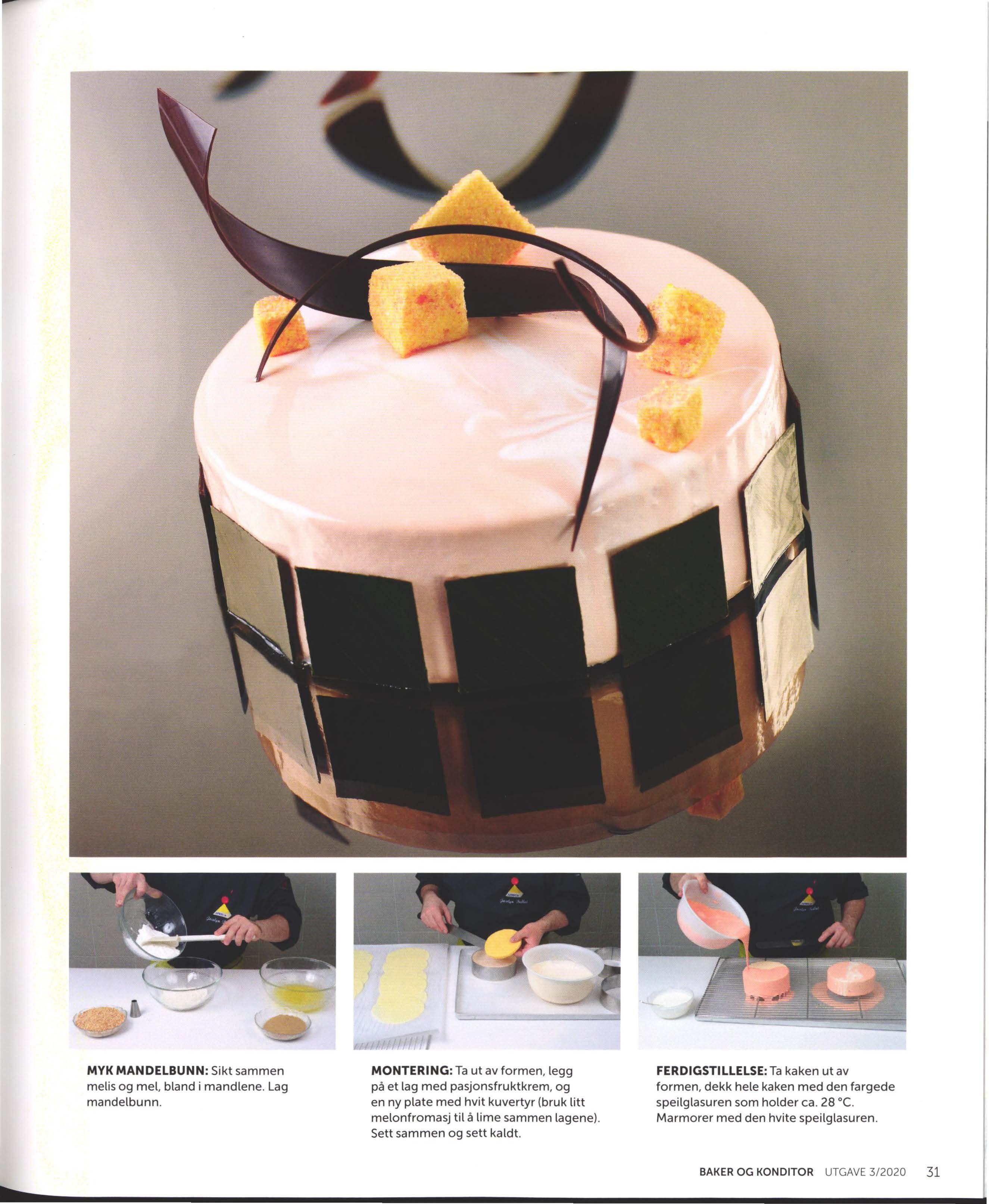 Ta desserten ut av formen , før du tilsetter et lag med pasjonsfruktkrem , og en ny plate med hvit kuvertyr (bruk litt melonfromasj til å lime sammen lagene) Avslutt med et lag mandelbunn