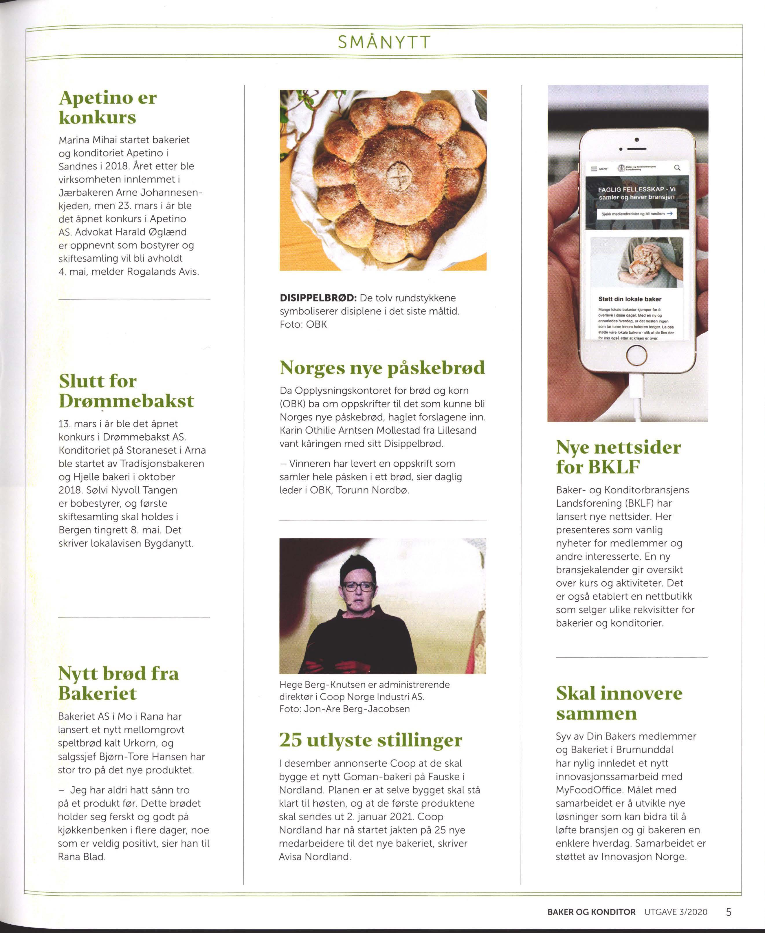 Det positive er at krisen tvinger frem både omstilling og nytenkn ing. Vi som følger baker- og konditorbransjen tett , ser at svært mange bedrifter har tenkt kreativt og handl et raskt med å tilby både andre produkter, nettbestilling og hjemkjøring av varer. lnnovasjonsgraden i bransjen har nok sannsynligvis ikke vært høyere enn nå. Det er en utvikling som bransjen kan ta med seg videre når dette en gang er over.