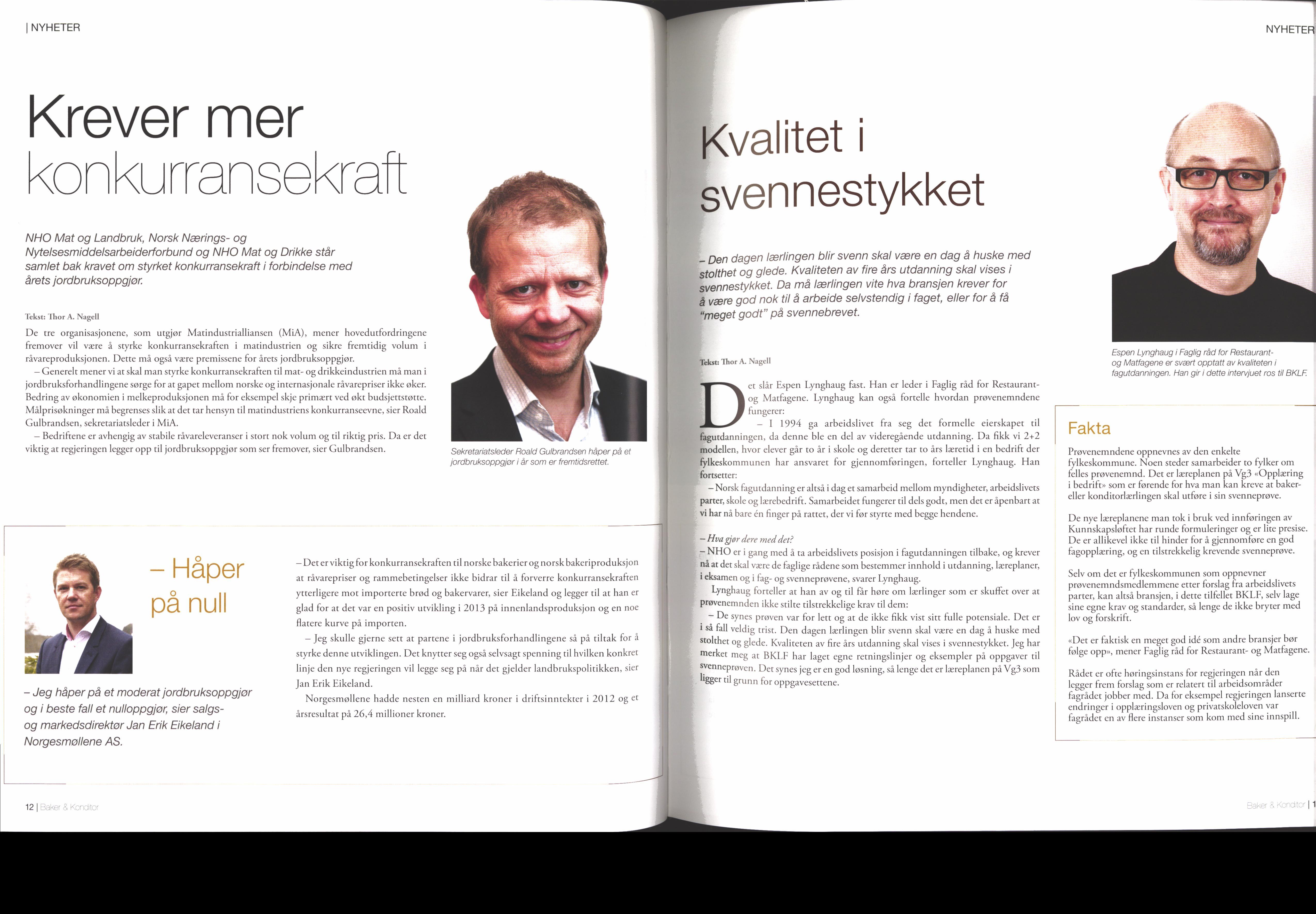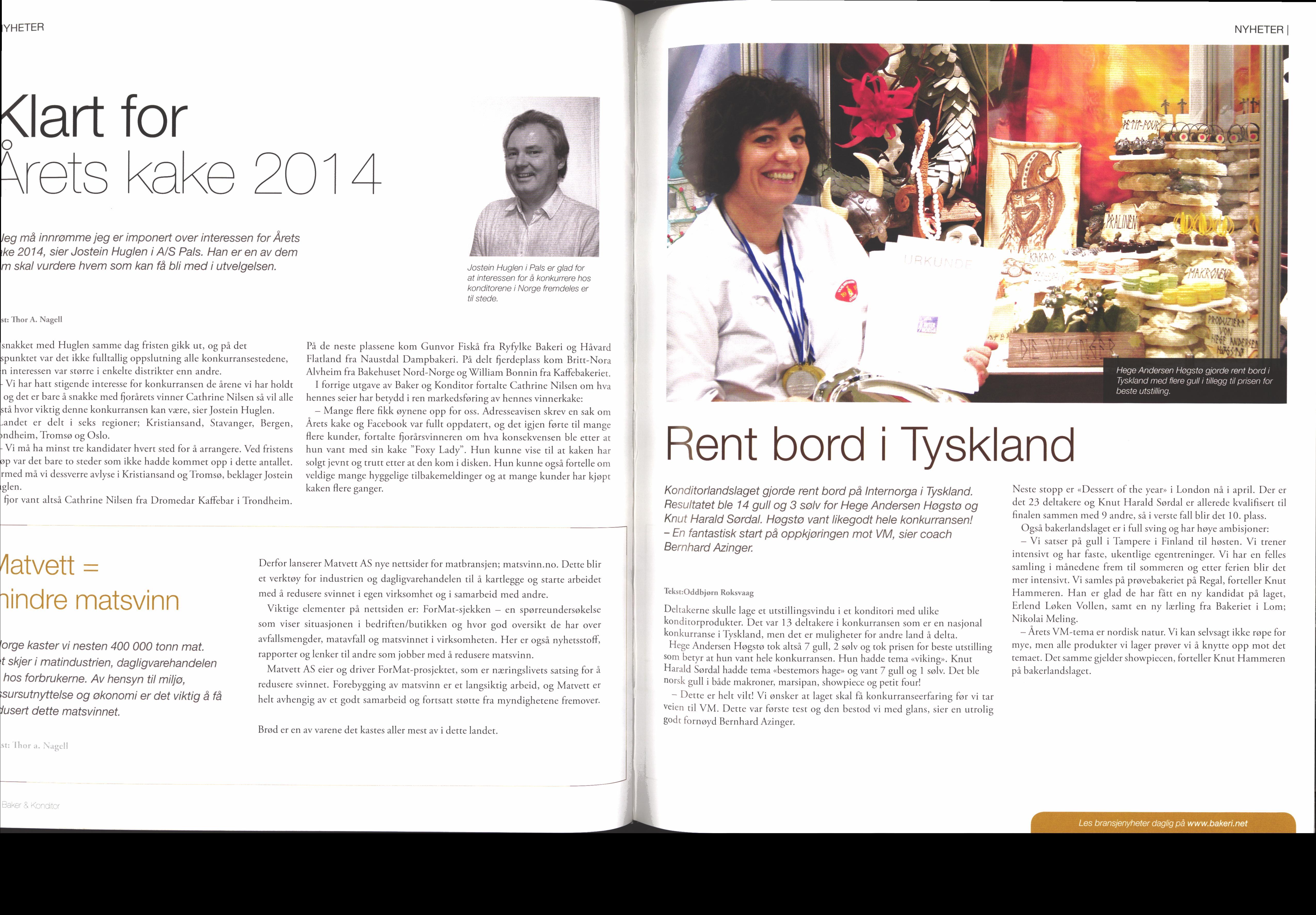 I kamp med de store kjedene har ikke smi familiebakerier nubbsjans. Importbrod fra utlandet utkonkurrerer de lokale bakervarene pi pris. Hindlagde kaker koster for mye i produsere, det blir for dyrt. Og vi vet ikke i sette pris pi det for det er borte Baker- og konditorstanden i Norge rynnes sakte men sikkert ut, og jeg er redd denne avisoverskriften (nBaker sin siste kake, pi forstesiden i Romerikes Blad' Red. anm.) er starten pi slutten for konditoryrker slik vi kjenner det i dag. Det bliser en baketrend over landet, men rekrutteringen til konditorfaget har aldri vrrt lavere.