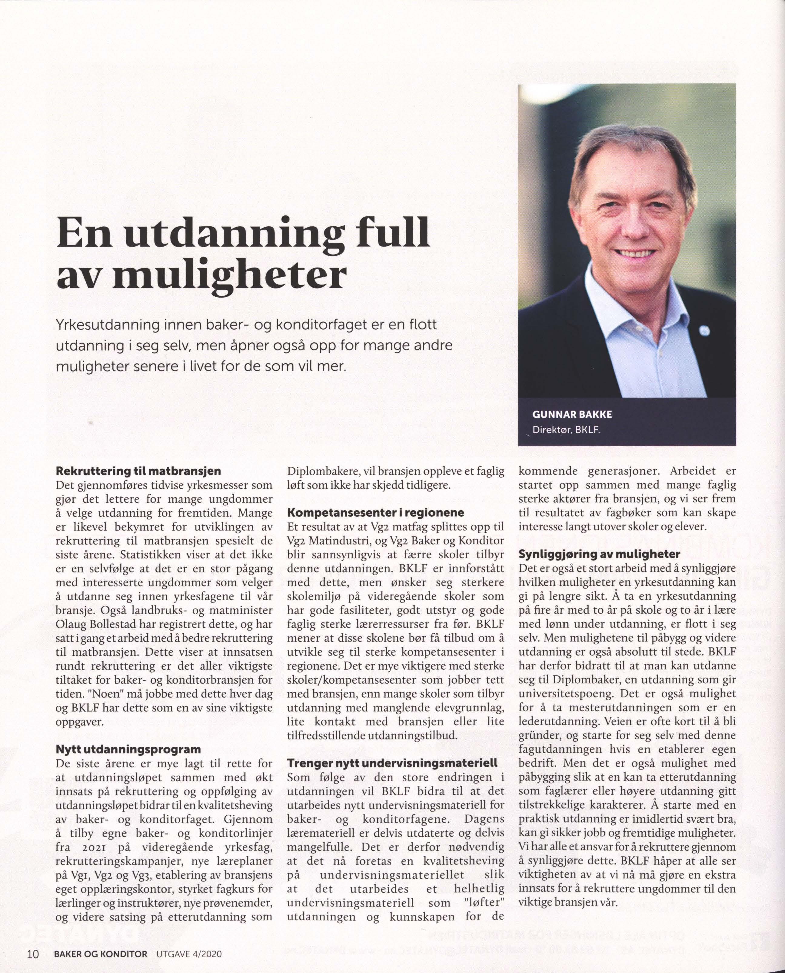 ET FORMIDABELT ARBEID er lagt ned på alle nivåer for å sikre en bedre utdanning i baker- og konditorbransjen. Bransjeforeningen med Gunnar Bakke i spissen skal ha mye av æren for at det ble slik. Det pågående arbeidet med nye læreplaner og nye læremidler, der bransjen har tatt et tydelig ansvar, vil gi fagene et historisk løft.