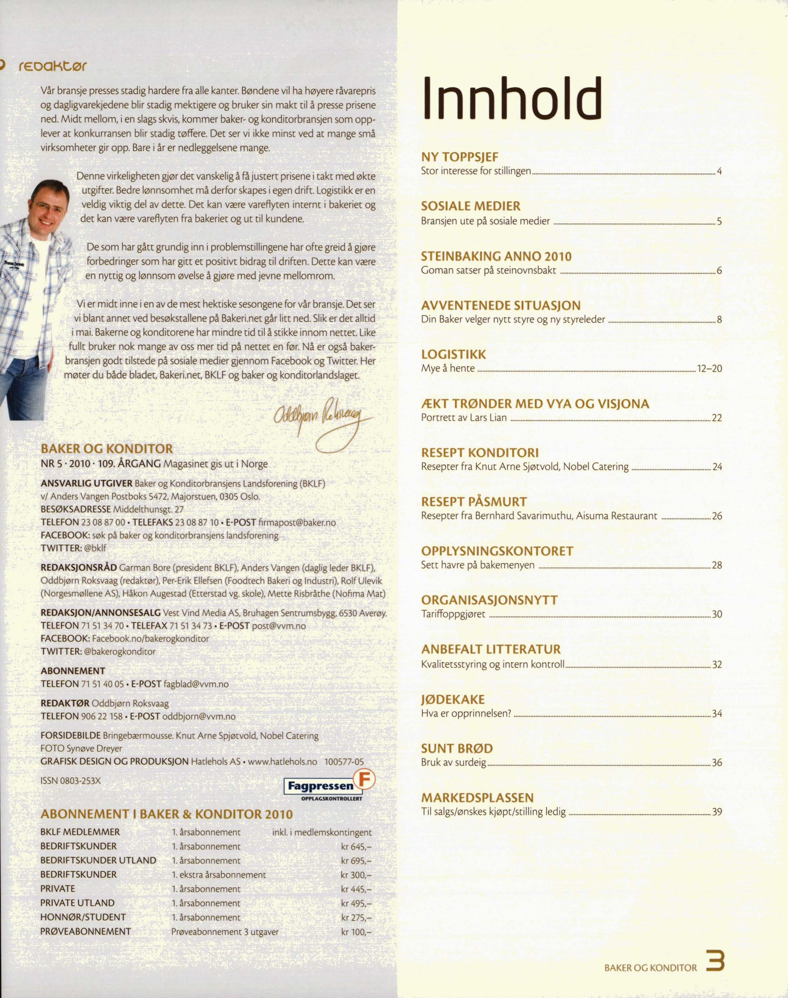 REDAKSJONSRÅD Garman Bore (president BKLF), Anders Vangen (daglig leder BKLF), Oddbjørn Roksvaag (redaktør), Per-Er ik Ellefsen (Foodtech Bakeri og Industri), Rolf Ulevik (Norgesmøllene AS), Håkon Augestad (Etterstad vg. skole), Mette Risbråthe (Nofima Mat)
