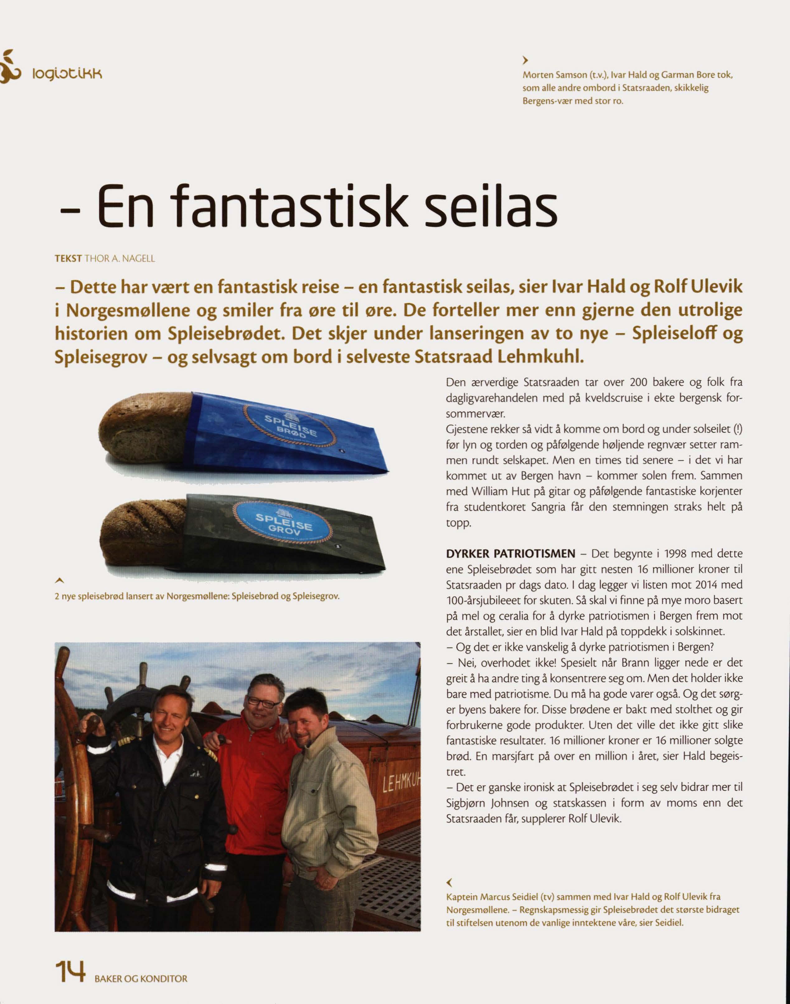 En samtale mellom Martin Al saker hos Bake Brun og nå avdø de Per Langhelle i Stiftelsen Statsraad Lehmkuhl , startet det som skulle b l en svært viktig inntekstkilde for Bergens stol seilskute. De to diskuterte h vordan finansier , vedlikehold av Statsraaden Løsningen ble et eget brød der en krone per solgte brød gikk til Statsraad Lehmkuhl. Fart i sakene ble det da Møllerens kom ombord. De utviklet en spesiell brødbase til det nye brødet med tanl på ernæring, kvalitet og holdbarhet. Det første Spleisebrødet ble solgt 16. mai 1998Året etter ble det solgt 695 358 Spleisebrød Hordaland , og 695 358 blanlke kroner tikke! inn til Statsraad Lehmkuhl. Siden den gan! har Stiftelsen Statsraad Lehmkuhl mottatt over 16 millioner vedlikeholdskroner fra Spleisebrødet. Resultatet kan du se hvis du tar turen til Bradbenken i sommer. Der hgi Norges flotteste seilskute til kai , når hun ik er på tokt . Nå lanseres to nye Spleisebrød ; Spleiseloff og Spleisegrov.