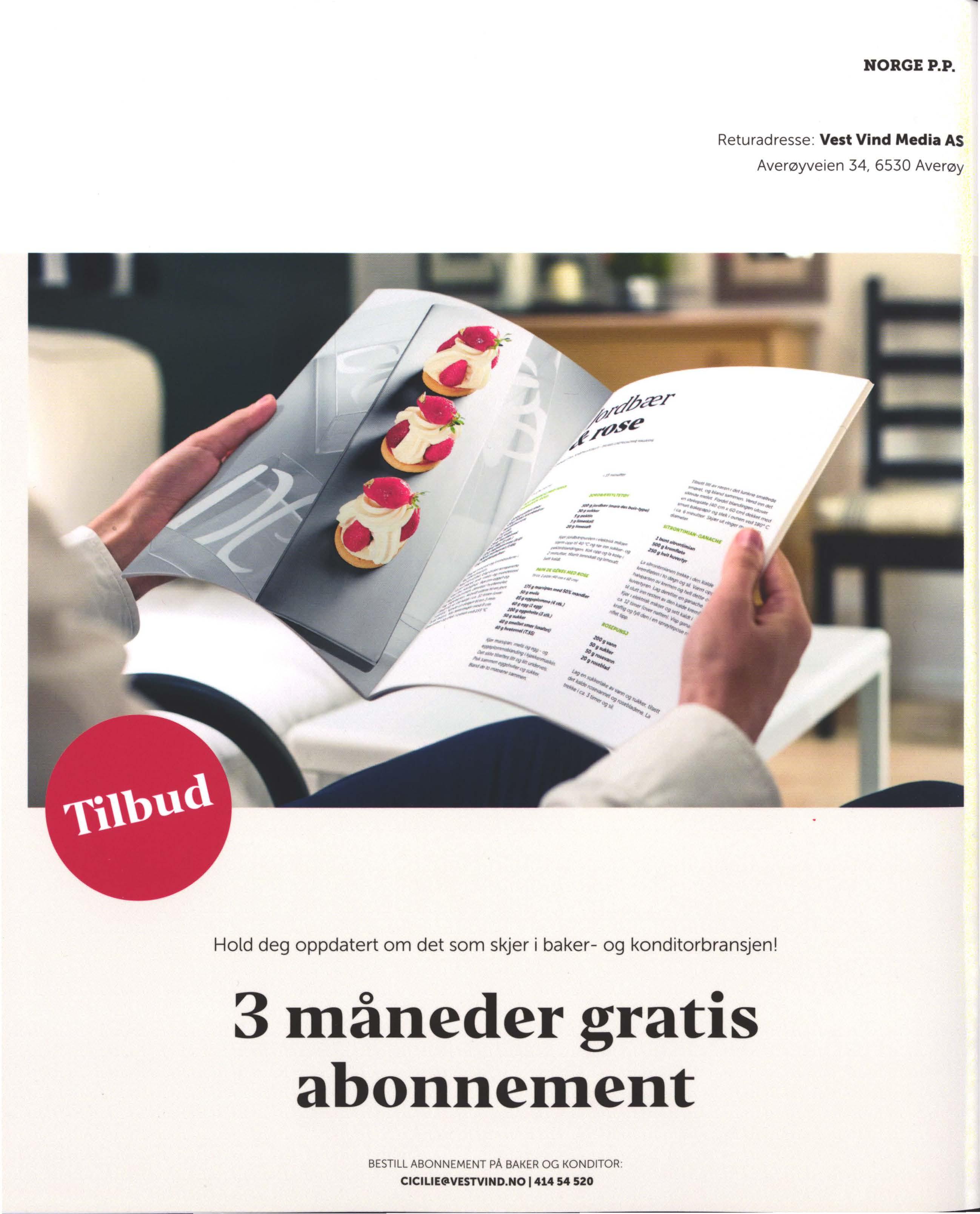 3 måneder gratis abonnement BESTILL ABONNEMENT PÅ BAKER OG KONDITOR : CICILIE@VESTVIND.NO I 414 54 520 -