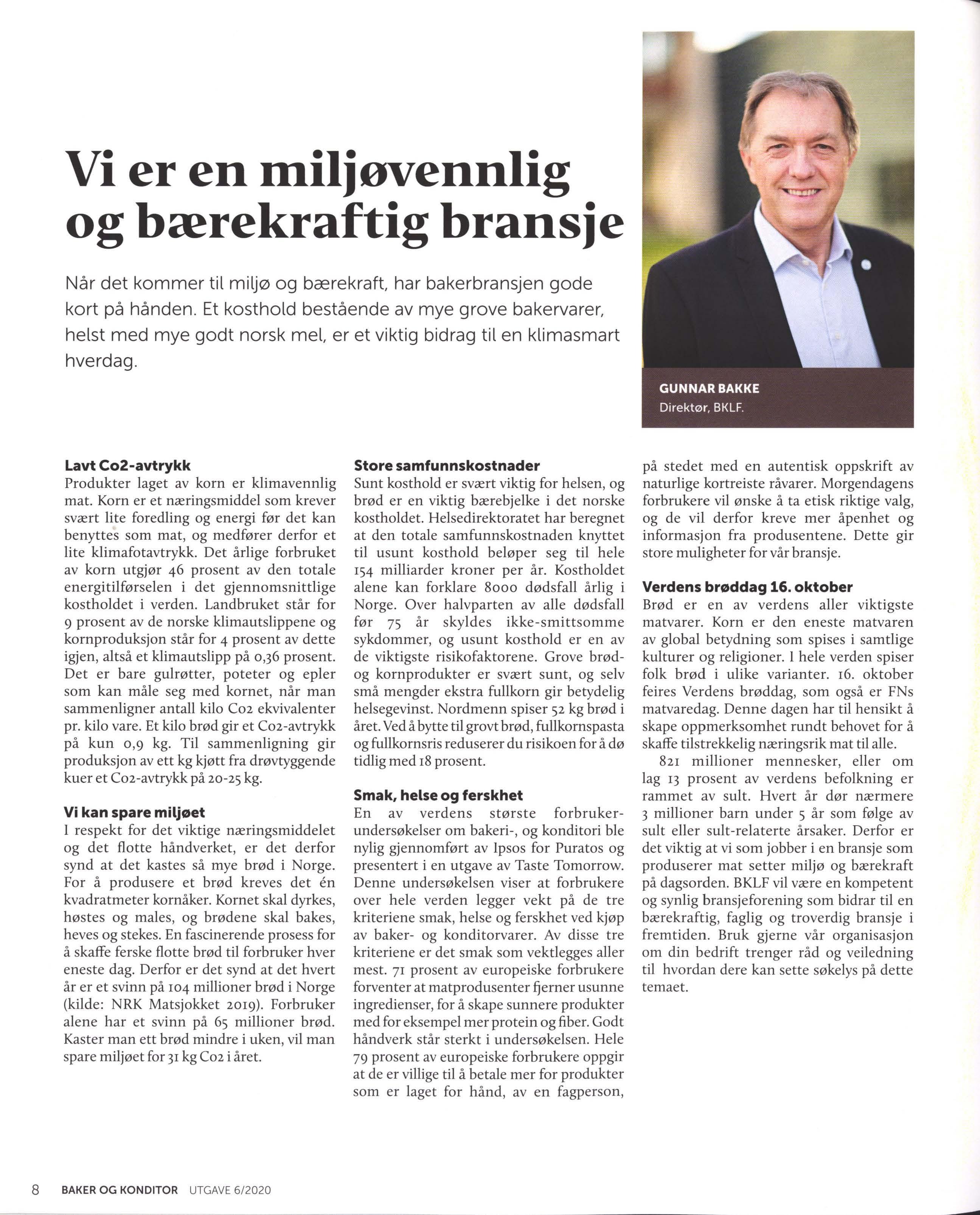 MILJØ OG BÆREKRAFT står stadig høyere på dagsorden i alle deler av samfunnet, ikke minst hos forbrukeren. Det setter store krav ti l alle som skal levere varer og tjenester. Baker- og konditorvarer er intet unntak. De t te perspektivet har mange fasetter som kortreiste råvarer, loka l produksjon og et minst mulig C02-avtrykk. Vi er heldige som er i en kategori som har et svært gunstig klimaavtrykk sammenlignet med andre deler av matbransjen. Det må vi utnytte til vår fordel. I tillegg har vi også produkter som matcher den veganske trenden svært godt