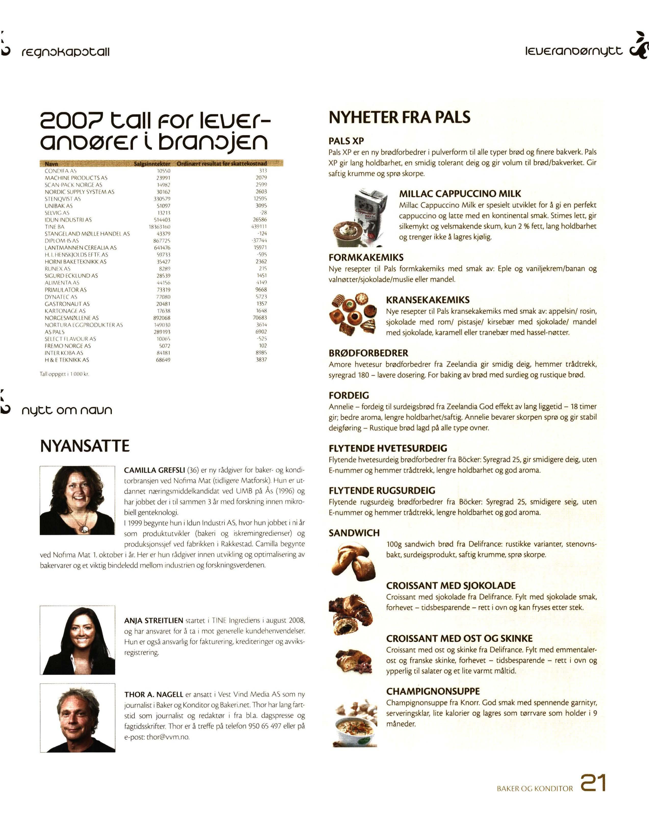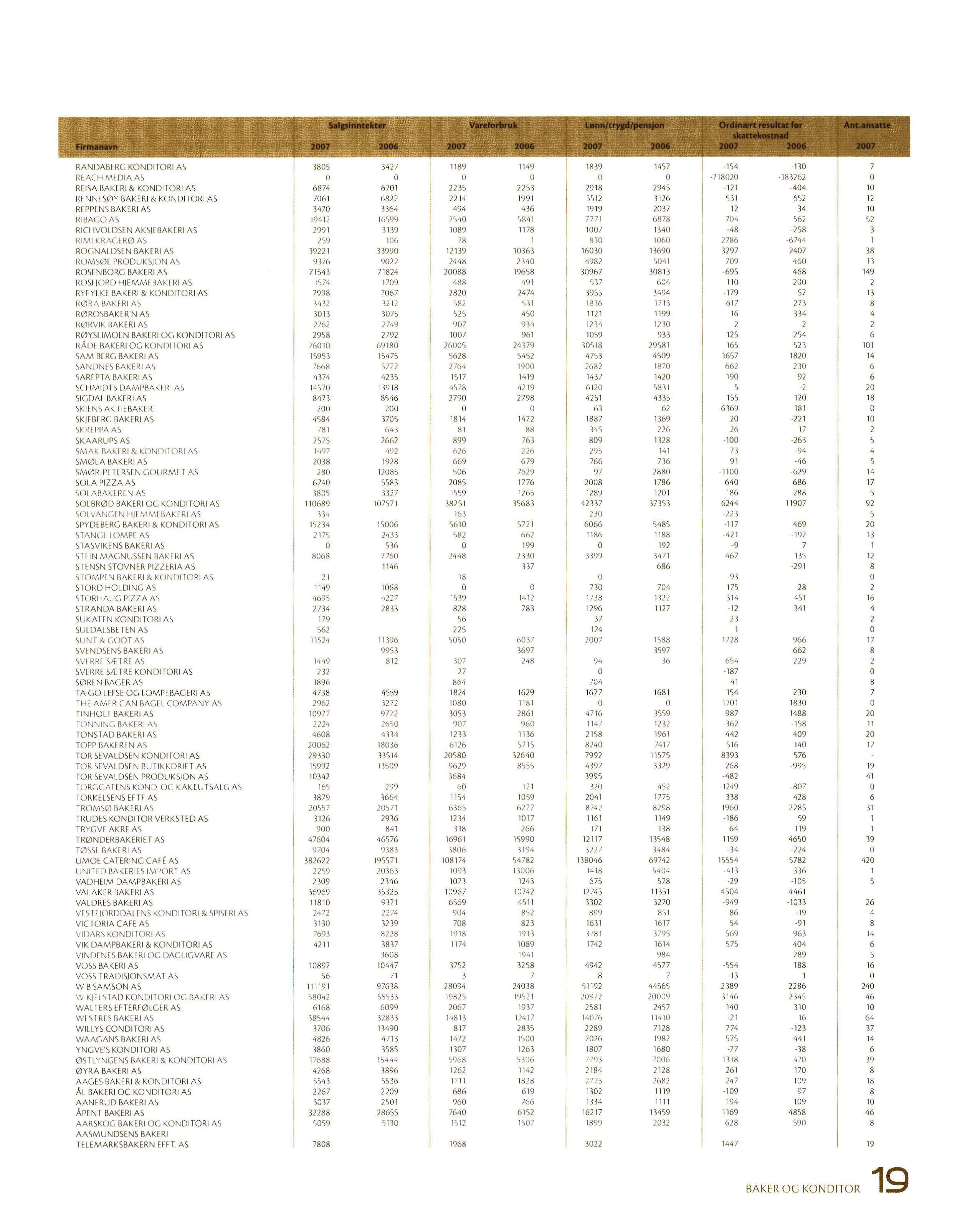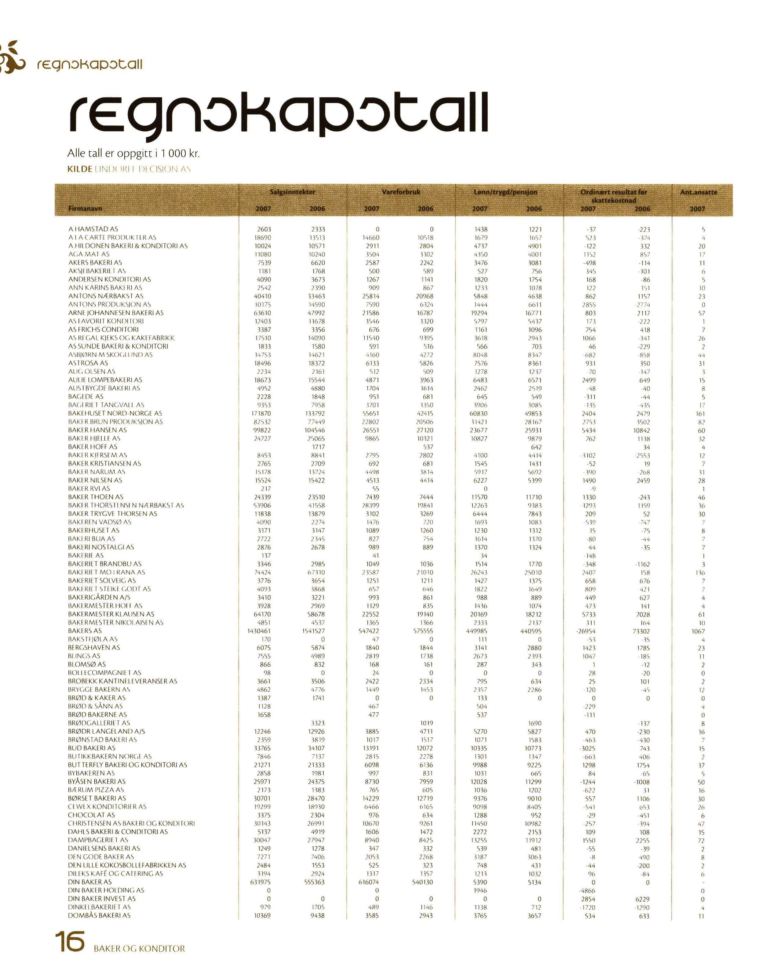 DENNE GANG presenterer vi regn skap stall fra baker- og kondi tor br ansien for 2007. Det gjør vi ikk e for å tilfr edssti ll e fo lks nysgjerrighet, men for ac det ska l være mulig å se egne ta ll og prescasion er i forho ld til sammenl ignbare bedr ift e r. Det har vi tenkt å gjøre hver høst. Vi håper dere alle ser nytteverdien og bruker det akt ivt.