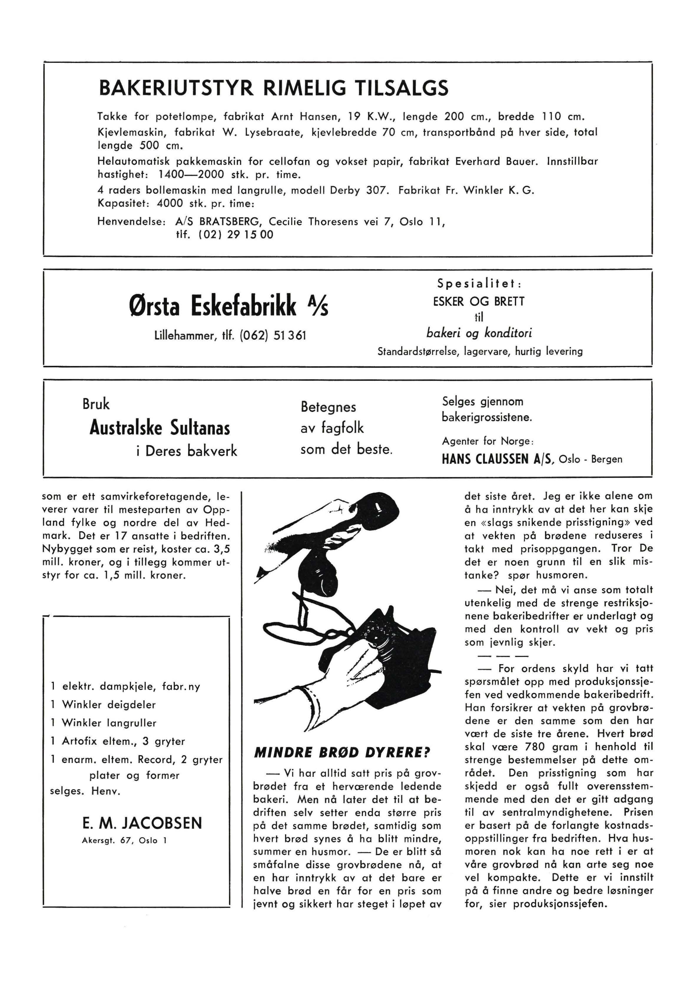 Bakermester Hans Sørum i firma H. Sørum NS, Lier sier det slik : «Maskinen har rasjonalisert hele brødpakk i ngen Det er gledelig at en norsk bedrift har løst spørsmålet på en så rimelig måte»