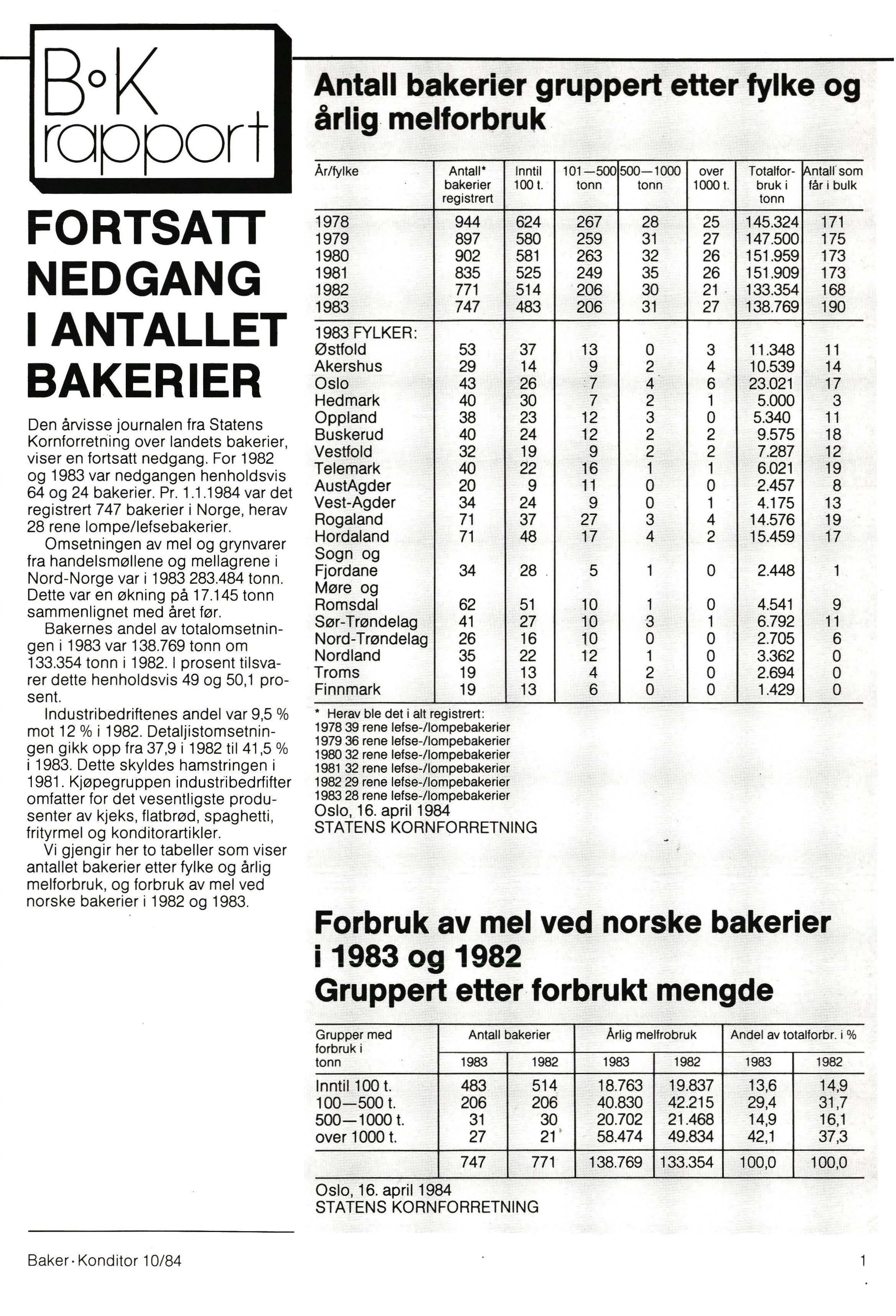 Den årvisse journalen fra Statens Kornforretning over landets bakerier , viser en fortsatt nedgang. For 1982 og 1983 var nedgangen henholdsvis 64 og 24 bakerier Pr 1.1 1984 var det registrert 747 bakerier i Norge, herav 28 rene lompe/lefsebakerier . Omsetningen av mel og grynvarer fra handelsmøllene og mellagrene i Nord-Norge var i 1983 283.484 tonn Dette var en økning på 17.145 tonn sammenlignet med året før.