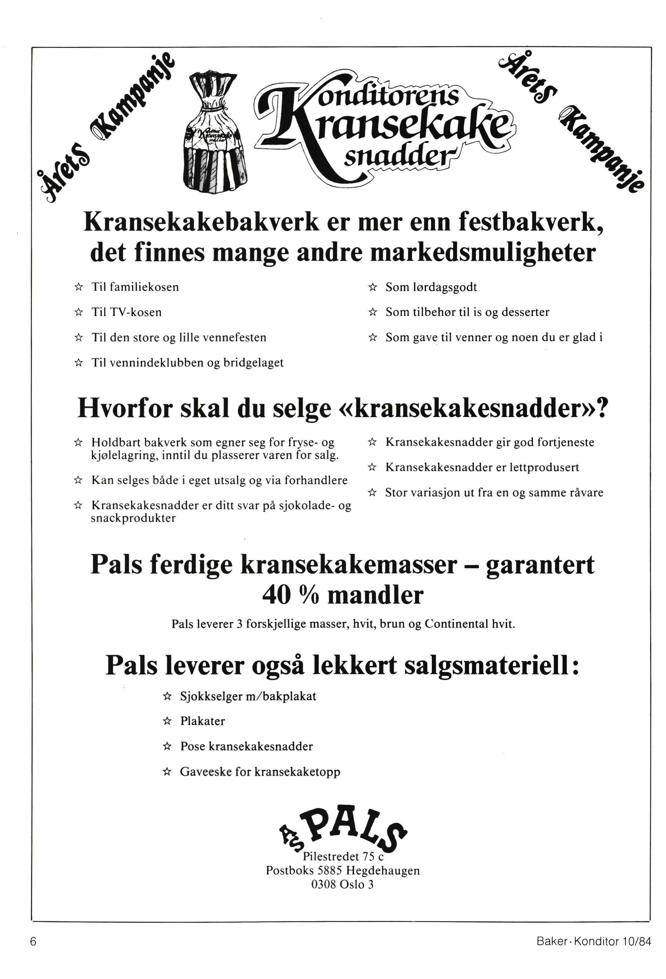 Det mener i alle fall konditorgruppen I samarbeid med Pals har de fått utarbeidet materiell til «Konditorgruppens Kransekakekampanje 1984 ».