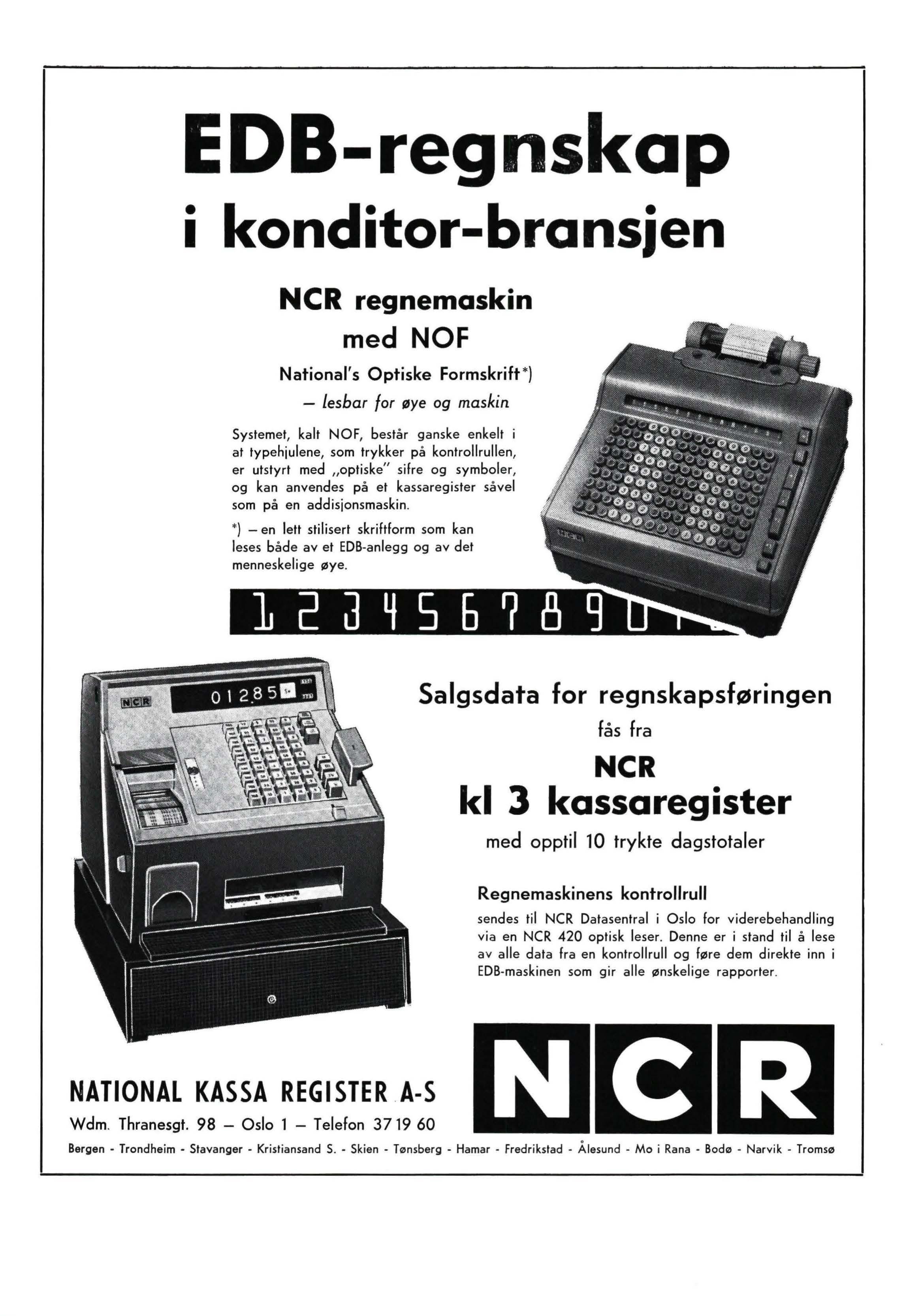sendes til NCR Datasentral i Oslo for viderebehandling via en NCR 420 optisk leser Denne er i stand til å lese av alle data fra en kontrollrull og føre dem direkte inn i EDB-maskinen som gir alle ønskelige rapporter