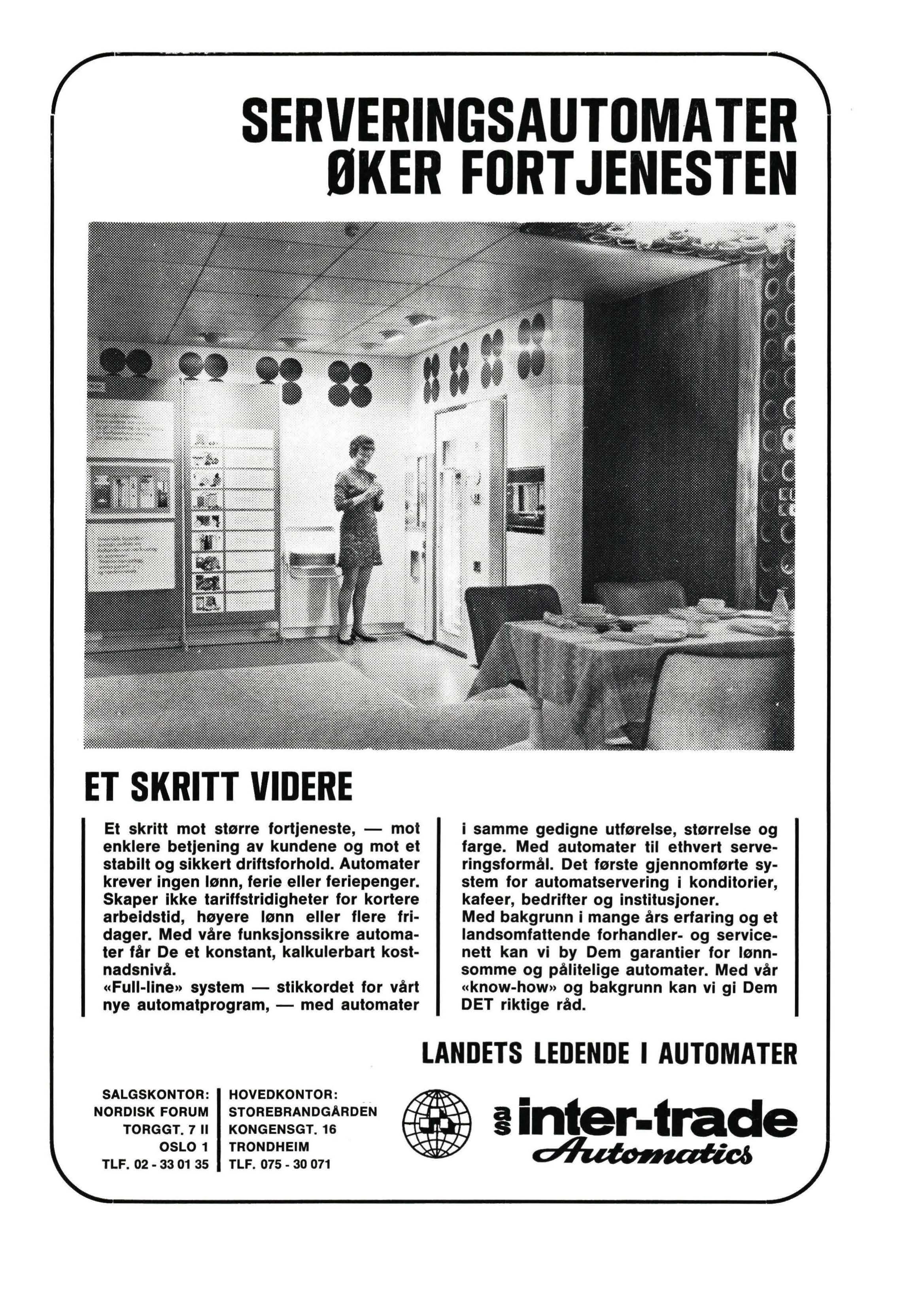 i samme gedigne utførelse, størrelse og farge. Med automater til ethvert serveringsformål. Det første gjennomførte system for automatservering i konditorier, kafeer, bedrifter og institusjoner. Med bakgrunn i mange års erfaring og et landsomfattende forhandler- og servicenett kan vi by Dem garantier for lønnsomme og pålitelige automater. Med vår «know-how» og bakgrunn kan vi gi Dem DET riktige råd.
