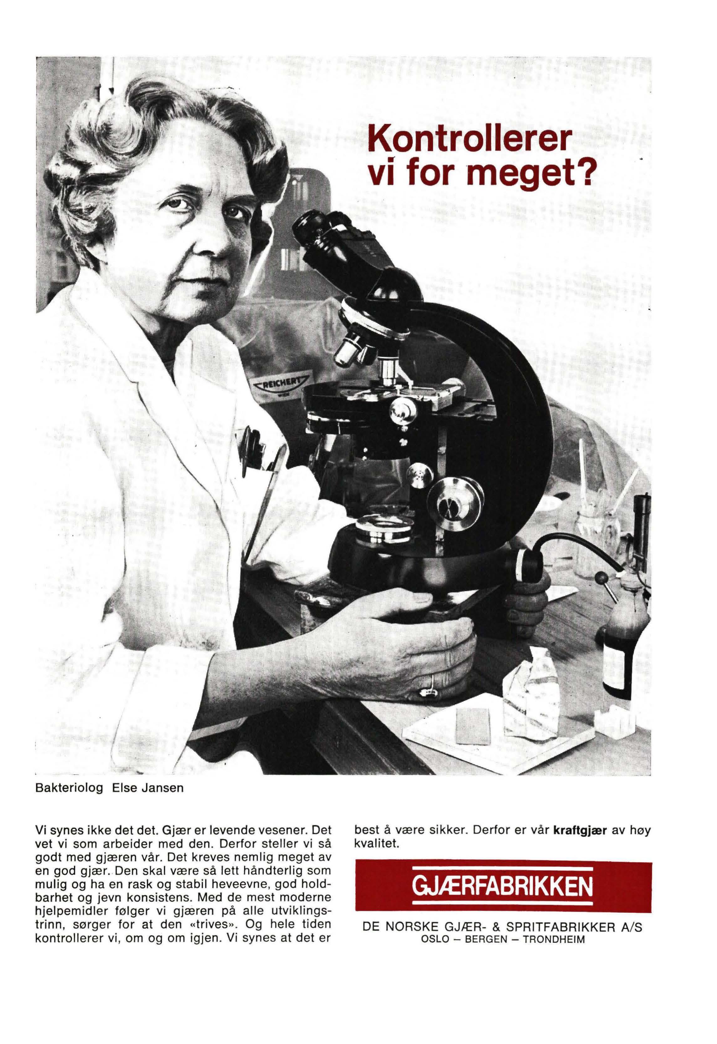 Vi synes ikke det det. Gjær er levende vesener. Det vet vi som arbeider med den. Derfor steller v i så godt med gjæren vår. Det kreves nemlig meget av en god gjær Den skal være så lett håndterlig som mulig og ha en rask og stabil heveevne , god holdbarhet og jevn konsistens Med de mest moderne hjelpemidler følger vi gjæren på alle utviklingstrinn, sørger for at den «trives ». Og hele tiden kontrollerer vi , om og om igjen Vi synes at det er