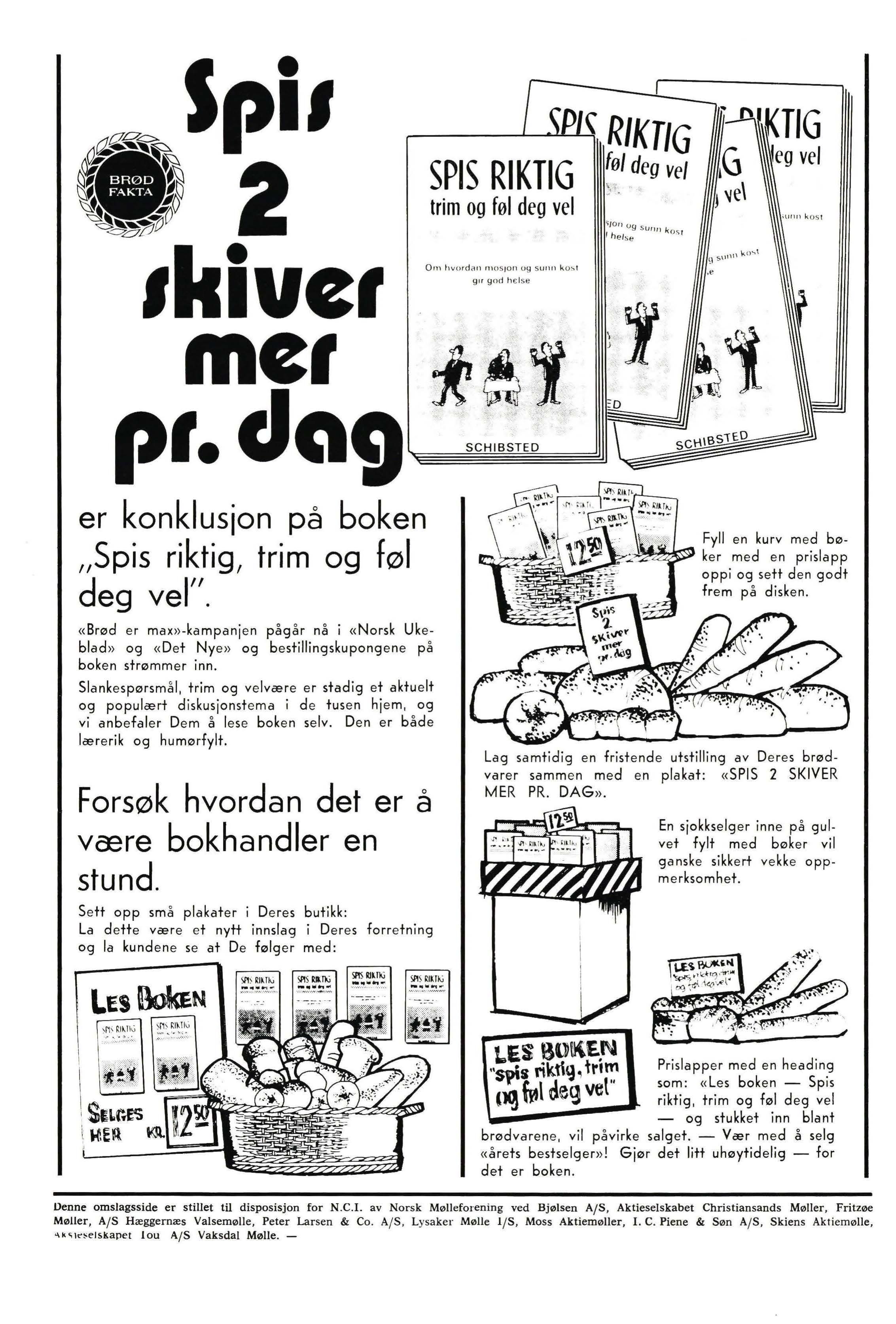 Lag samtidig en fristend e utstilling av Deres brødvarer sammen med en plakat: « SPIS 2 SKIVER MER PR. DAG » .