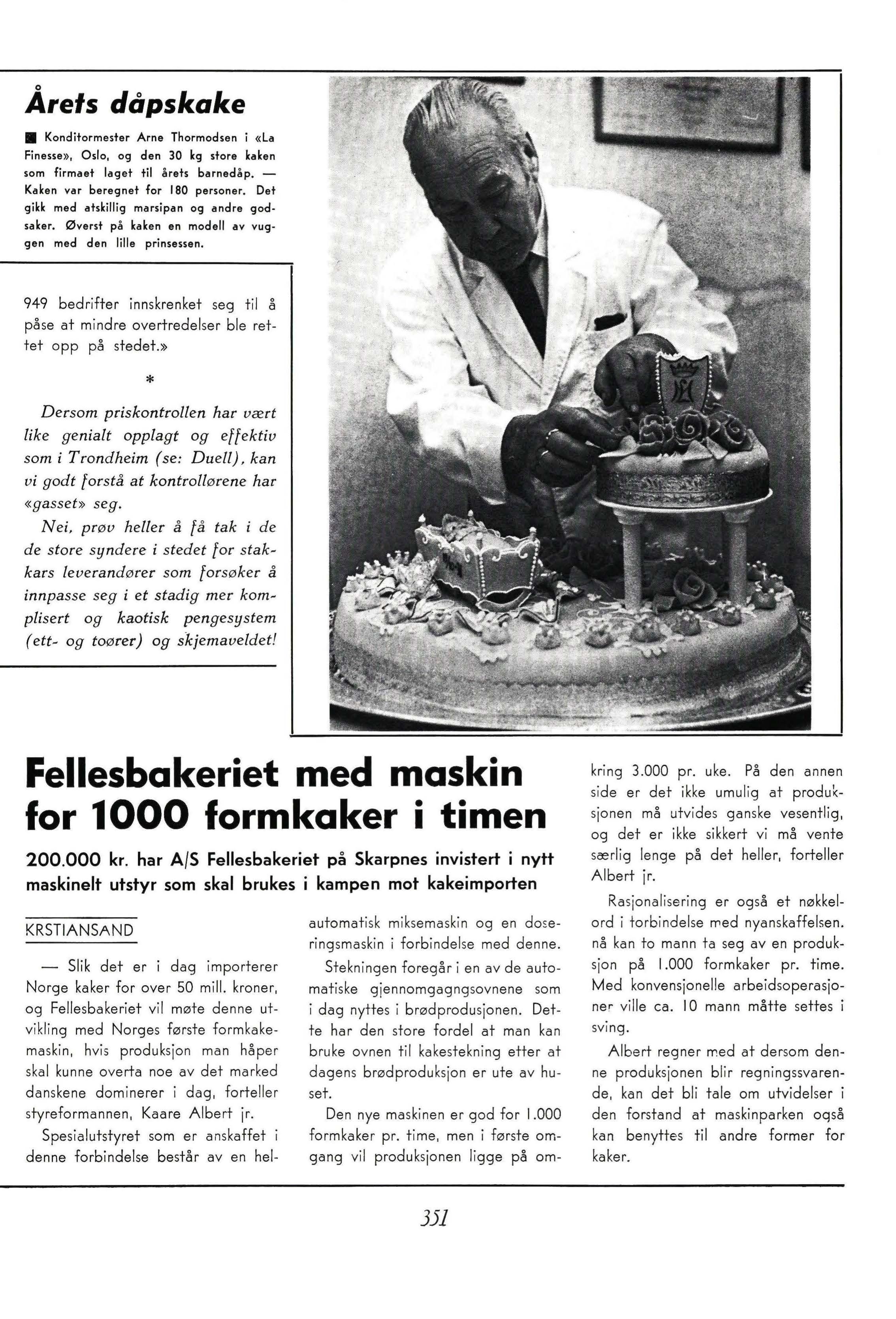 Konditormester Fra n k M a I m nes legger siste hånd p å kaken som Oslo Bakerog Konditorlaug sendte som sin hilsen til prinsesse-d å pen Kaken var formet som et « overflødighetshorn » og det gikk med hele ti ki lo kransekakemasse og å tte kilo konfekt Oslolaugets oldermann, Per Samson , følger nøye med i arbeidet.
