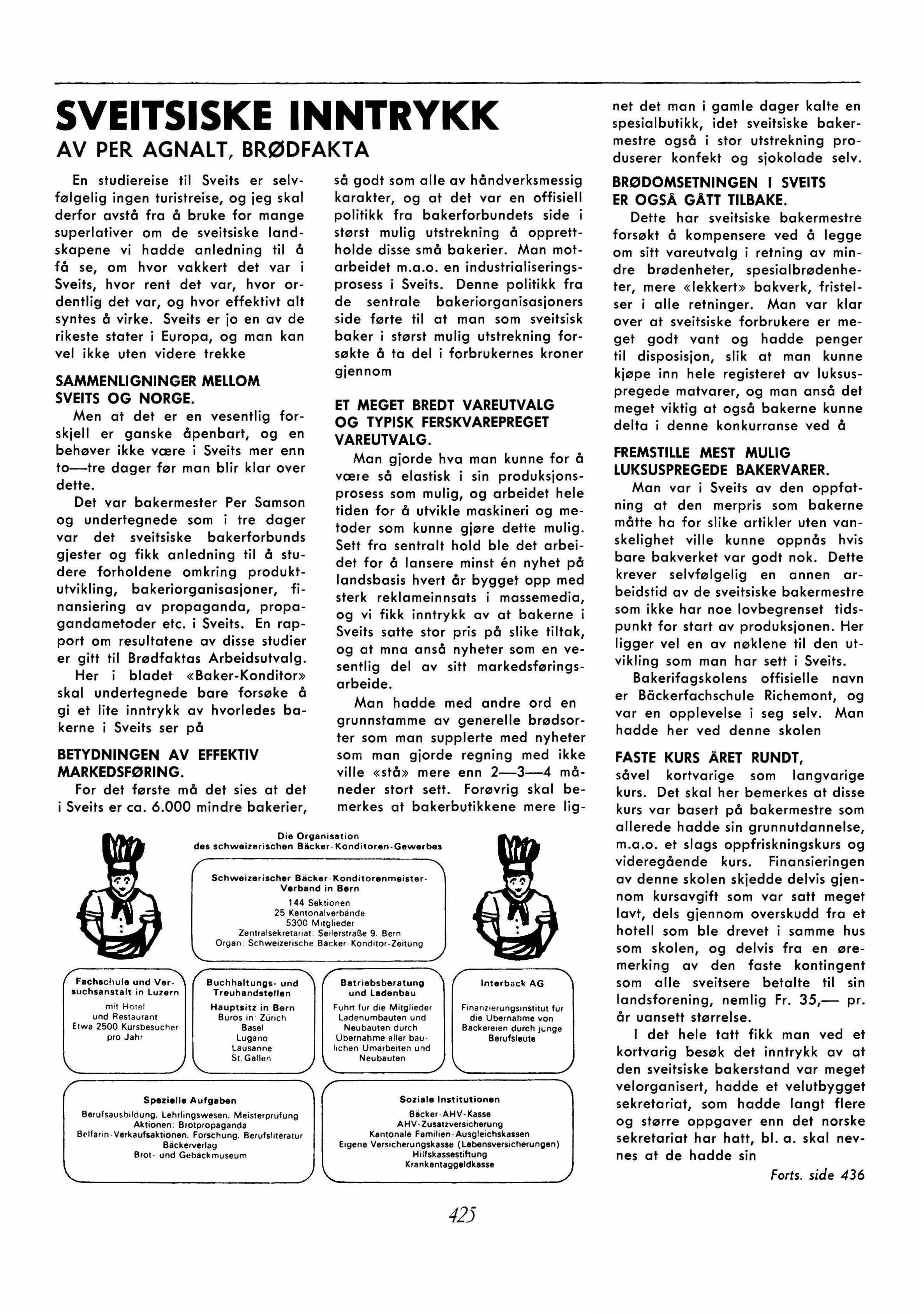 Det er forøvrig meget verdifullt å kunne foreta slike studiereiser fra tid til annen, og skulle noen av de norske bakermestre ønske å reise til bakerifagskolen i Sveits eller delta i et kurs der, vil undertegnede kunne opprette den kontakt som er nødvendig. Vi ble meget godt mottatt, og det var generaldirektøren for det sveitsiske bakeriforbund og presideten i det sveitsiske bakerforbund som i tre dager var personlig attachert til bakermester Samson og undertegnede