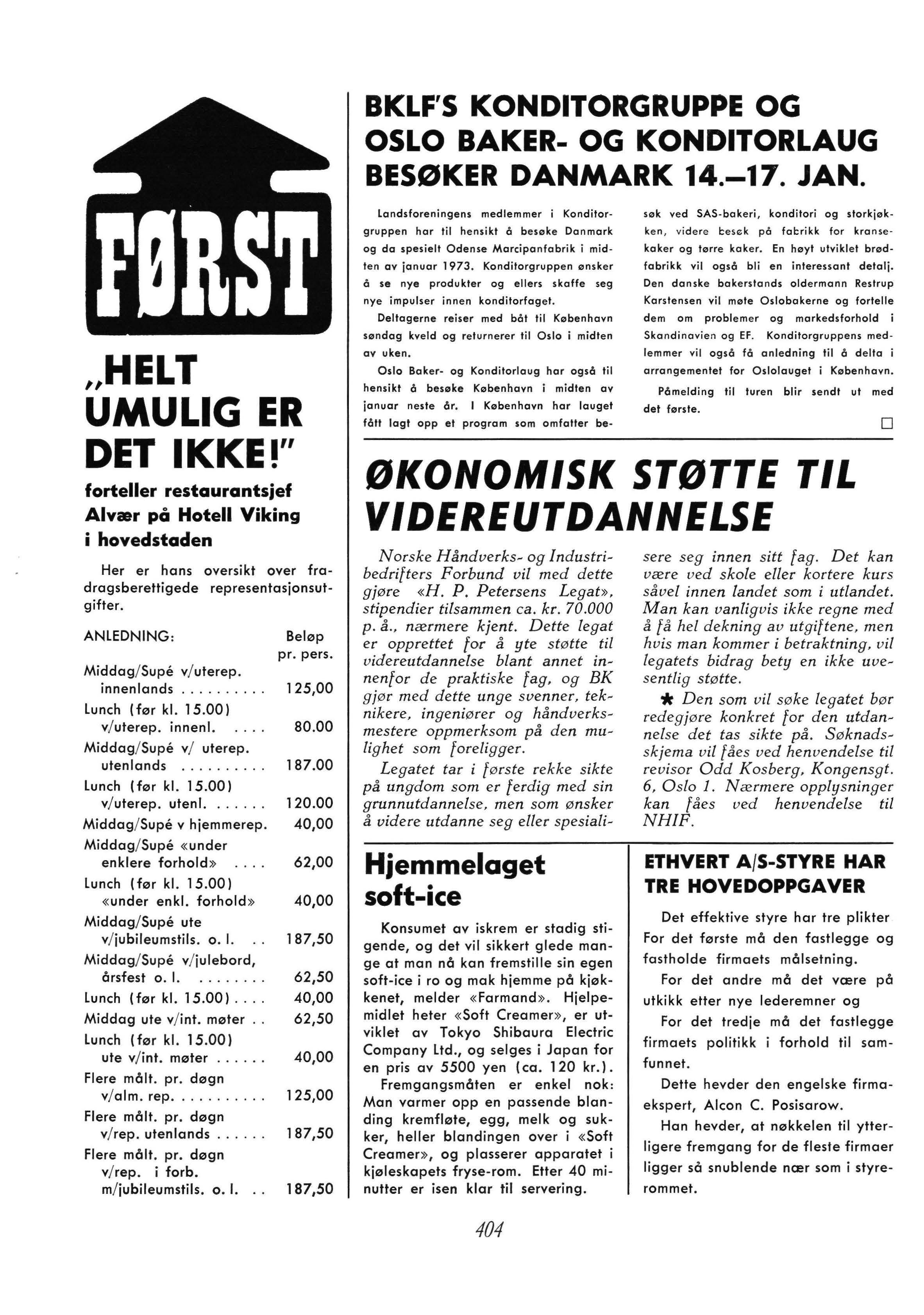 Landsforeningens medlemmer i Konditorgruppen har til hensikt å besøke Danmark og da spesielt Odense Marcipanfabrik i midten av januar 1973. Konditorgruppen ønsker å se nye produkter og ellers skaffe seg nye impulser innen konditorfaget.
