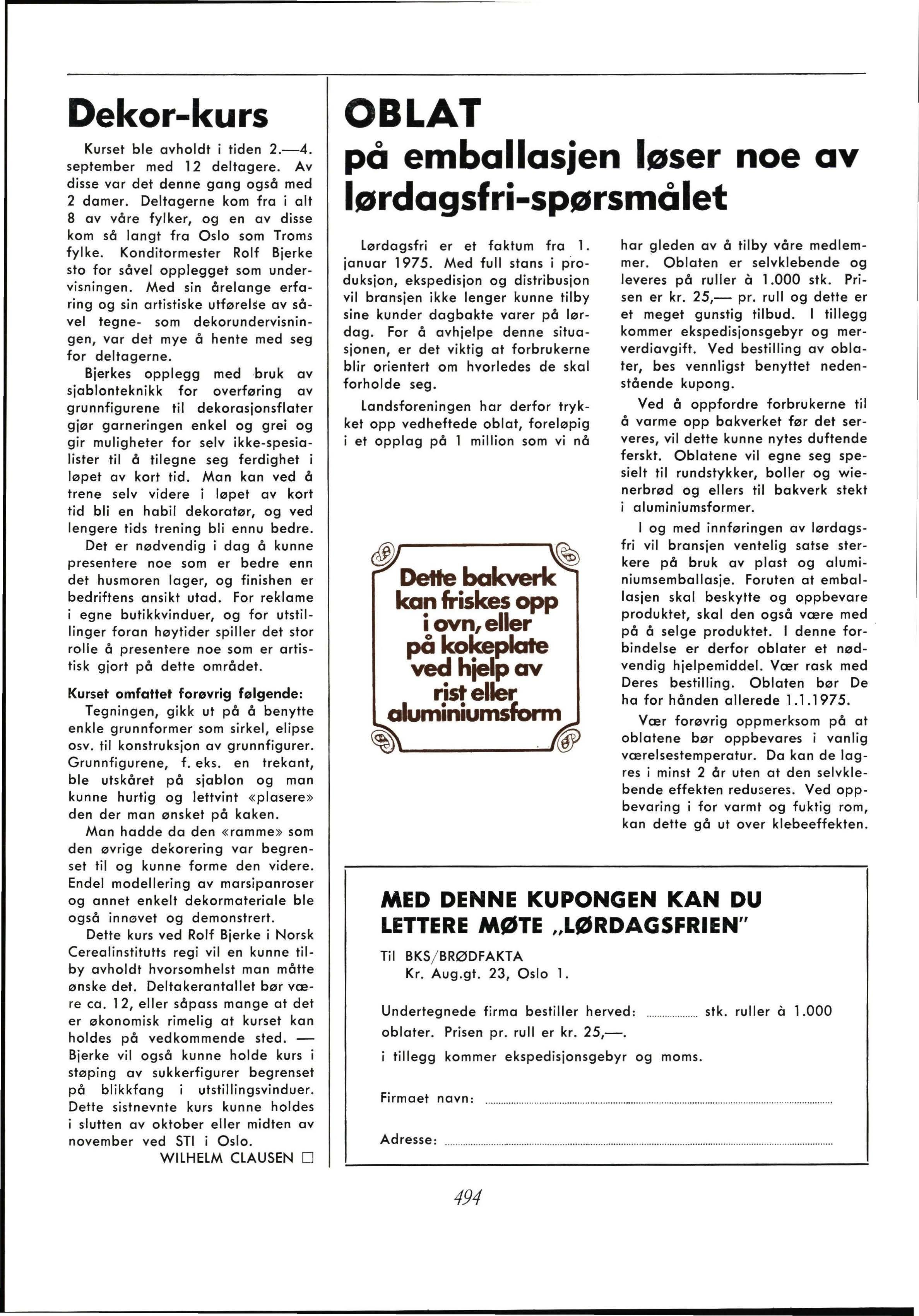 I og med innføringen av lørdagsfri vil bransjen ventelig satse sterkere på bruk av plast og aluminiumsemballasje Foruten at emballasjen skal beskytte og oppbevare produktet, skal den også være med på å selge produktet. I denne for- · bindelse er derfor oblater et nødvendig hjelpemiddel. Vær rask med Deres bestilling. Oblaten bør De ha for hånden allerede 1.1.1975.