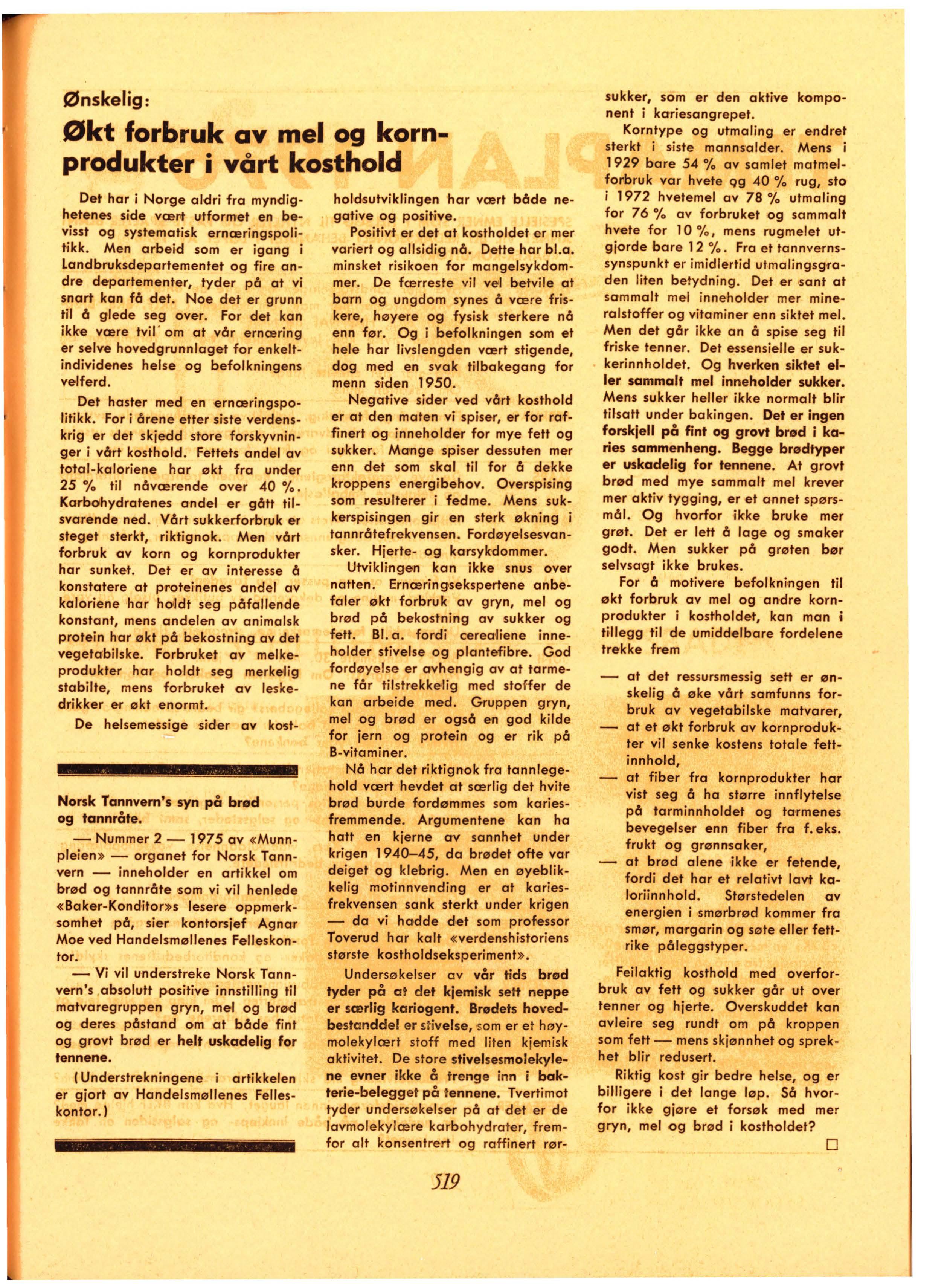 - Nummer 2 - 1975 av « Munnpleien » - organet for Norsk Tannvern - inneholder en artikkel om brød og tannråte som vi vil henlede «Baker-Konditor»s lesere oppmerksomhet på, sier kontorsjef Agnar Moe ved Handelsmøllenes Felleskontor.
