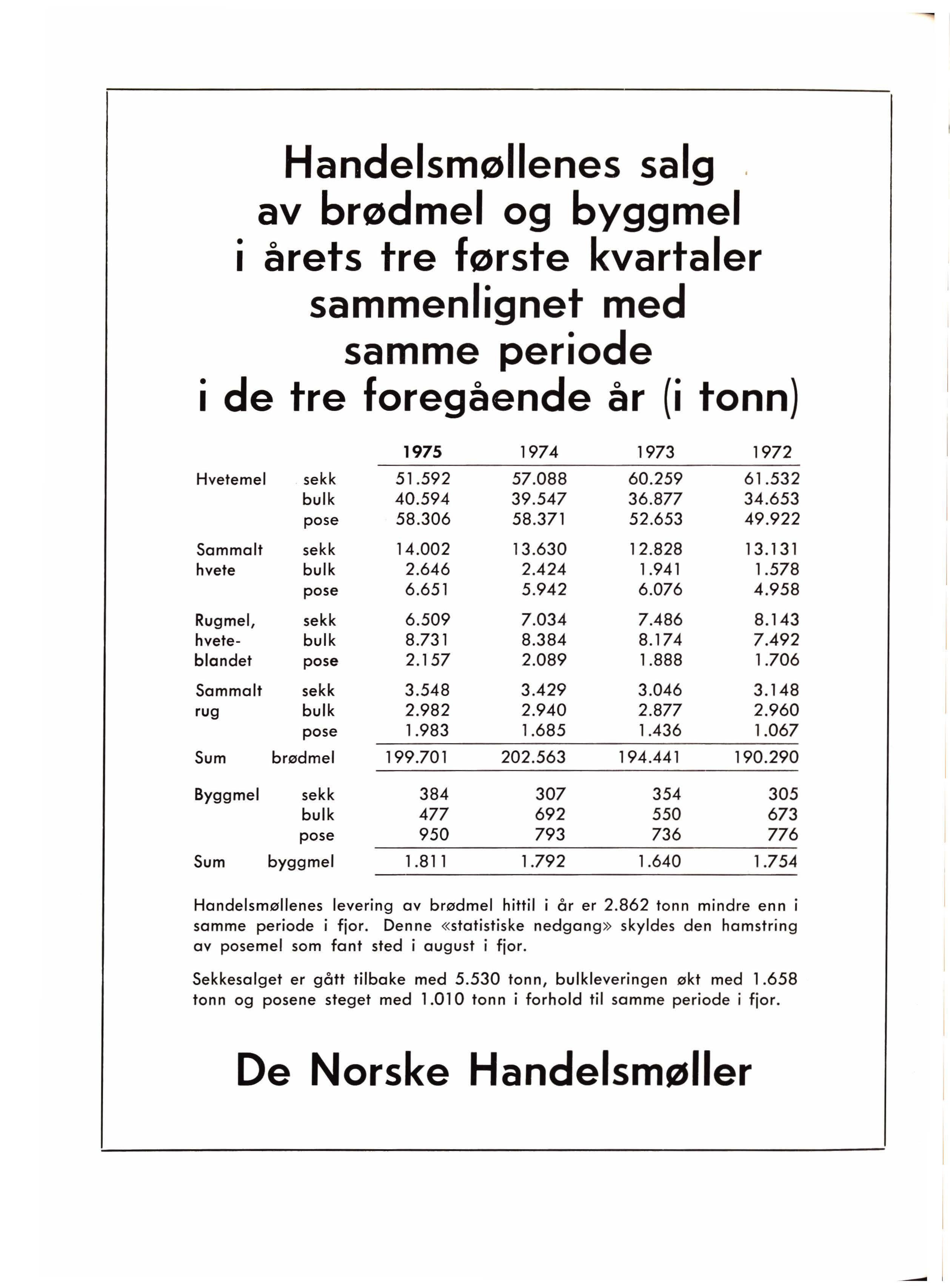 Handelsmøllenes levering av brødmel hittil i år er 2.862 tonn mindre enn i samme periode i fjor. Denne « statistiske nedgang » skyldes den hamstring av posemel som fant sted i august i fjor.