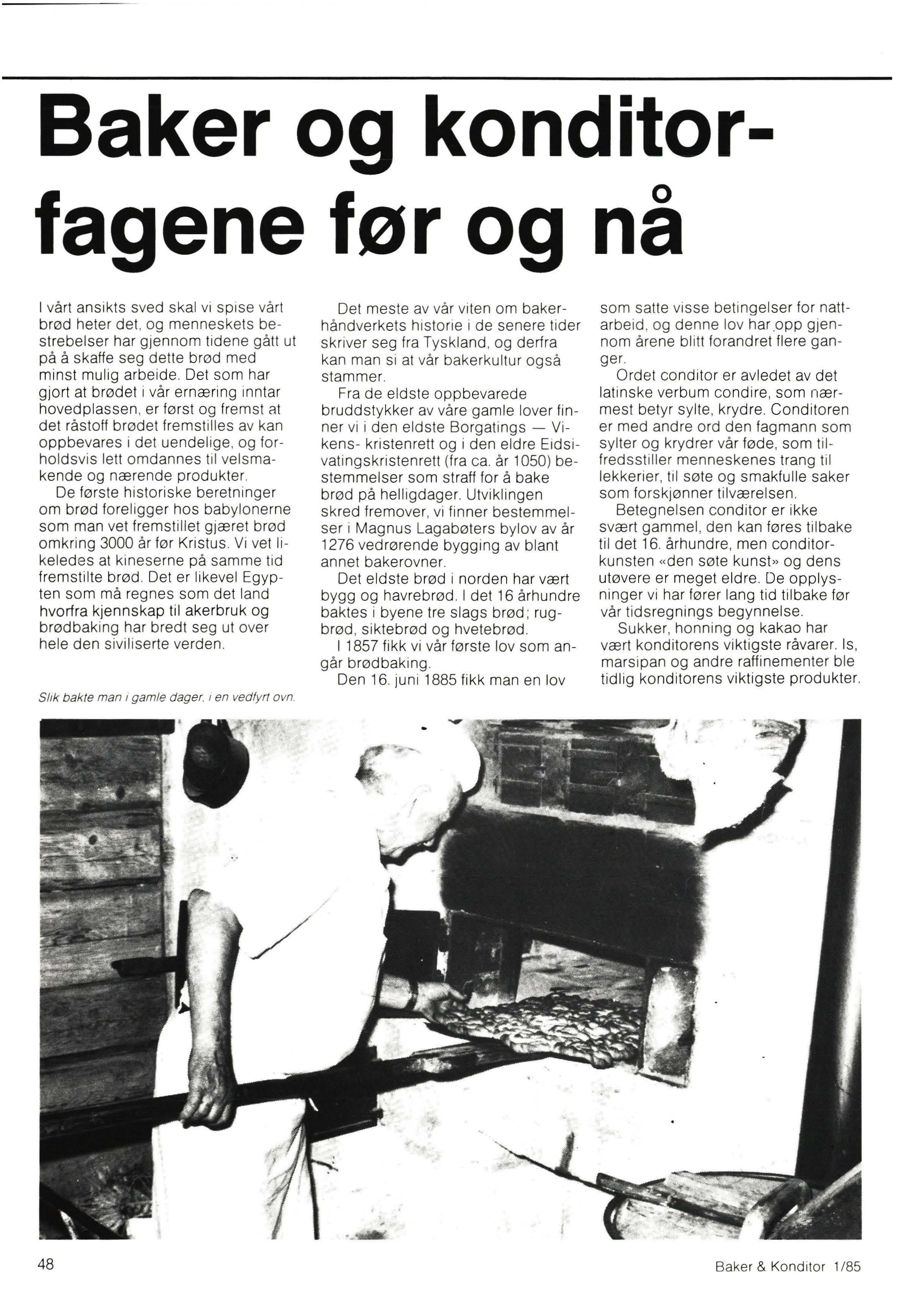 Fra de eldste oppbevarede bruddstykker av våre gamle lover finner vi i den eldste Borgat ings - Vikens- kristenrett og i den eldre Eidsivatingskristenrett (fra ca. år 1050) bestemmelser som straff for å bake brød på helligdager. Utviklingen skred fremover , vi finner bestemmelser i Magnus Lagabøters bylov av år 1276 ved rørende bygging av blant annet bakerovner