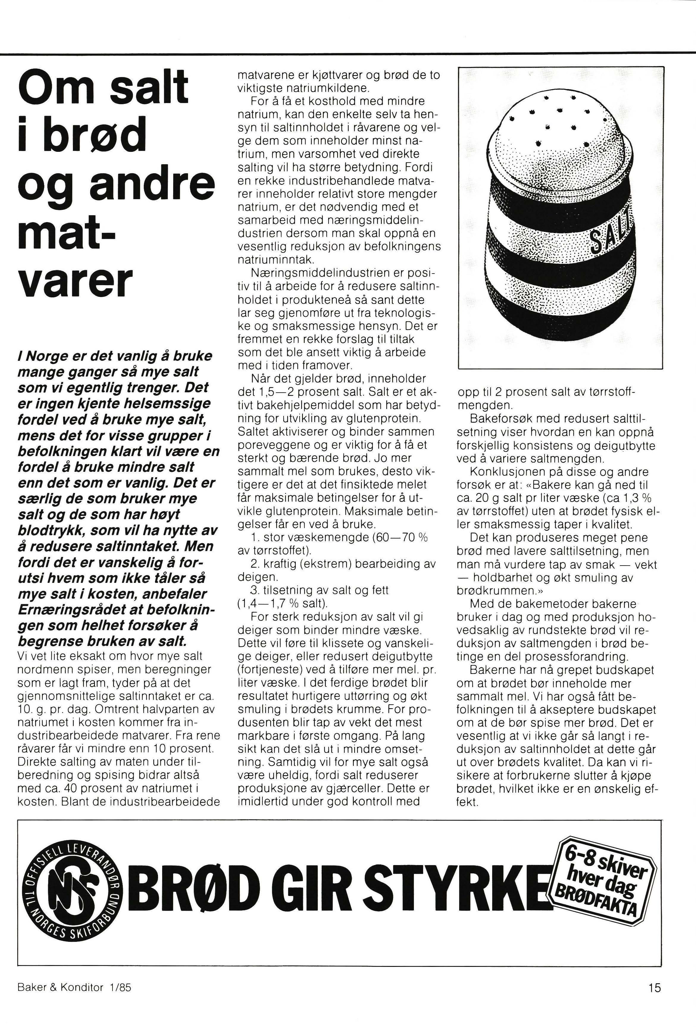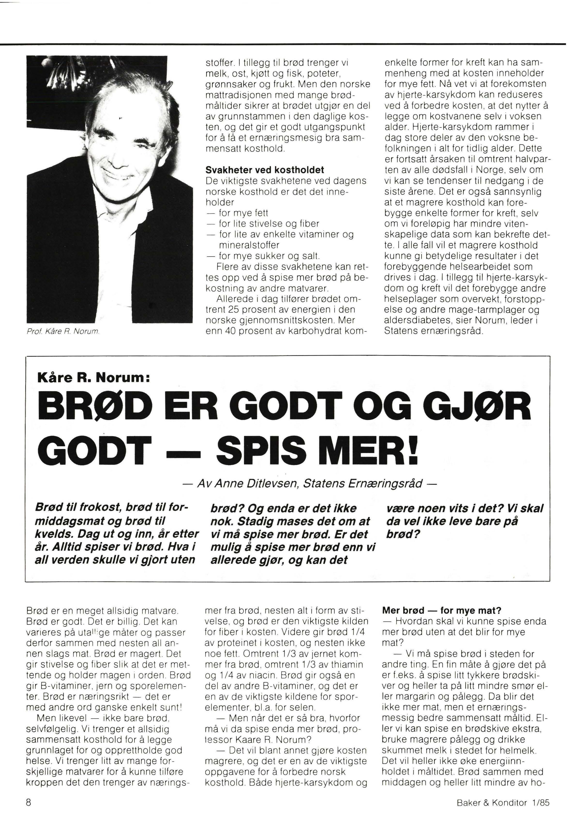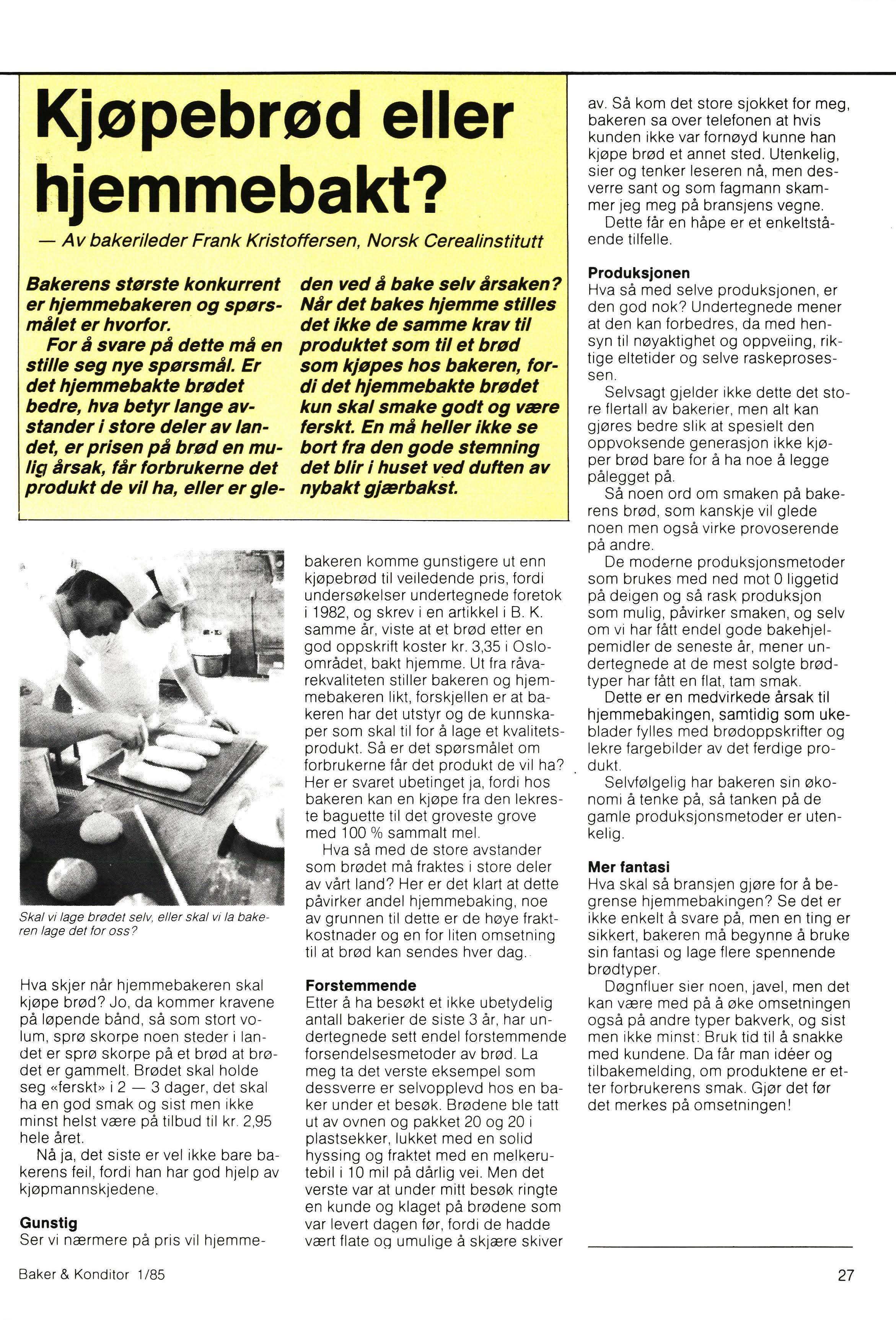 Norge spises det relativt mye brød. Forbruket stiger stadig , noe som ikke er så helt vanlig i dagens Europa. Den viktigste grunnen til dette er selvsagt at vi gjennom årene har hatt velbakt og velsmakende brødvarer. I all beskjedenhet må en kunne hevde at dette igjen skyldes at vi har hatt en bakerstand som gjennom generasjoner har samlet seg kunnskaper og erfaring om sitt vanskelige yrke. Og yrket er vanskelig fordi man hele tiden arbeider med levende organismer som reagerer negativt på den minste feilbehandling.