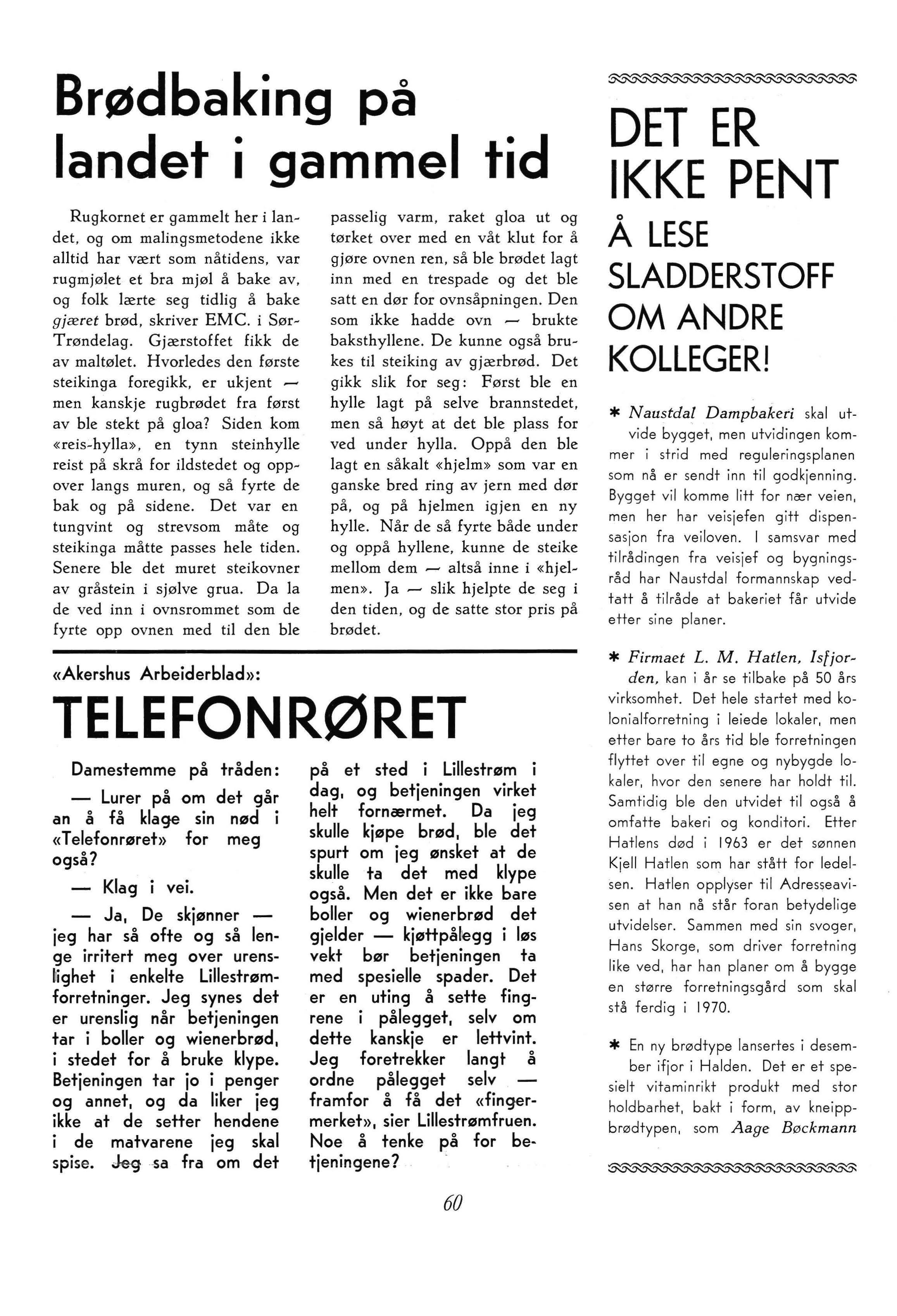 har uteksperimenter+. Bøckmann kan fortelle at man har satset omkring 200.000 kroner på to nye ovner og helautomatisk brødanlegg ved bakeriet. Det nye brødet er mønsterbeskyttet, Bøckmann har fått ideen fra utlandet, men har tilpasset brødtypen etter norsk smak og behov. - Bøckmann åpnet i samme måned en filial i Øvre Bankgate i Halden. Fra tidligere har hi:ln 3 utsalg i Fredrikstad.