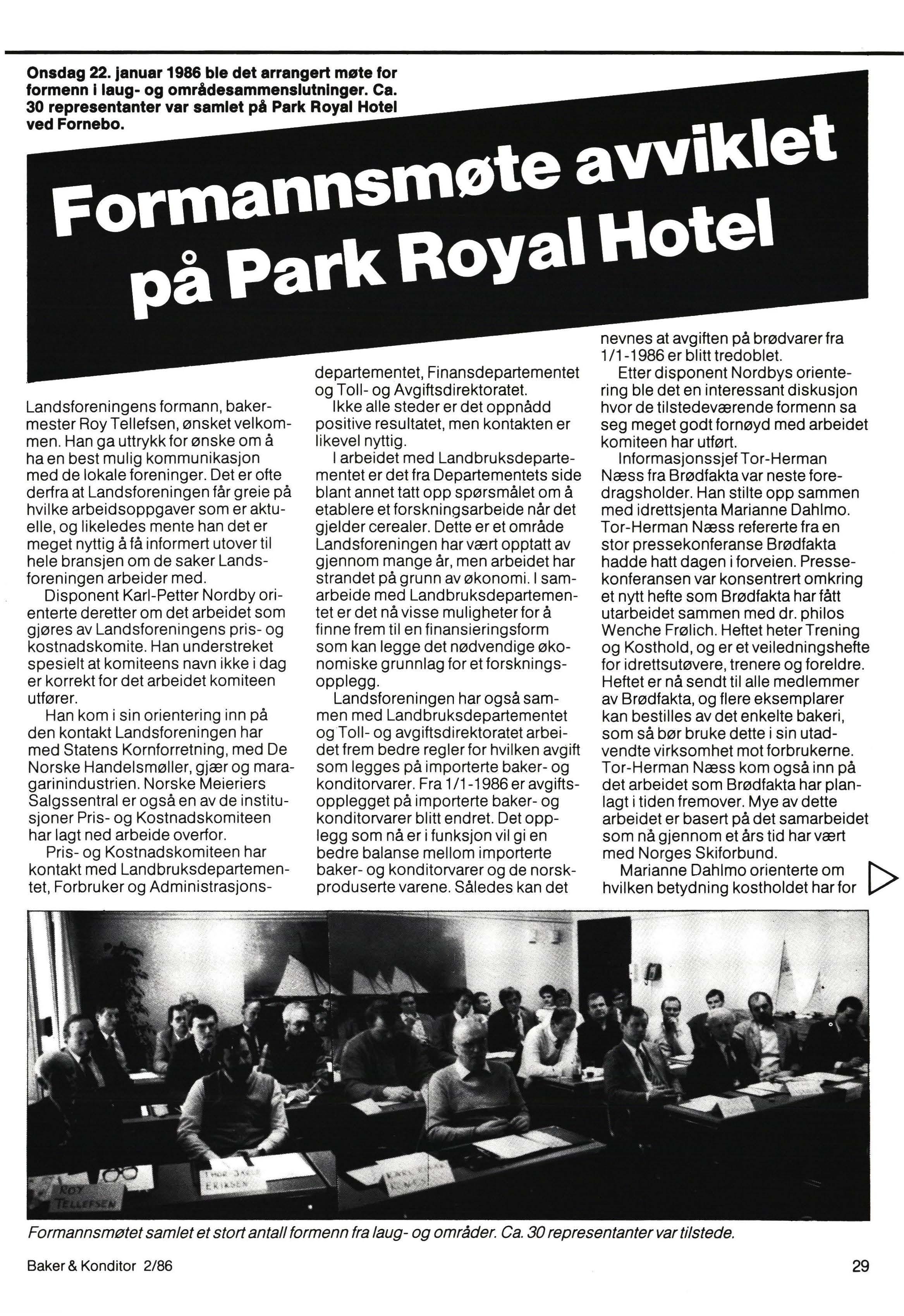 Onsdag 22. januar 1986 ble det arrangert møte for formenn I laug- og områdesammenslutninger. Ca. 30 representanter var samlet på Park Royal Hotel ved Fornebo.