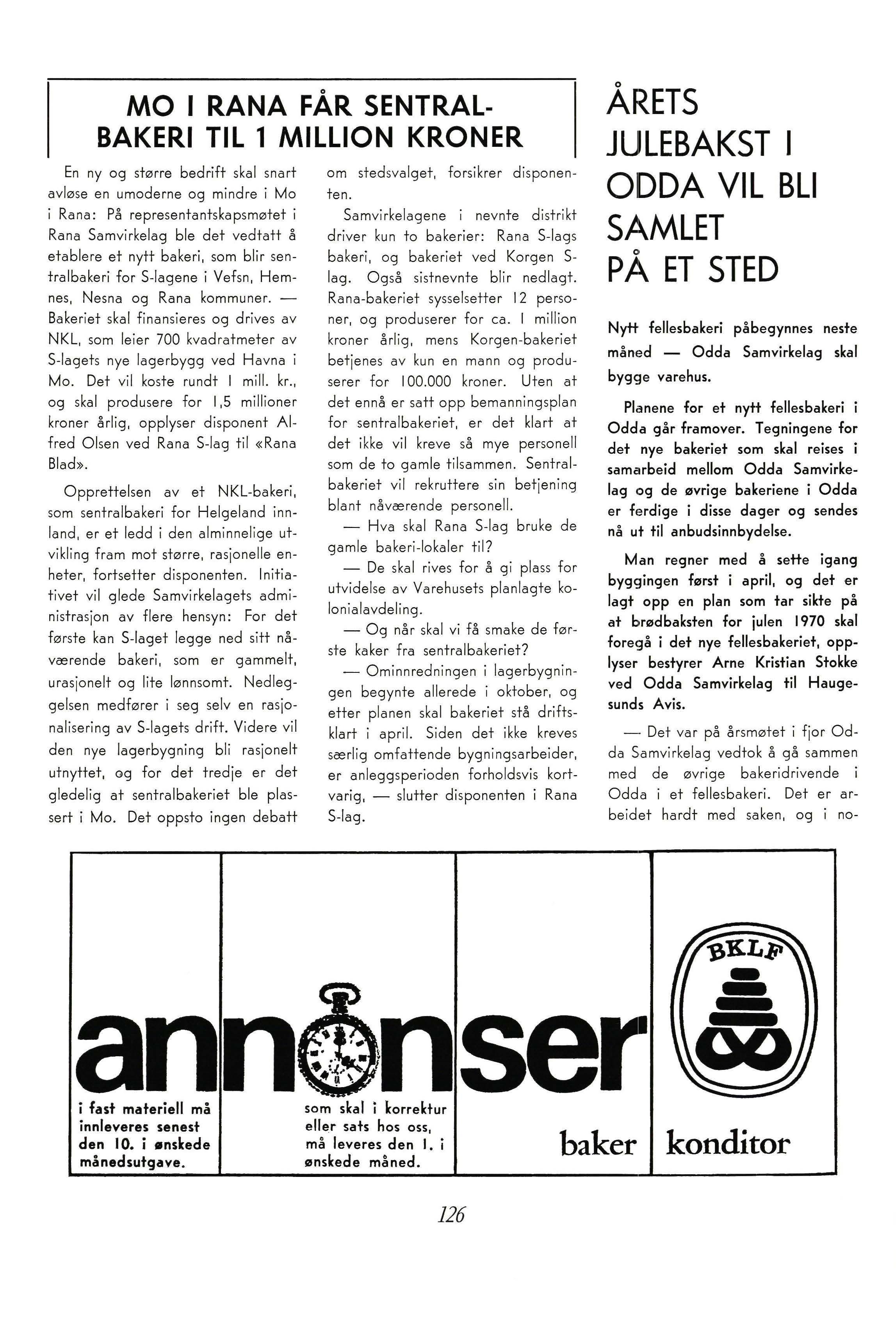 En ny og større bedrift skal snart avløse en umoderne og mindre i Mo i Rana: På representantskapsmøtet i Rana Samvirkelag ble det vedtatt å etablere et nytt bakeri, som blir sentralbakeri for S-lagene i Vefsn, Hemnes, Nesna og Rana kommunerBakeriet skal finansieres og drives av NKL, som leier 700 kvadratmeter av S-lagets nye lagerbygg ved Havna i Mo. Det vil koste rundt I mill. kr., og skal produsere for 1,5 millioner kroner årlig, opplyser disponent Alfred Olsen ved Rana S-lag til «Rana Blad».