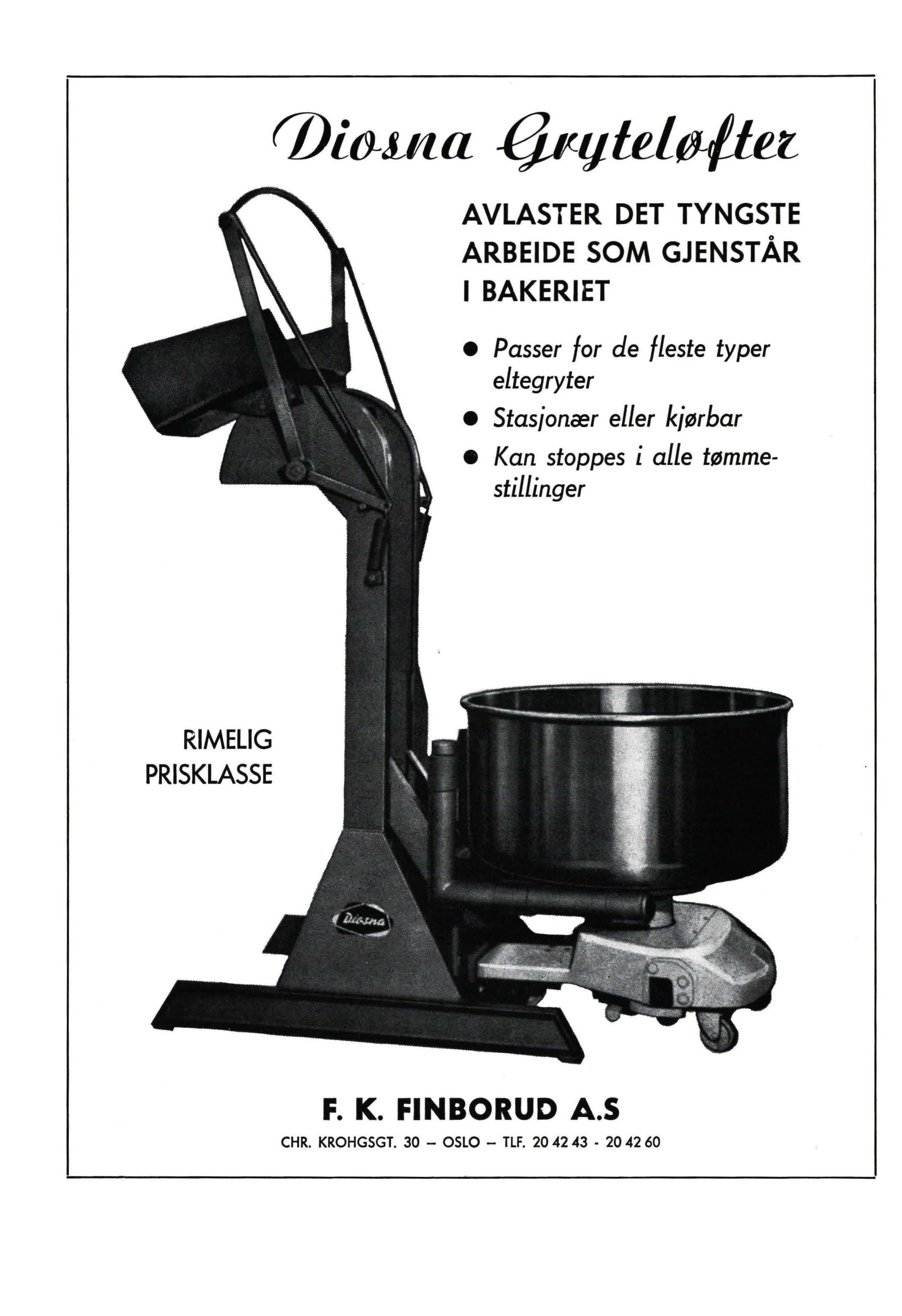 nen til at Sigernes anskaffer denne maskin, so m ven tes være driftsklar like etter påske. Mangelen på nyrekruttering til bakeryrket er en like stor årsak. Maskinen trenger bare en mann til å passe seg , og erstatter 4--5. Hele bakeprosessen overtas av maskinen. Helt fra melet slippes ned i eltemaskinen til brødet ligger ferdigpakket i hyller har maskinen hånd om prosessen Det nye er at man ikke lengere behøver å legge brøddeigen i bakerovnen - det sørger maskinen for selv. Hele anlegget koster ca. n.kr. 500.000.