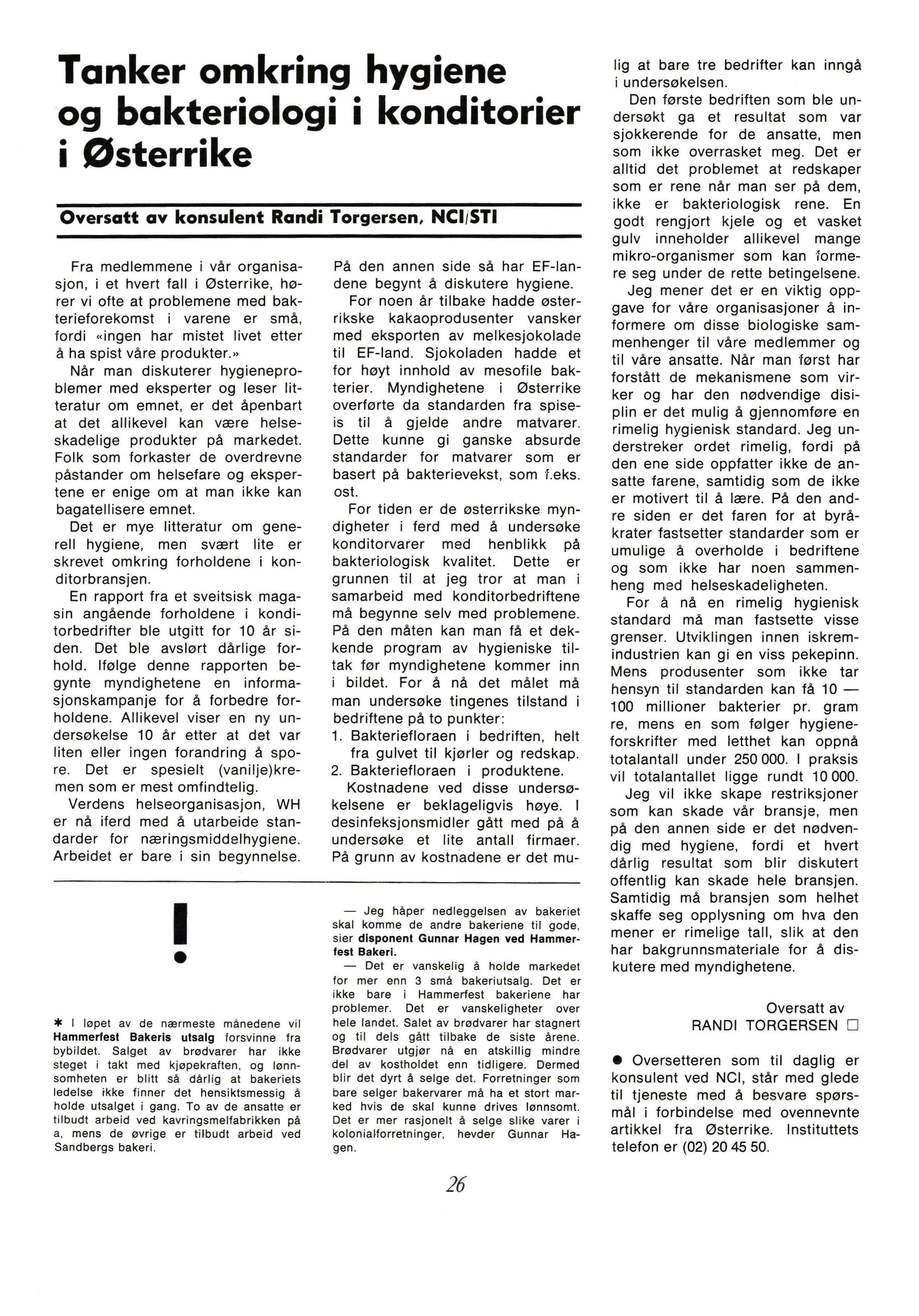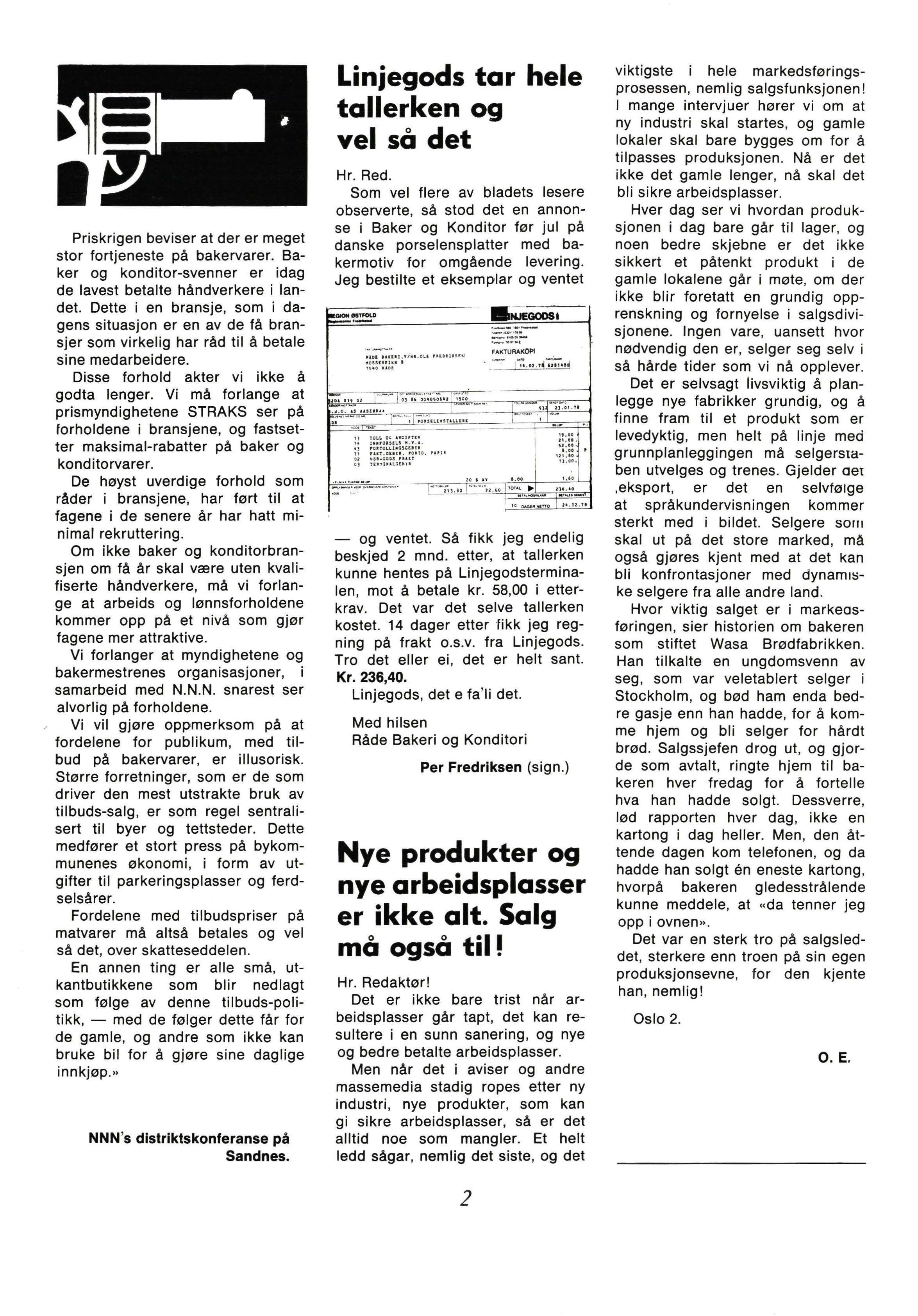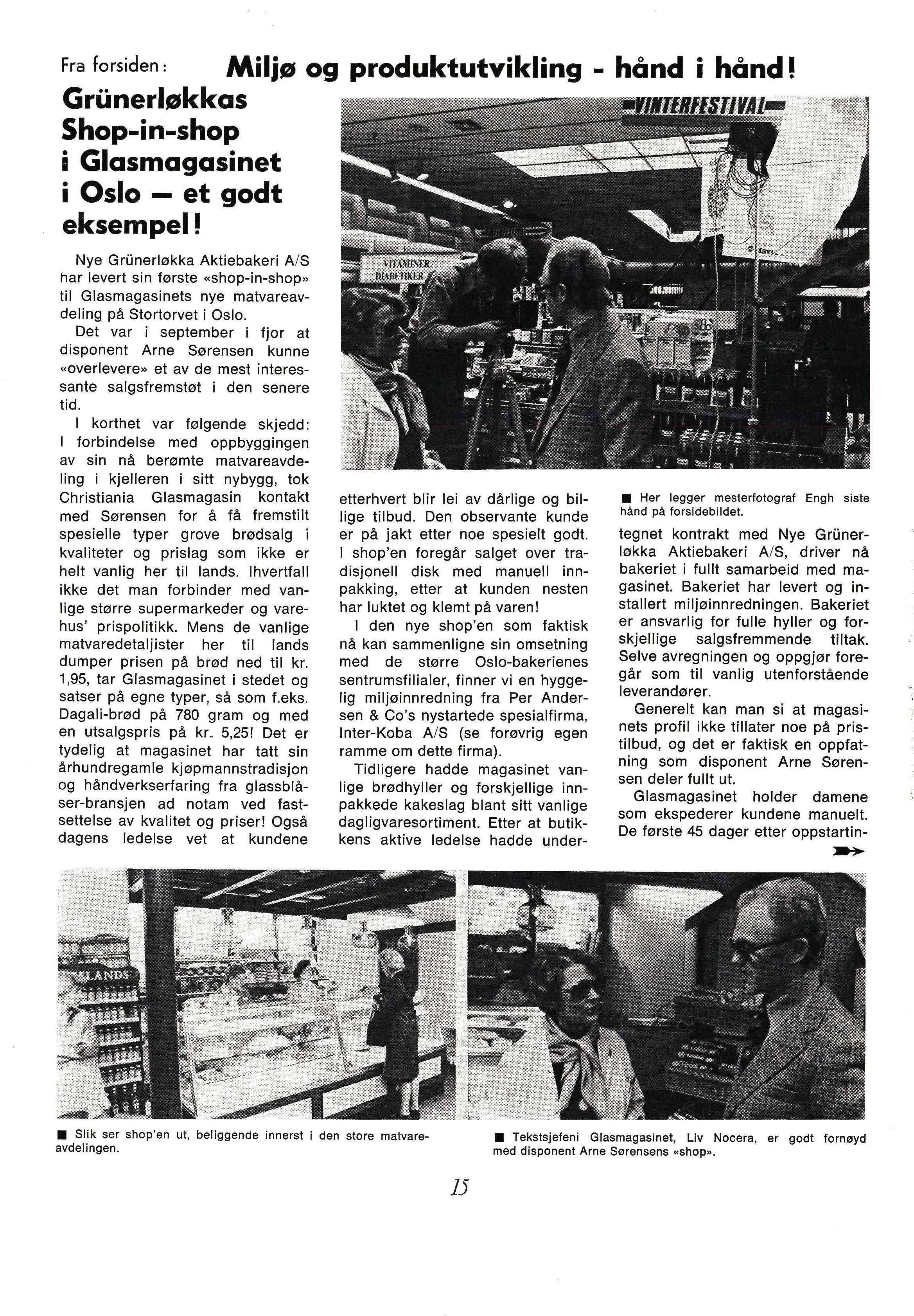 * Helge Hauer A/S på Sørumsand har store utvidelsesplaner. Bakeriet har riktignok hatt tilsvarende planer fremme før, men de har strandet hos bygningsmyndighetene Nå ser det ut til at bygningsmyndighetene I Sørum kan godkjenne de siste fremlagte planene fra firmaet , og dermed er det duket for en betydelig utvidelse av bakeriet. Hauer opplyser at utvidelse av bakeriet kan føre til en fordobling av virksomheten , og dermed en stor økning av antall ansatte. Dersom alt går etter planene vil man måtte regne med totalt 10 nye ansatte i bakeriet , forretningen og kafeteriaen, slik at firmaet totalt vil komme til å syssel sette ca 20 personer , med kvinner i stort flertall Pr idag er grunnflaten på bakeriet ca. 160 kvm. * I slutten av februar startet konditor Kjell Fylkesnes opp med eget konditori, Bømlo konditori I Fellesbakeriets bygg på Sakseid-Teen. Kjell Fylkesnes er konditor på 11. året. Det var i 1967 han tok til i konditorlære i Haugesund. Da Fellesbakeriet var en realitet i juni 1975, gikk han inn som aksjonær der , og begynte samtidig å arbeide der både i konditoravdelingen og ellers i bakeriet hvor det var behov for det Rundt nyttår ifjor fant han ut at han ville begynne å arbeide hos sin gamle arbeidsgiver i Haugesund. Noe han har gjort i ca ett år Men det var ikke hyggelig å være ukependler , mente Fylkesnes Han hadde bygd seg hus hjemme på farsgården på Fylkesnes, og der bodde familien , mens han fristet hybeltilværelsen i Haugesund fra søndag kveld til fredag Men nå skal det bli bedre! * I begynnelsen av mars overtok Sauda Bakeri et nytt toppmoderne bakeribygg. Bakeriet blir et av de største i distriktet , og har ovner og maskiner som vil gi det en kapasitet som gjør at bakeriet kan for-