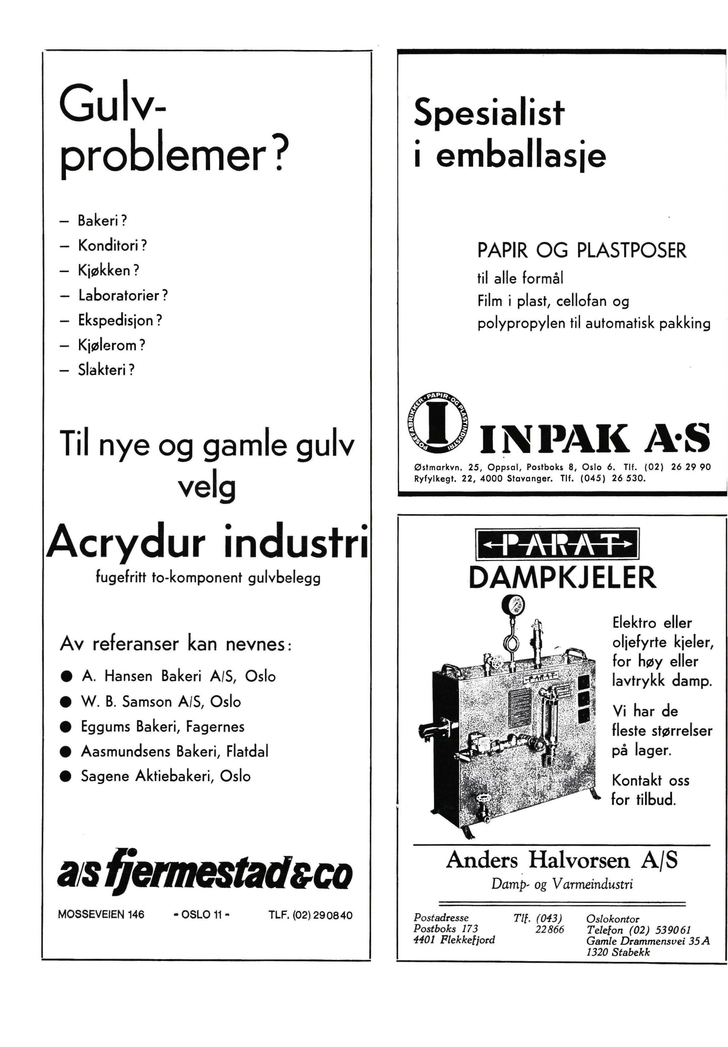 Da BK's utsendte besøkte lnpak A/ S ' store produksjonsanlegg på Oppsal øst for hovedstaden, benyttet fru Synnøve Berg anledningen til å vise frem en brødpose fra Færøyane , laget for Frants Restsorff Bakeri i Torshavn Disponent Bjelke kunne fortelle at meisteren selv abonnerer på BK og hadde der lest lnpaks emballasjeannonser! (Red v i l gjerne benytte anledningen til å minne om BK ' s store og velspredte leserskare, også på Island!)