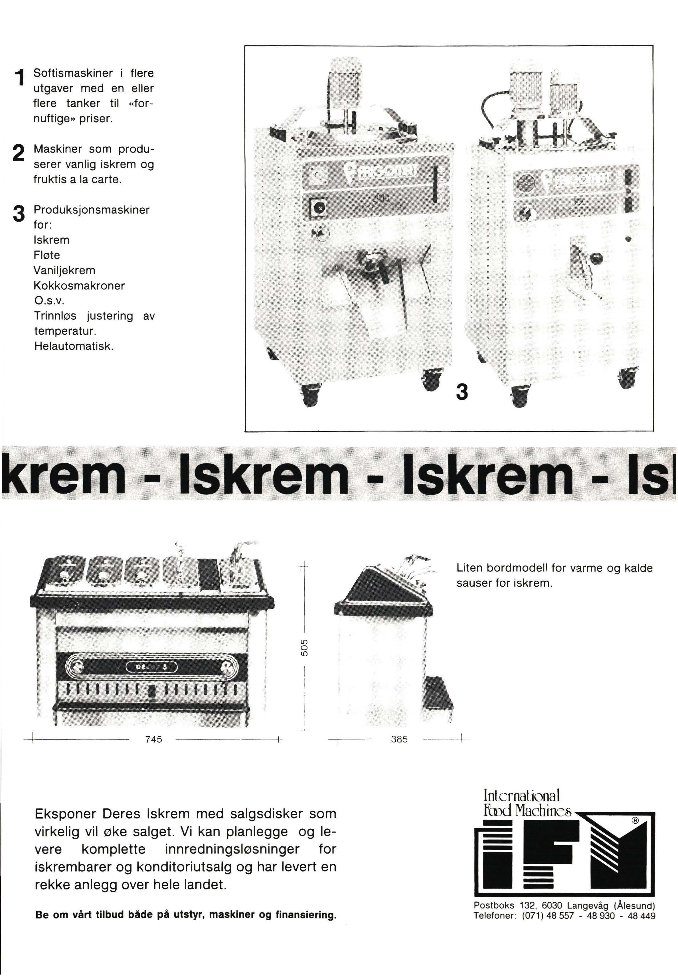 Lettere maskiner av alle slag , små verktøy , råvarer , emballasje og utstyr , arbeidstøy , pyntesaker, demonstrasjon av kakepynting, spesialsydd EDB program for mindre og mellomstore bedrifter , rengjøringsmaskiner og hygiene m m