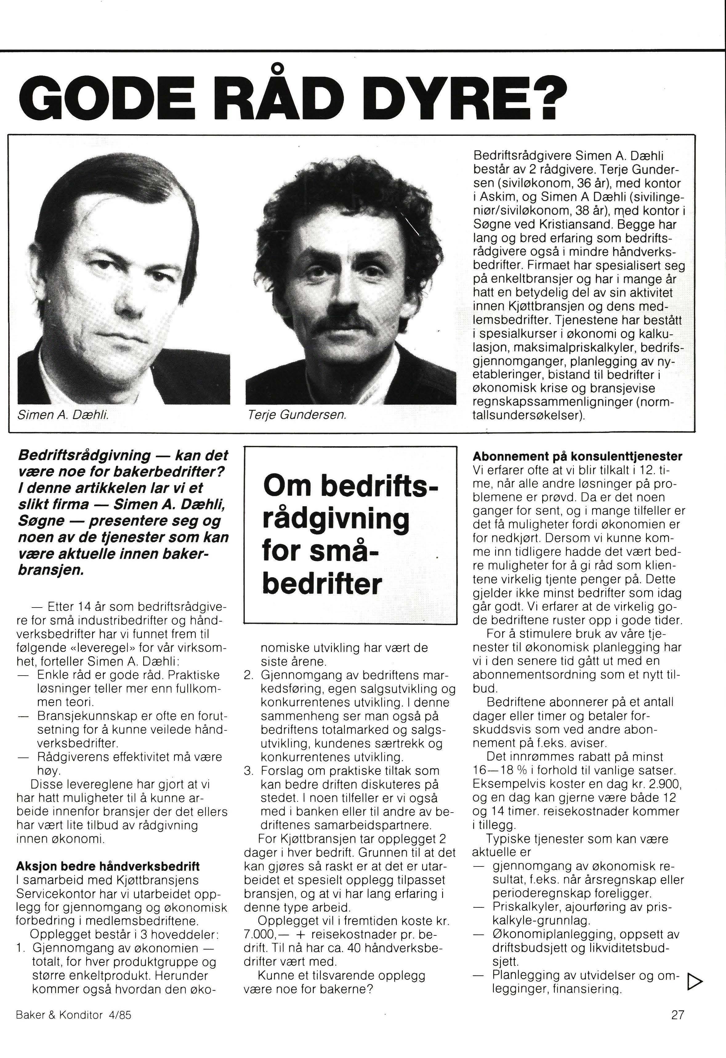 Lederkurset gjennomført i Smestad Hotel i dagene 14 -15. og 16. januar 1985 ble en ny suksess Uttalelsene til bakermester Gjengedal fra Gol Bakeri og Konditori etter kurset kan stå som en fellesnevner for alle de øvrige. Han sa det slik Jeg har lært meg selv bedre å kJenne En stor tankevekker Det mest lærerike kurs jeg har vært med på