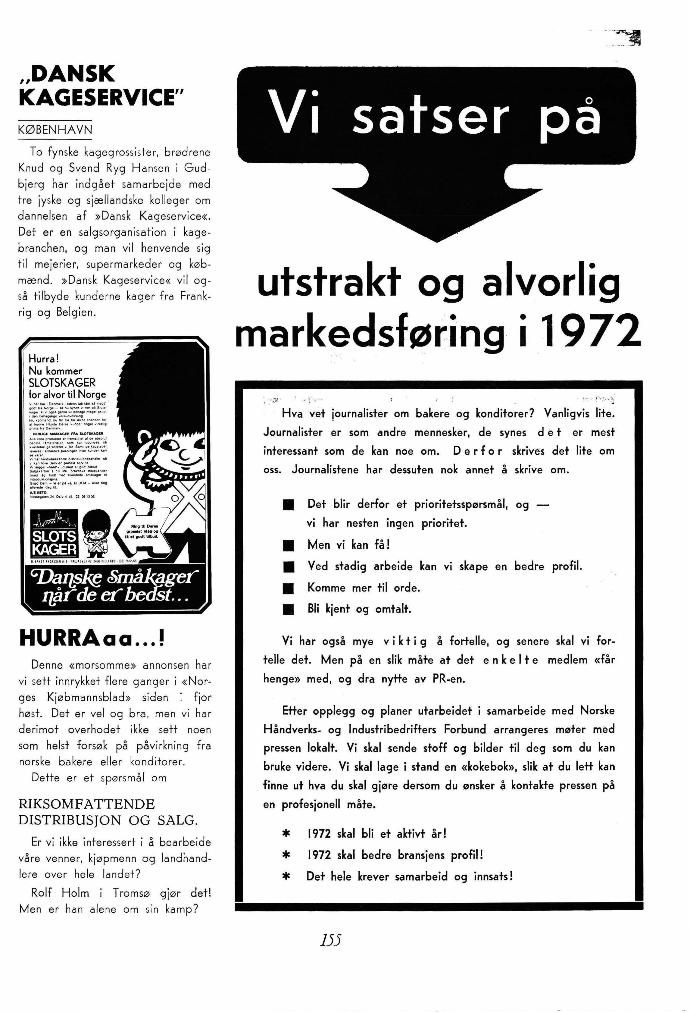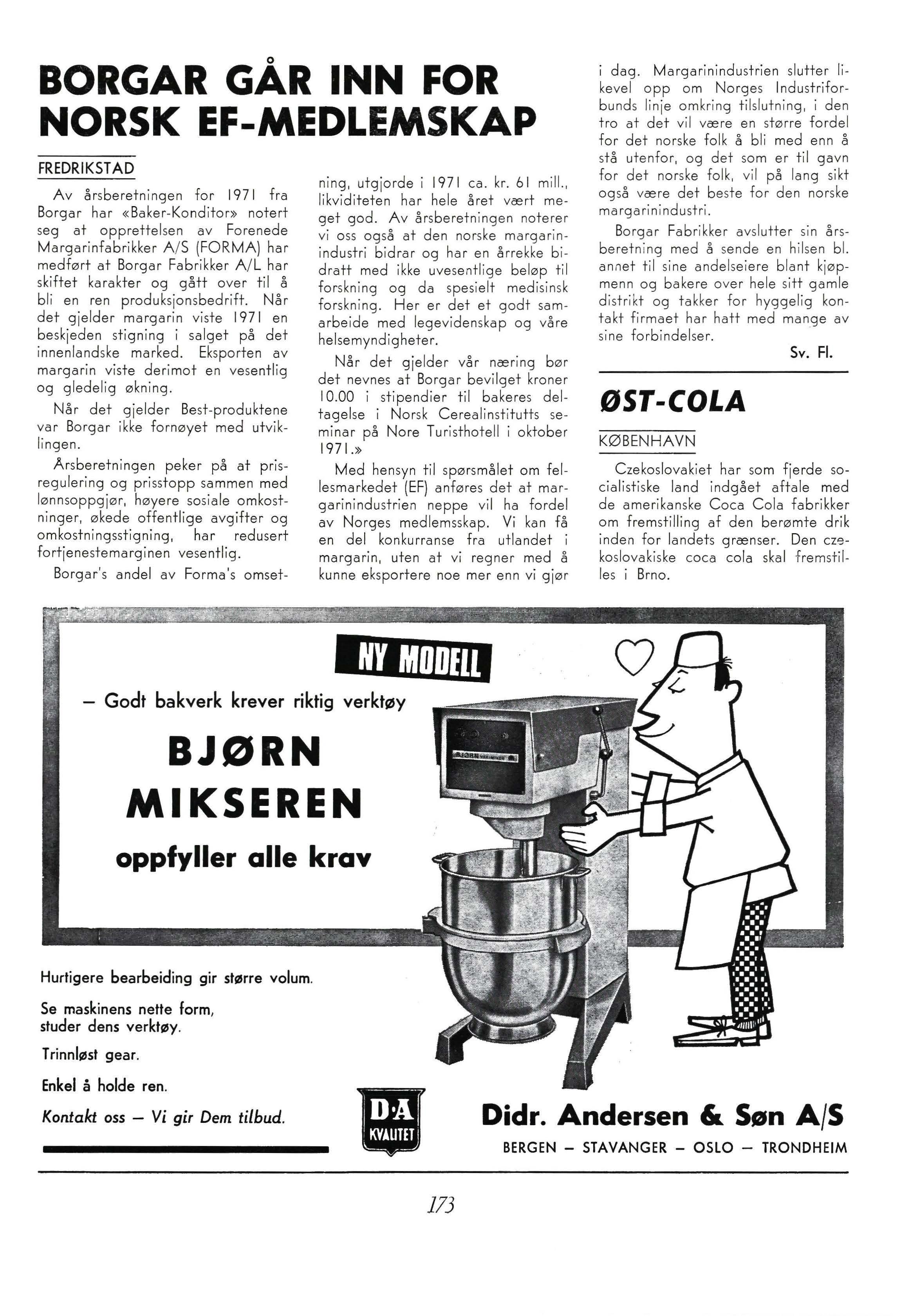 - Bakgrunnen for den nye produksjonen i Arendal er den stadig økende import av utenlandske kaker, opplyser bakermester Kaare Albert jr. Kakeimporten ligger nå totalt på ca. 40 millioner kroner årlig. Flere av landets bakerier synes ikke de bare kunne sitte og se på denne utviklingen, så for to år siden kom noen av oss sammen til et fellesmøte for å drøfte muligheten av å starte en kakefab1·ikk. Aurskog-Høland kommune sa seg villig til å legge forholdene til rette for en slik fabrikk, og man regnet også med å få utbygningsfondet inn i bildet.