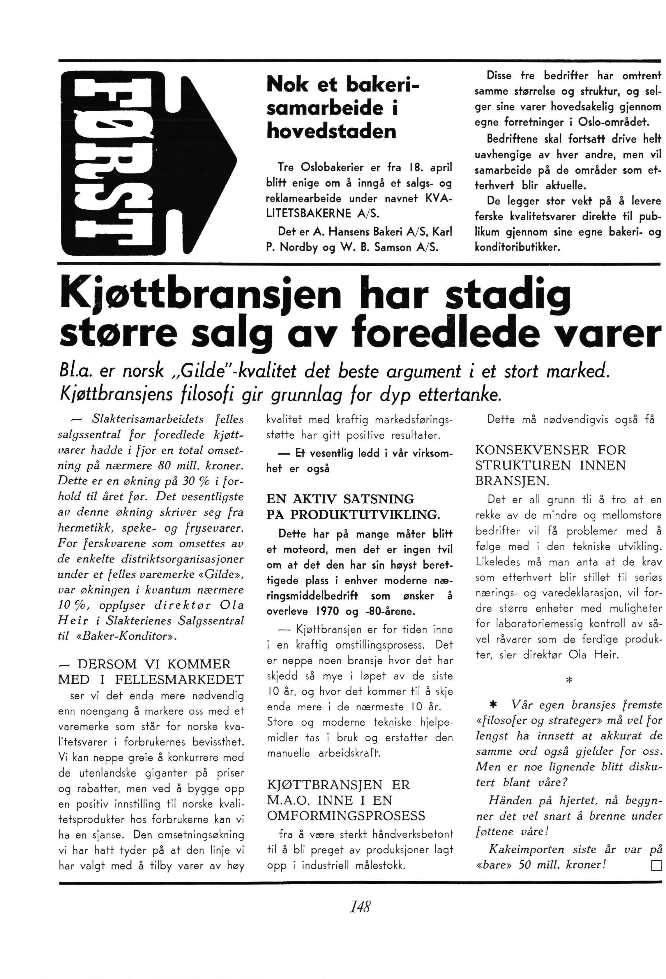 sa lg sse ntral for foredlede kjøttvarer hadde i fjor en total omsetning på n ærmere 80 mill. kroner. Dette er en økning på 30 % i forhold til året før. D et vesent ligste av denne øk ning skriver seg fra hermetikk, speke- og frysevarer. For ferskvarene som omsettes av de enkelte distriktsorganisasjoner under et felles varemerke «Gilde», var økningen i kvantum n ærmere 10 %, opply~er direktør Ola He i r i Slakteriene s Salgssentral ti l « Bak er-Konditor».