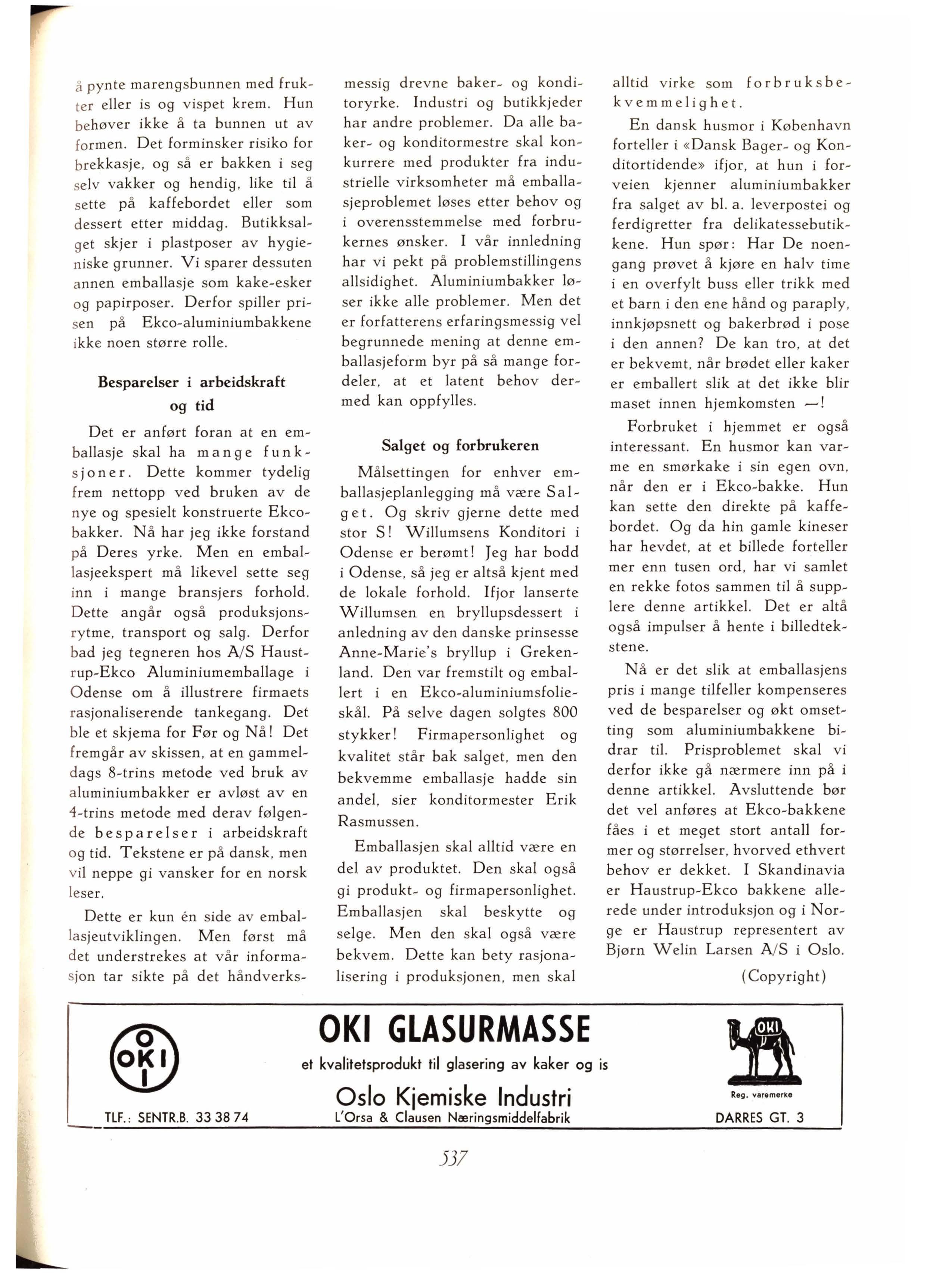Redakt ø ren har væ rt p å utenlandsreise , og stoffet er til en viss grad preget av de inntrykk han har samlet. Dette preger ogs å det faglige stoff vi har tatt med , for interessen utenlan d s samler seg om de samme emner som vi ogs å her hjemme beskj~ftiger o;s med p å det tekniske plan , hurtige deigføringer, emballasjespørsmål , og sist , men ikke minst , den interesse man nu i alle land ofrer på spørsmålet om en god brødaroma Dette siste er en faktor som ikke må neglisjeres, om man skal h a h åp om å stanse det neda d gåen d e b rø d forbruk