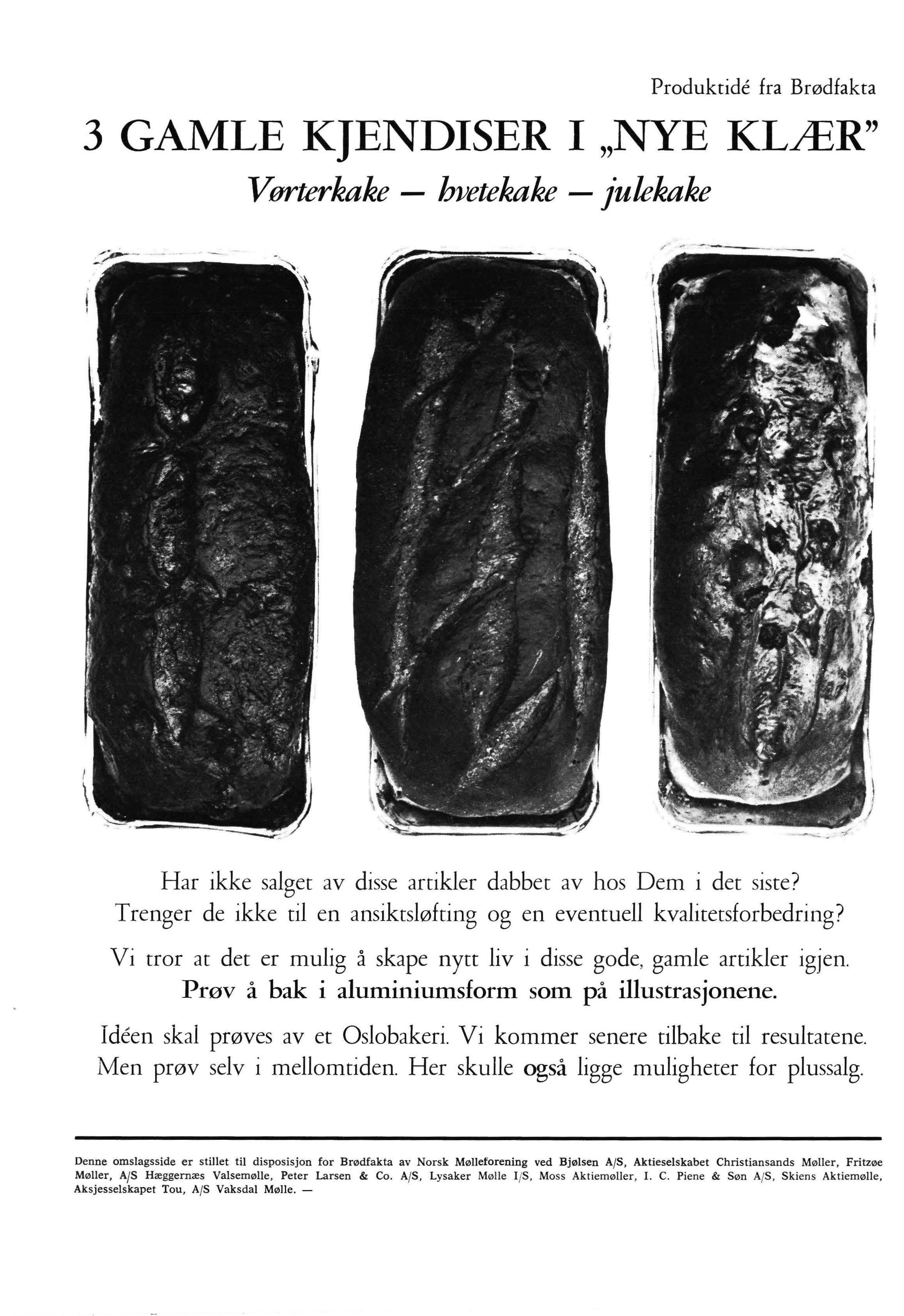 Denne omslagsside er stillet til disposisjon for Brødfakta av Norsk Mølleforening ved Bjølsen A/S , Aktieselskabet Christiansands Møller, Fritzøe Møller , A/ S Hæggernæs Valsemølle, Peter Larsen & Co. A/ S, Lysaker Mølle I /S, Moss Aktiemøller , I. C. Pi ene & Søn A/S , Skiens Aktiemølle, Aksjesselskapet Tou, A/ S Vaksdal Mølle. -