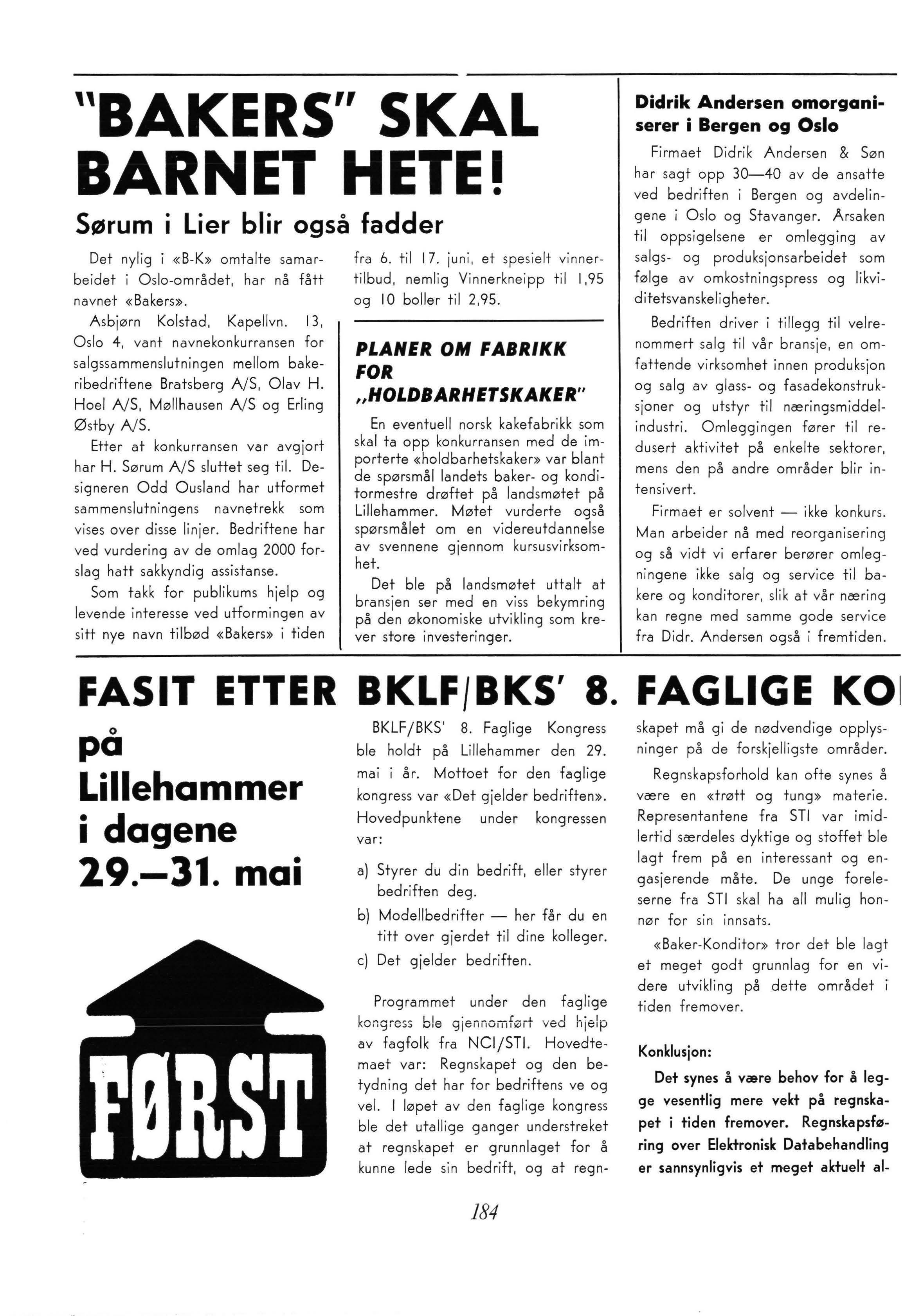 En eventuell norsk kakefabrikk som skal ta opp konkurransen med de importerte «holdbarhetskaker» var blant de spørsmål landets baker- og konditormestre drøftet på landsmøtet på Lillehammer. Møtet vurderte også spørsmålet om en videreutdannelse av svennene gjennom kursusvirksomhet.