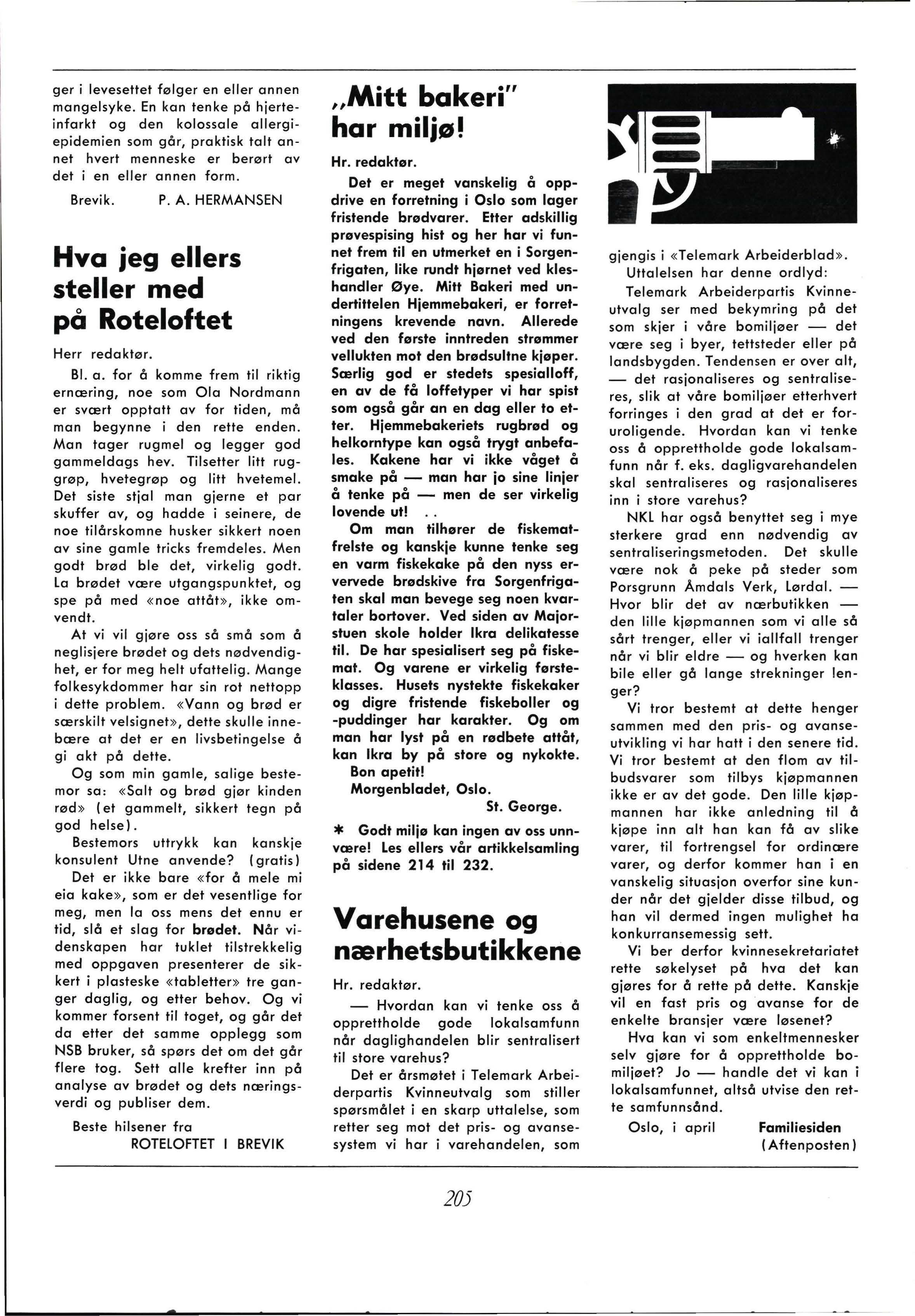 Uttalelsen har denne ordlyd : Telemark Arbeiderpartis Kvinneutvalg ser med bekymring på det som skjer i våre bomiljøer - det være seg i byer, tettsteder eller på landsbygden. Tendensen er over alt, - det rasjonaliseres og sentraliseres, slik at våre bomiljøer etterhvert forringes i den grad at det er foruroligende. Hvordan kan vi tenke oss å opprettholde gode lokalsamfunn når f. eks dagligvarehandelen skal sentraliseres og rasjonaliseres inn i store varehus?