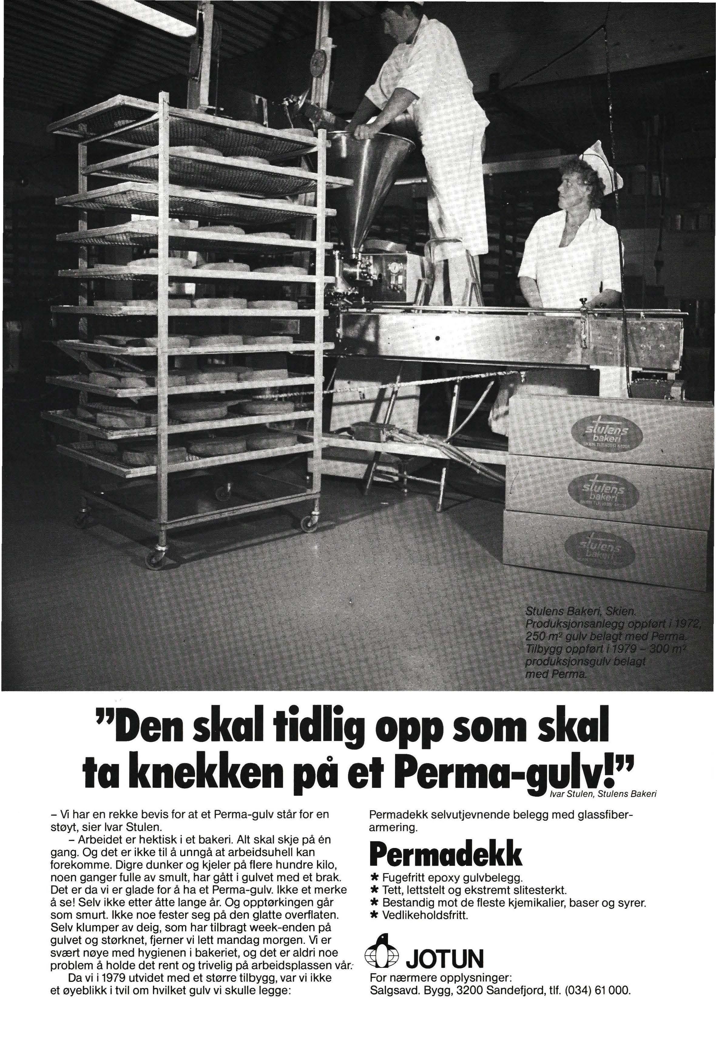 Det er da vi er glade for å ha et Perma-gulv Ikke et merke å se! Selv ikke etter åtte lange år. Og opptørkingen går som smurt Ikke noe fester seg på den glatte overflaten Selv klumper av deig, som har tilbragt week-enden på gulvet og størknet, fjerner vi lett mandag morgen. Vi er svært nøye med hygienen i bakeriet , og det er aldri noe problem å holde det rent og trivelig på arbeidsplassen vår: Da vi i 1979 utvidet med et større tilbygg, var vi ikke et øyeblikk i tvil om hvilket gulv vi skulle legge:
